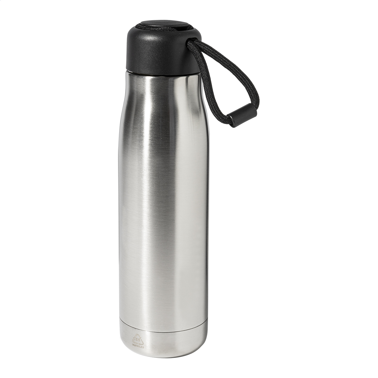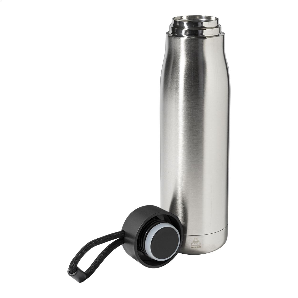 Doppelwandige, vakuumisolierte Trinkflasche aus recyceltem Edelstahl mit Deckel aus PP mit Kordeltrageschleife. Füllmenge: 500 ml.