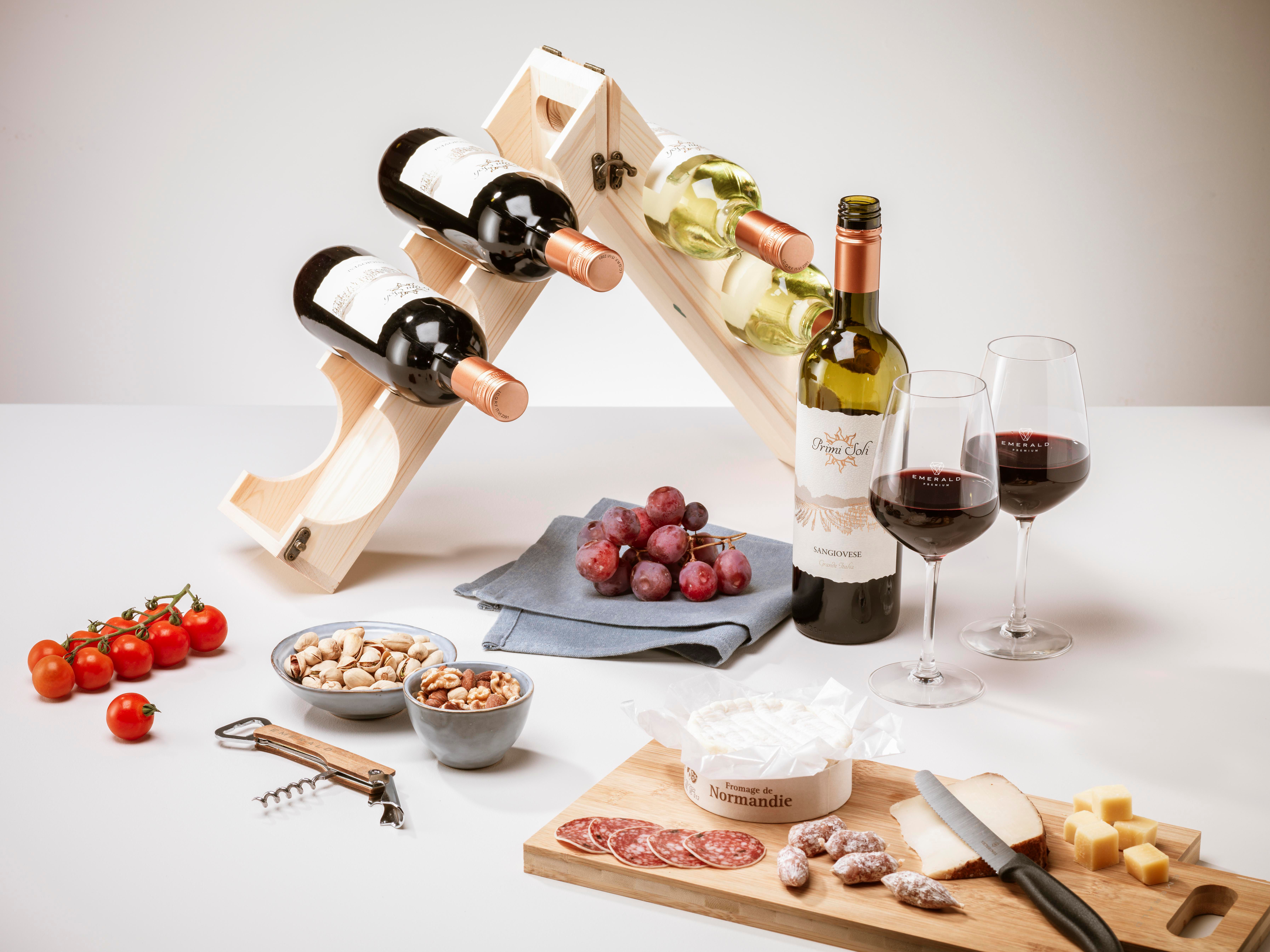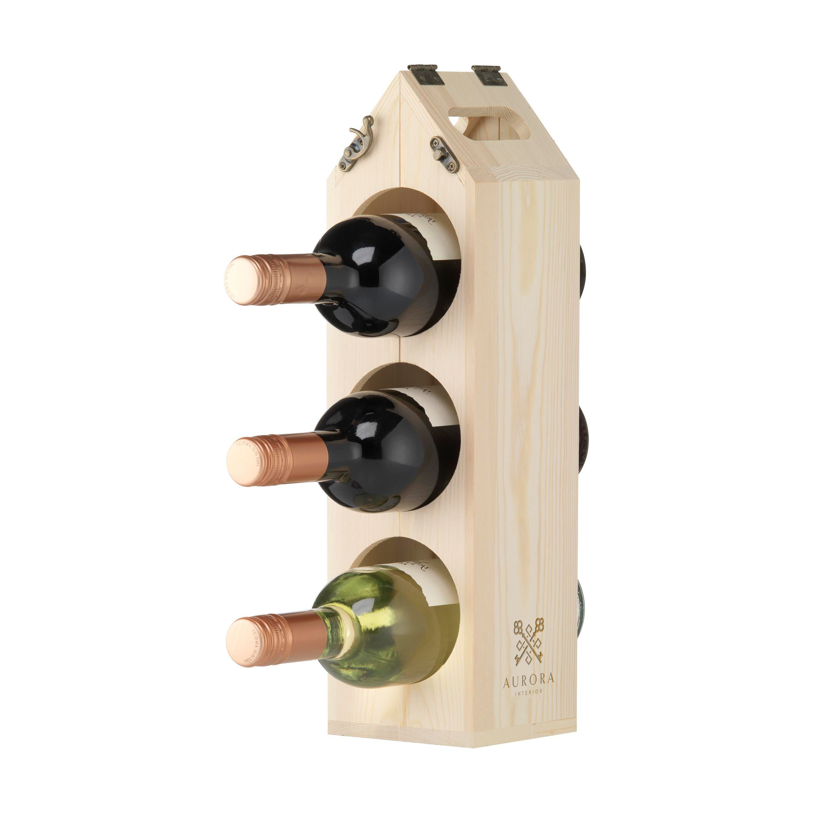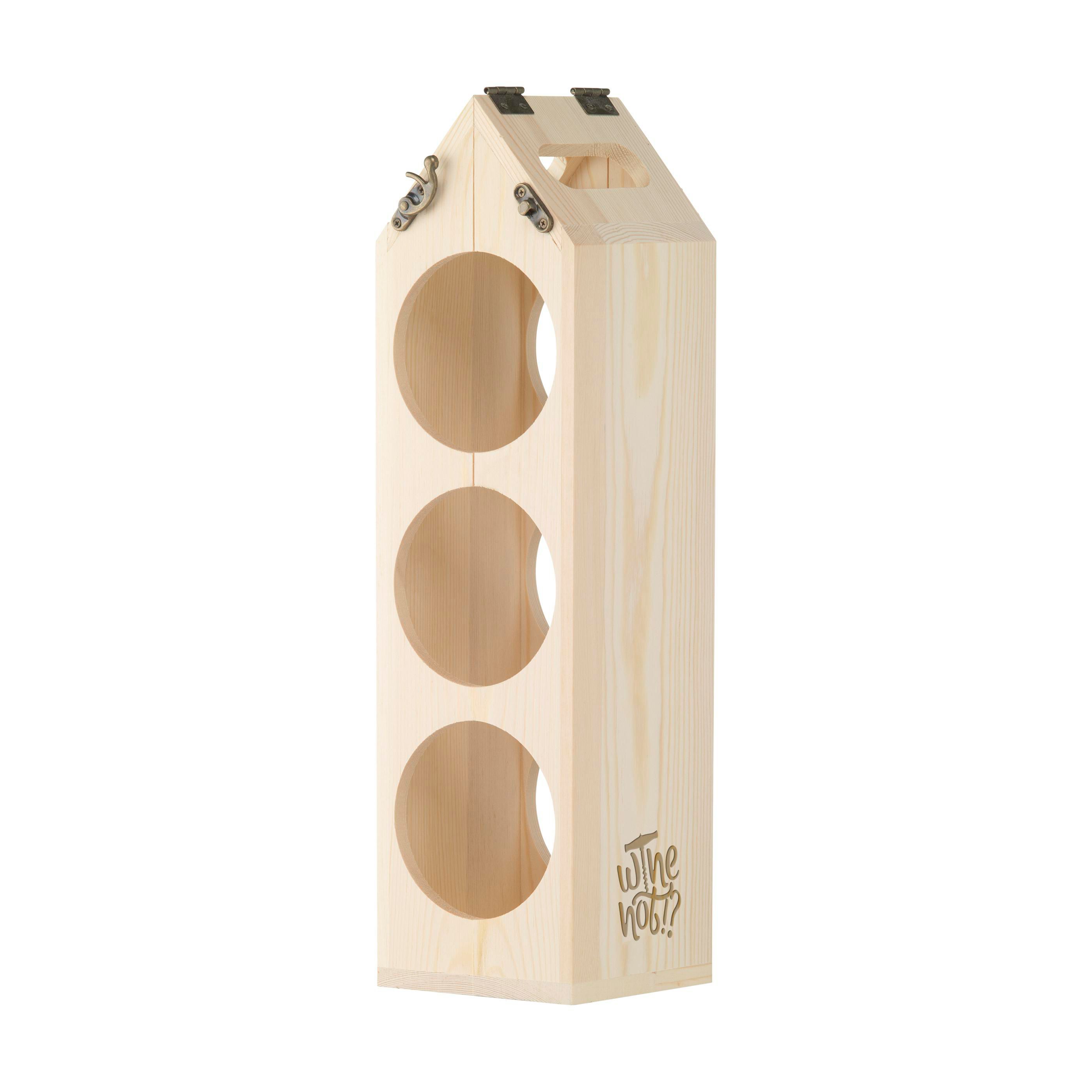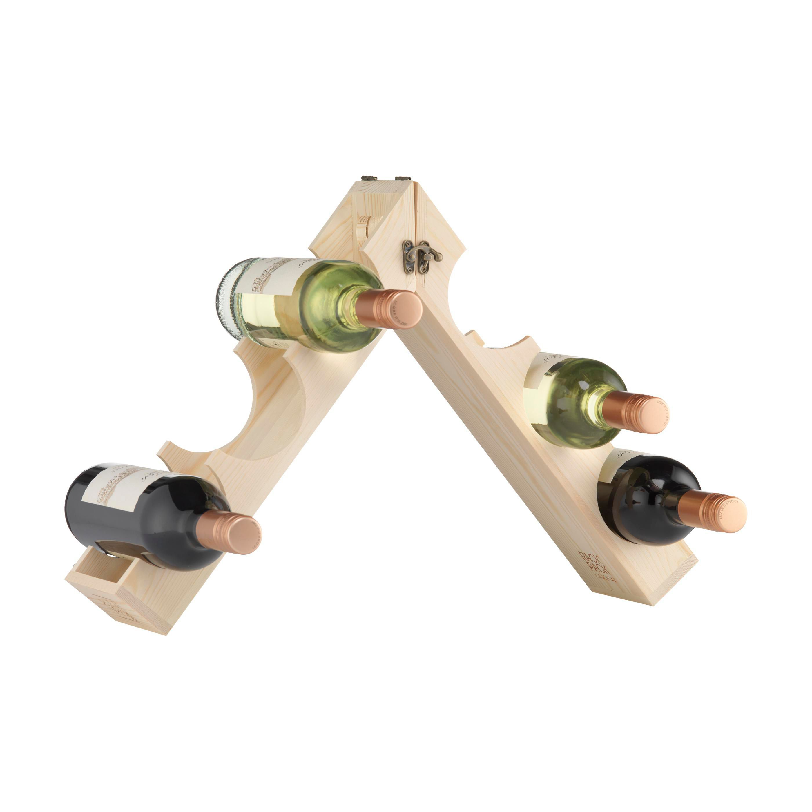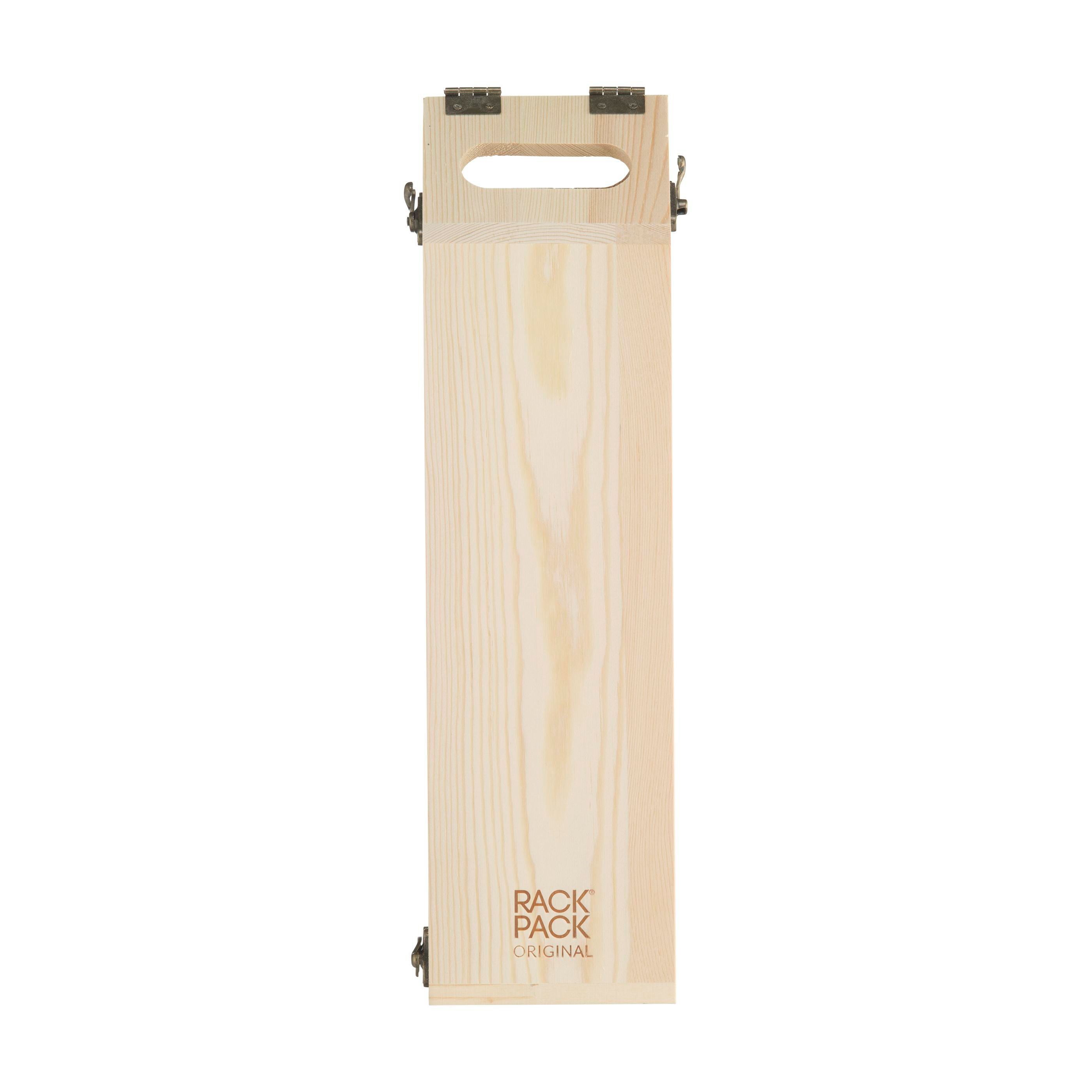 Rackpack Original: Weinkiste und Weinregal in einem. Rackpack ist eine hölzerne Geschenkbox für eine Flasche Wein, die sich in ein Weinlagerregal verwandelt. Mit dem Rackpack hebt sich Ihre Flasche nicht nur von anderen Hostessengeschenken ab, sondern lässt sich auch durch einfaches Drehen an einigen Scharnieren von einem Träger in ein hölzernes Weinregal verwandeln. Es kann auf verschiedene Weise konfiguriert werden, um drei, sechs oder sogar 12 Flaschen Wein zu lagern. Rackpack: eine Wein-Geschenkbox aus FSC 100% zertifiziertes Holz mit einem neuen zweiten Leben! • geeignet für eine Flasche Wein • 8-10 mm FSC 100% zertifiziertes Kiefernholz • Wein nicht inklusive.
