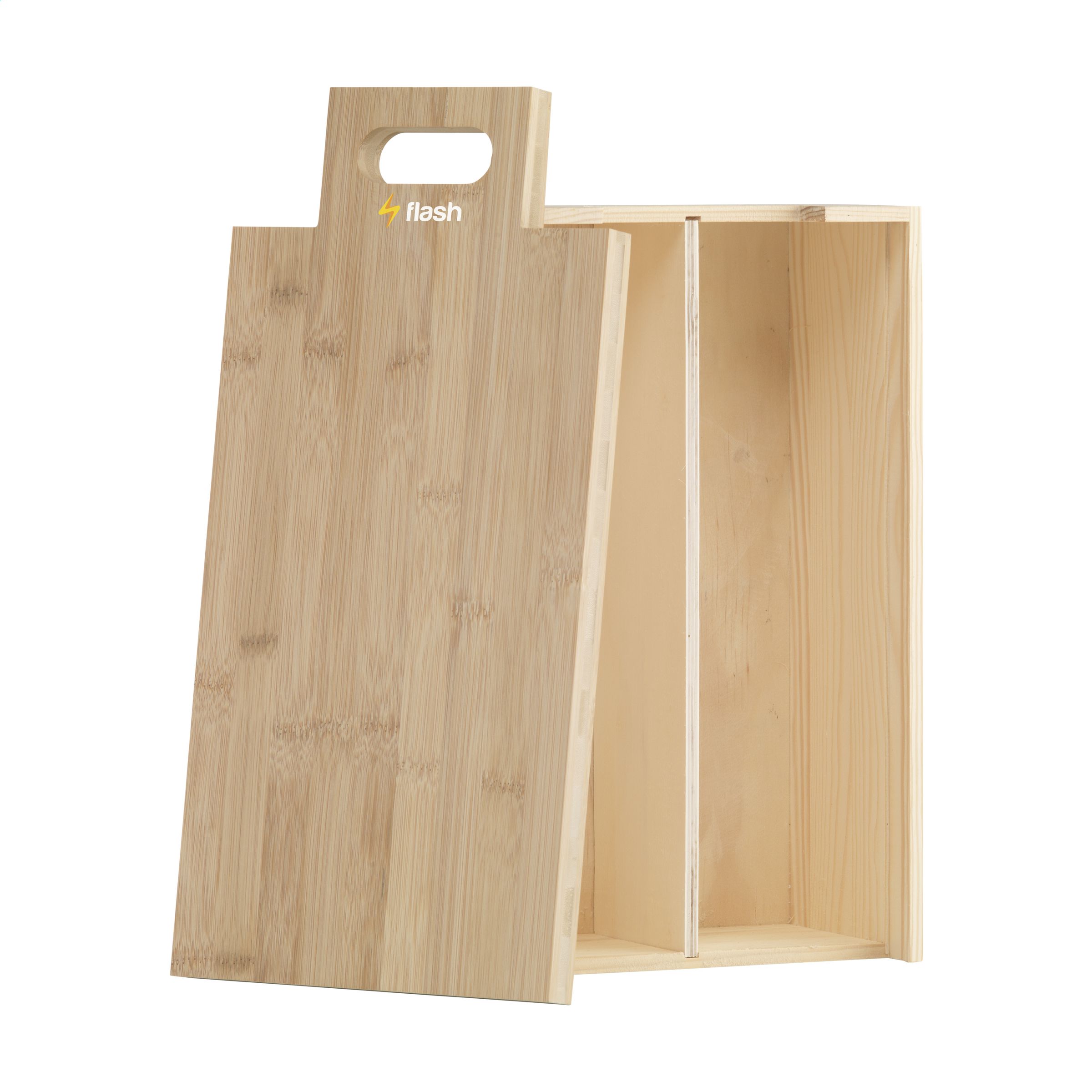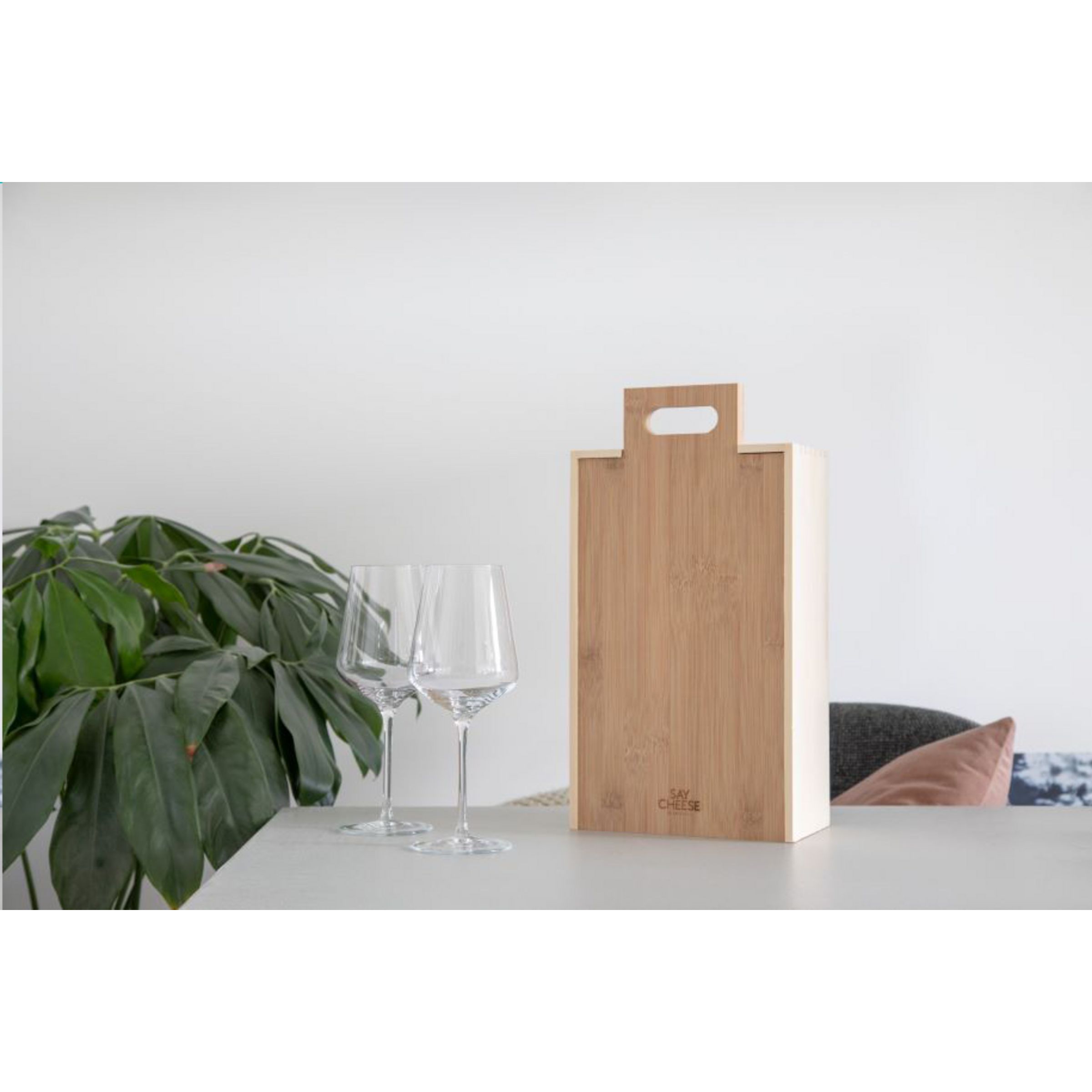 Rackpack Say Cheese: Weinkiste und Käsebrett in einem. Say Cheese ist eine Geschenkbox aus Holz mit zwei Fächern. Eine für eine Flasche Wein und eine für eine Auswahl an französischen Käsesorten. Der Deckel der Box dient auch als Schneidebrett aus Bambus, um den soeben geschenkten Käse zu präsentieren und zu schneiden. Guten Appetit! Rackpack: eine Wein-Geschenkbox aus FSC 100% zertifiziertes Holz mit einem neuen zweiten Leben! • geeignet für eine oder zwei Flaschen Wein • 8-10 mm Kiefernholz • Wein nicht inklusive • Inhalt nicht enthalten. Wird einzeln in einem Kraftkarton geliefert.