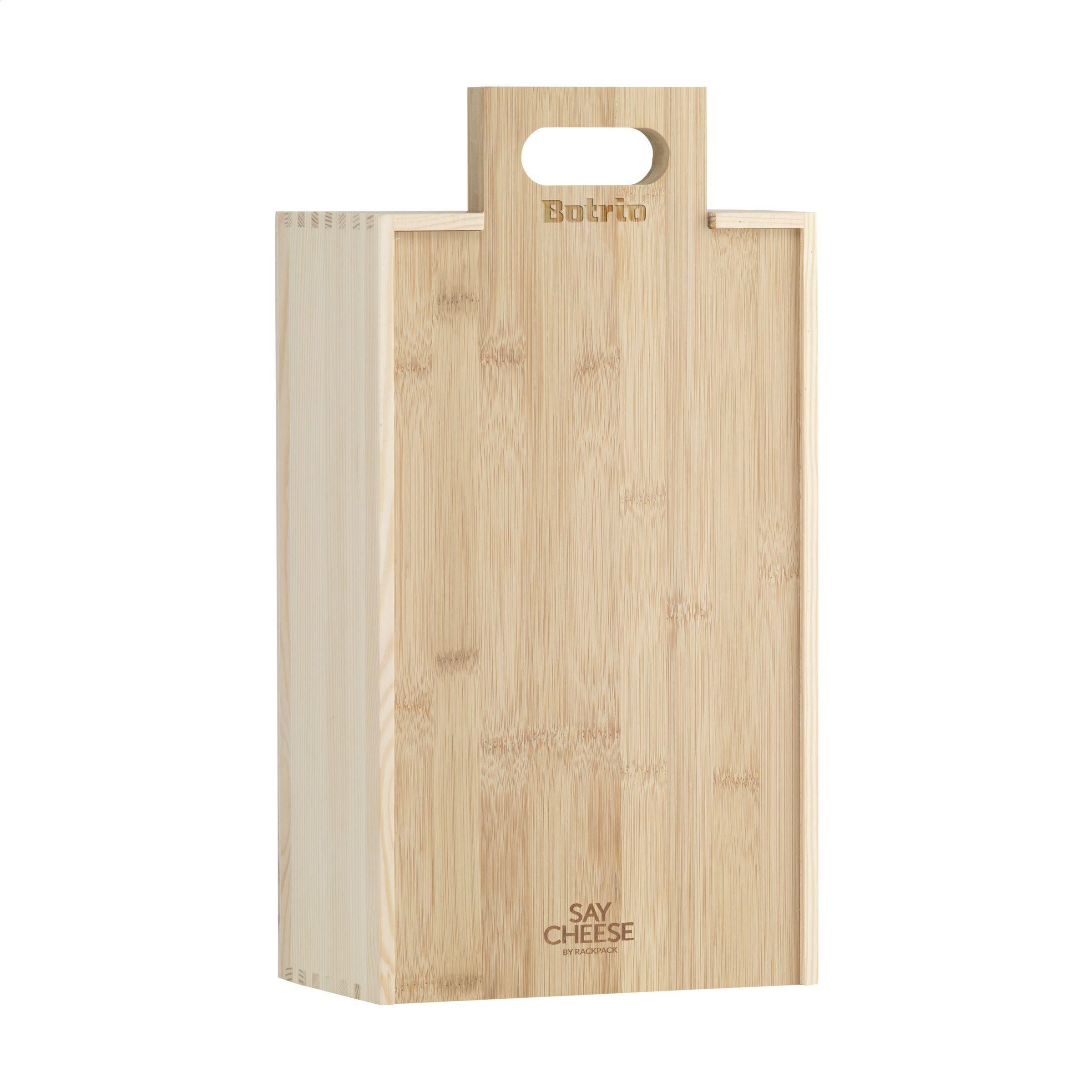 Rackpack Say Cheese: Weinkiste und Käsebrett in einem. Say Cheese ist eine Geschenkbox aus Holz mit zwei Fächern. Eine für eine Flasche Wein und eine für eine Auswahl an französischen Käsesorten. Der Deckel der Box dient auch als Schneidebrett aus Bambus, um den soeben geschenkten Käse zu präsentieren und zu schneiden. Guten Appetit! Rackpack: eine Wein-Geschenkbox aus FSC 100% zertifiziertes Holz mit einem neuen zweiten Leben! • geeignet für eine oder zwei Flaschen Wein • 8-10 mm Kiefernholz • Wein nicht inklusive • Inhalt nicht enthalten.