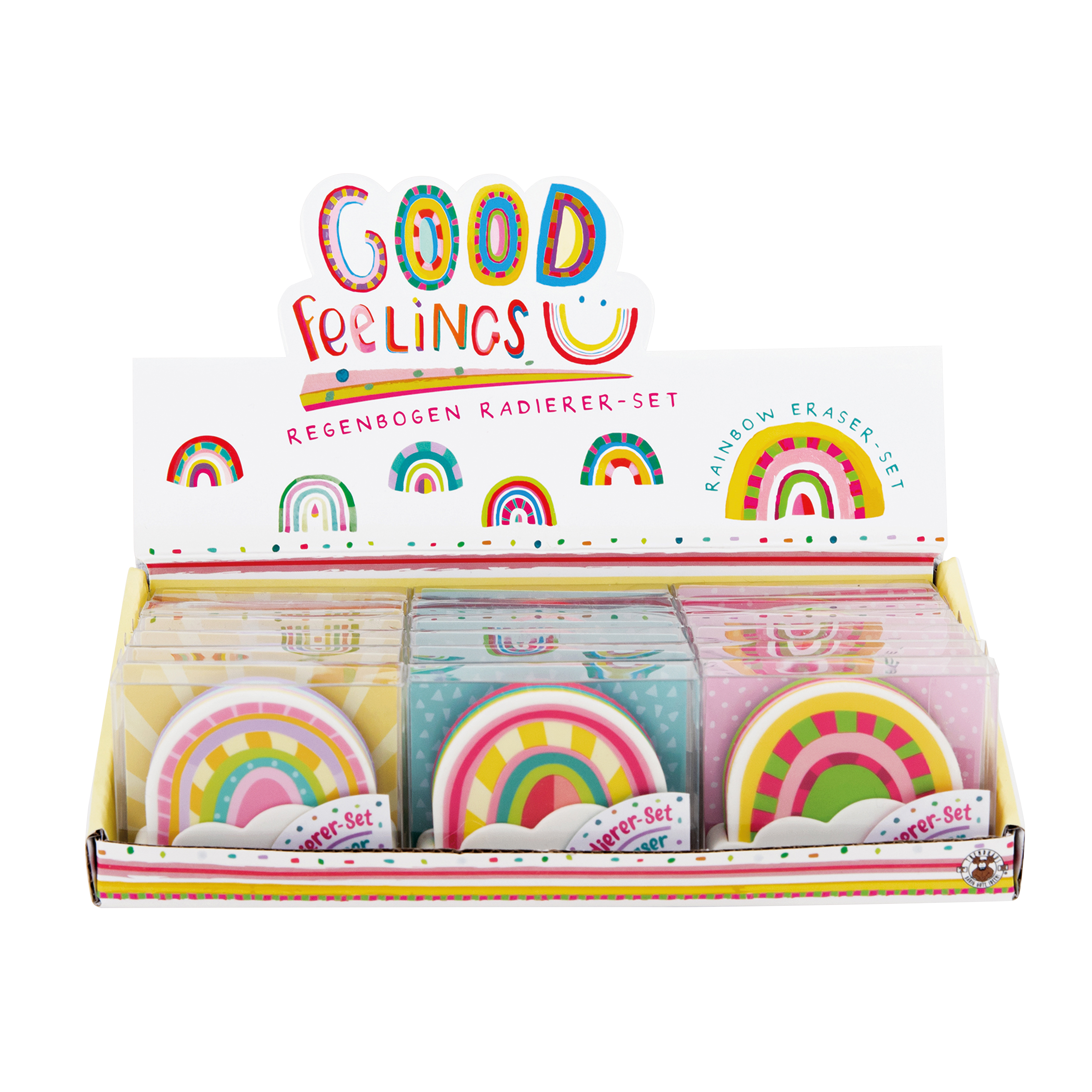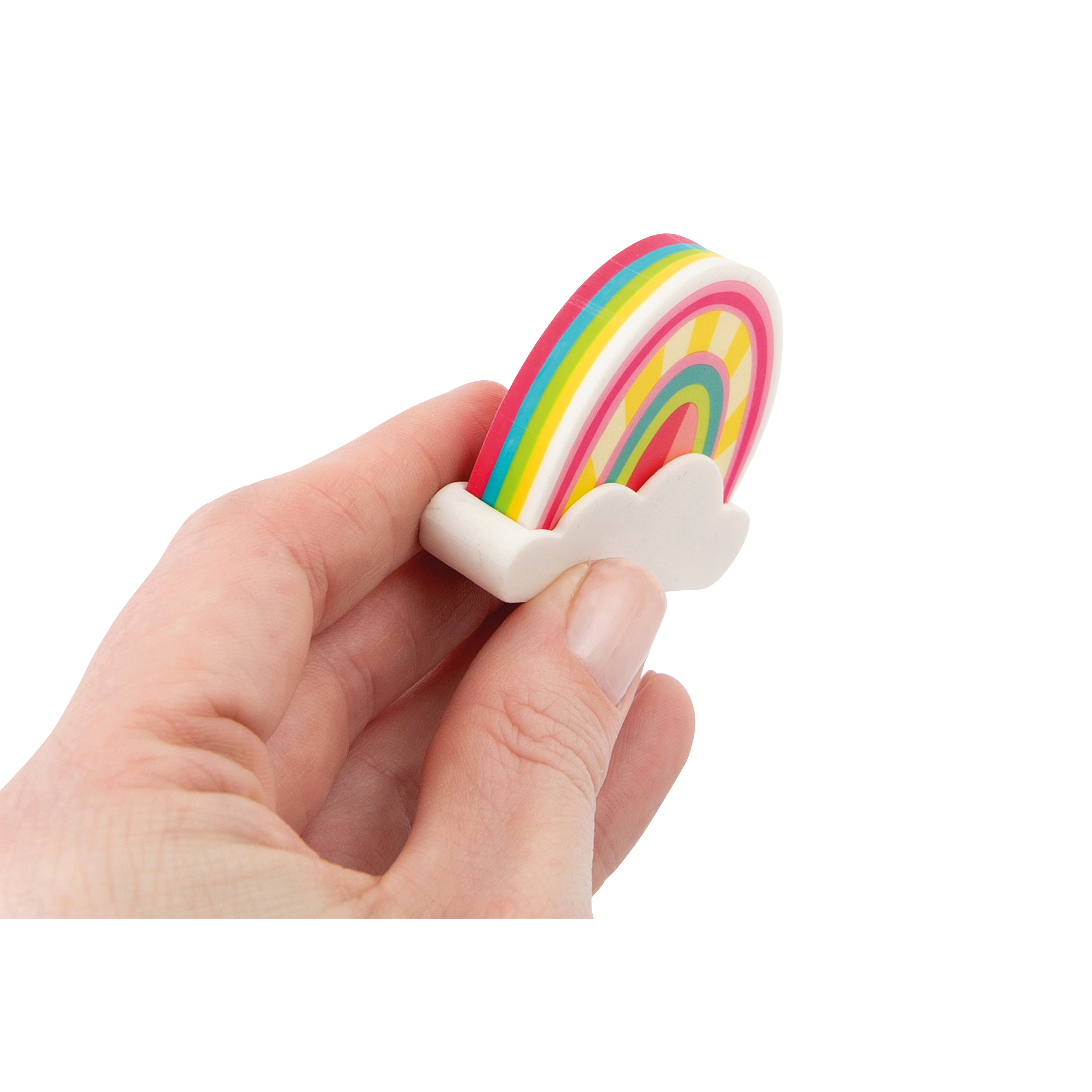 Regenbogenbuntes Radierer-Set für gute Laune, zum Träumen und Radieren. Die Wolke am Fuß des Regenbogens sorgt dafür, dass das Radierer-Set auch als kreative Deko aufgestellt werden kann. Perfekt für Schule, Büro oder als Geschenk. Erhältlich in 3 verschiedenen Farbvarianten.