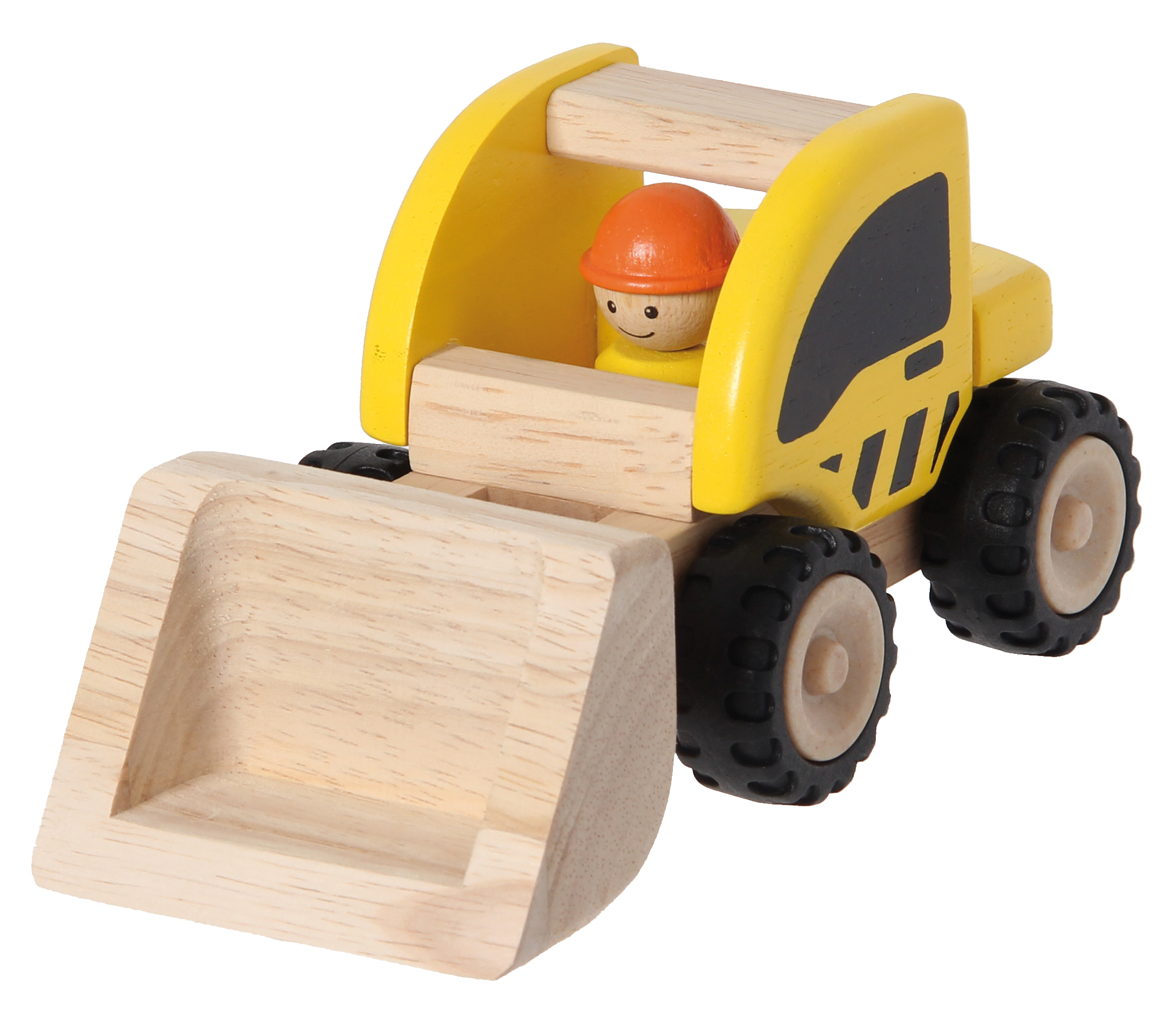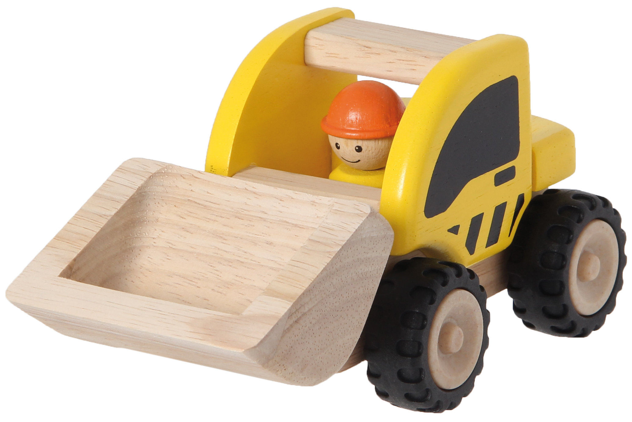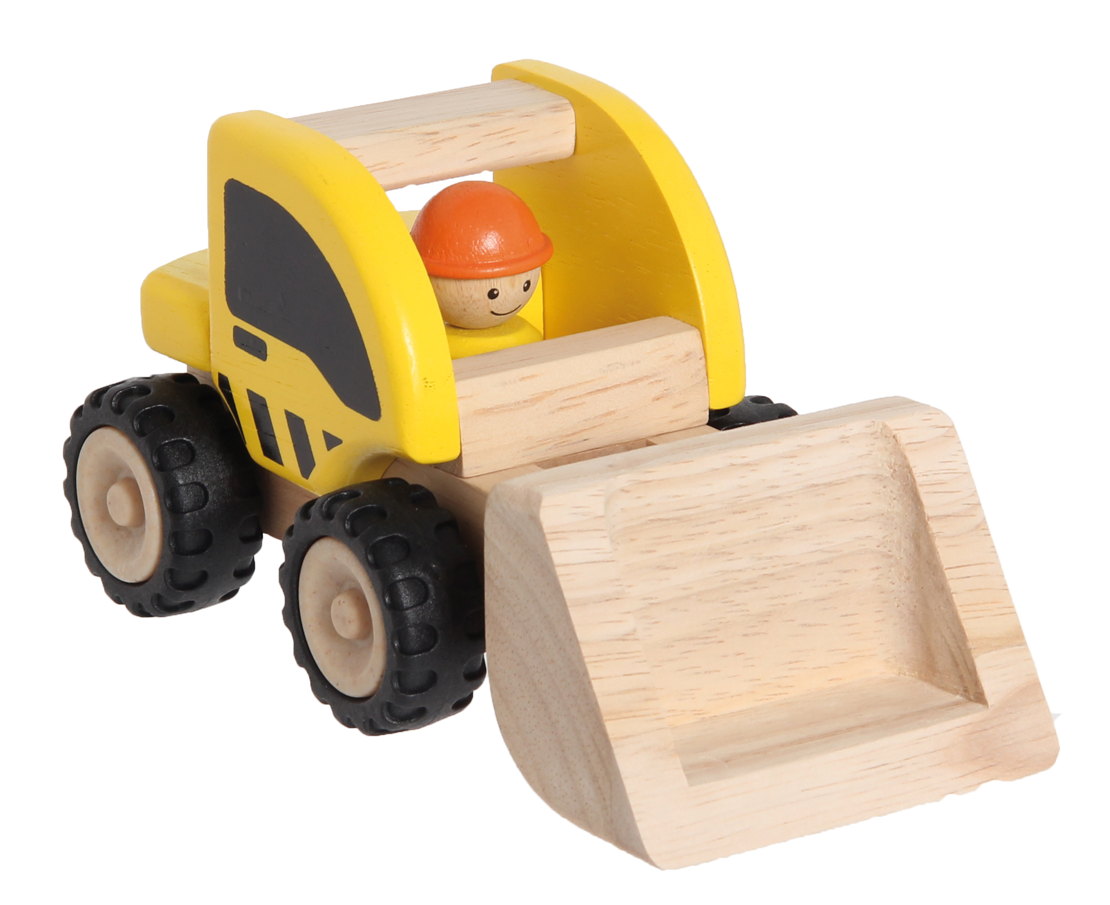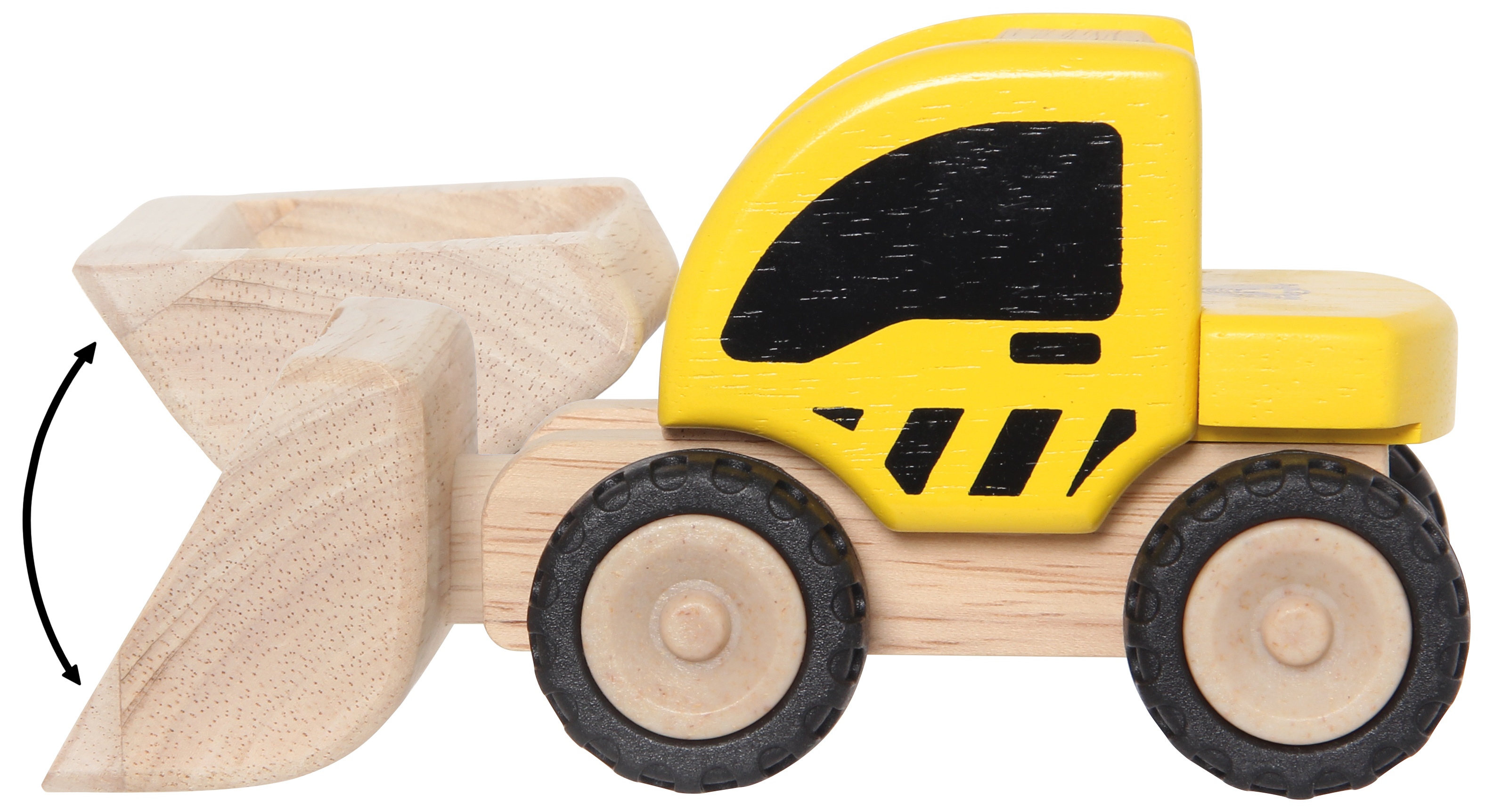 Schiebefahrzeug aus Massivholz mit beweglicher Ladeschaufel.