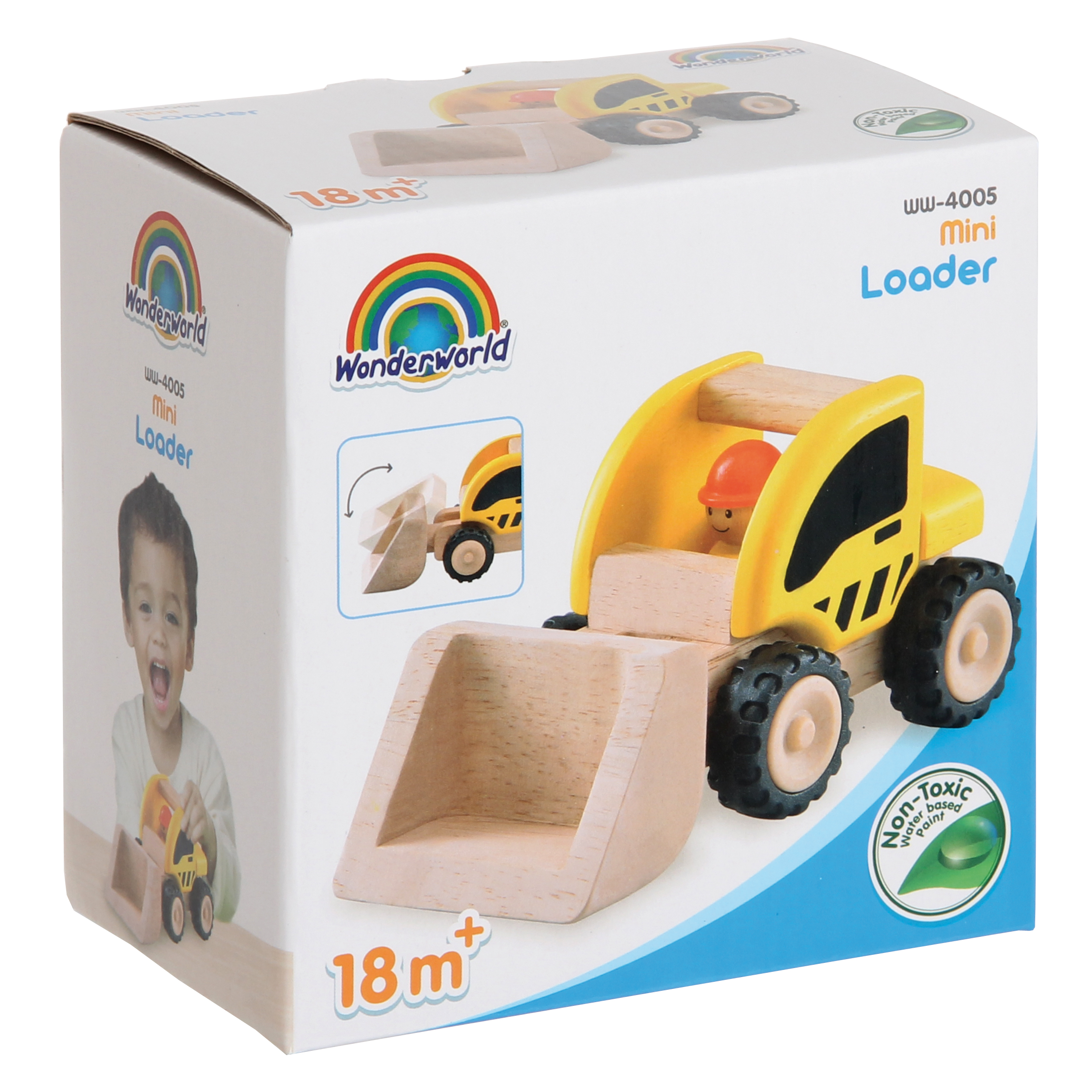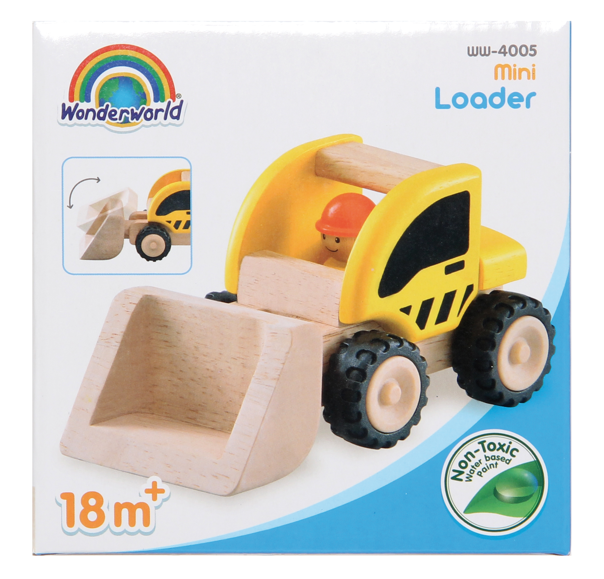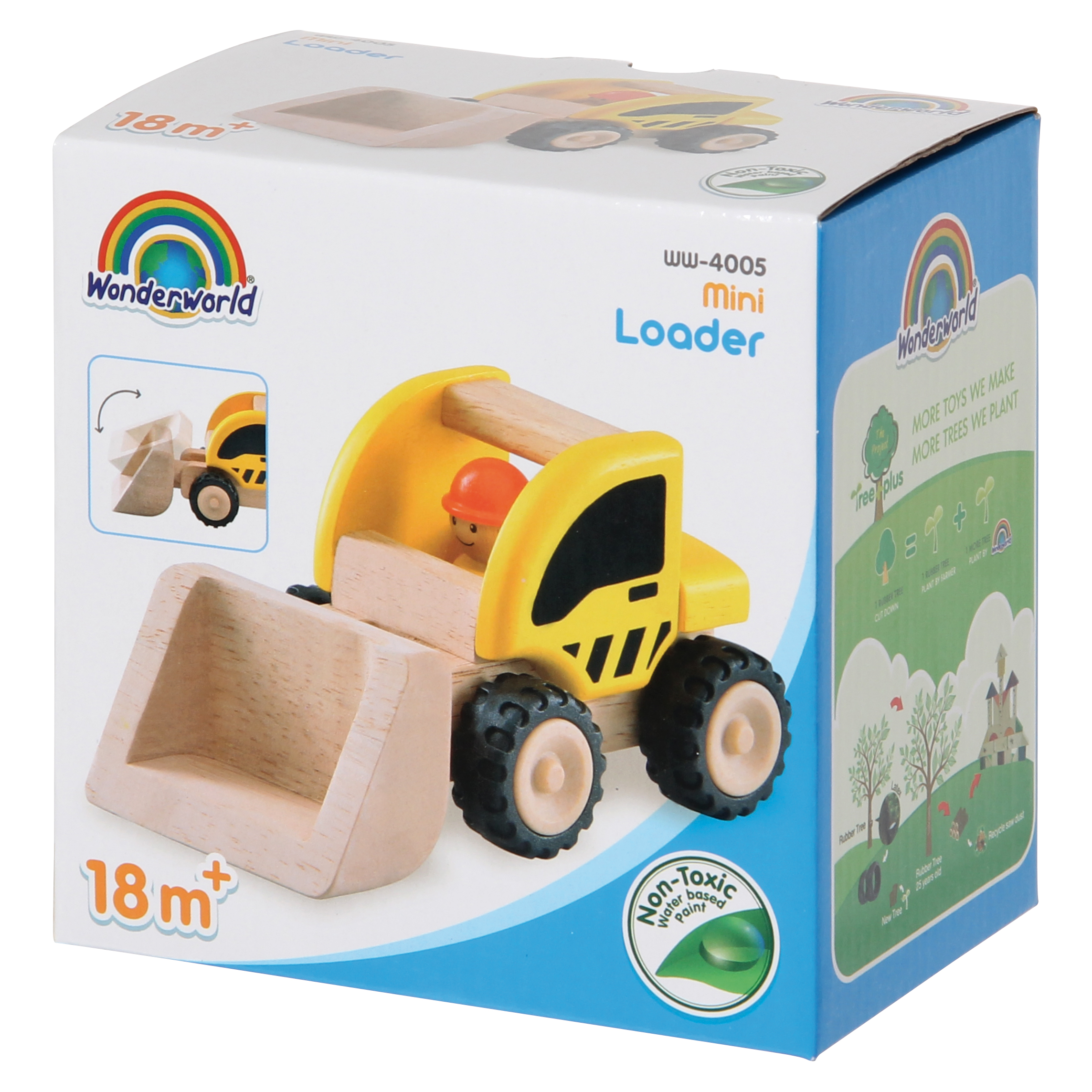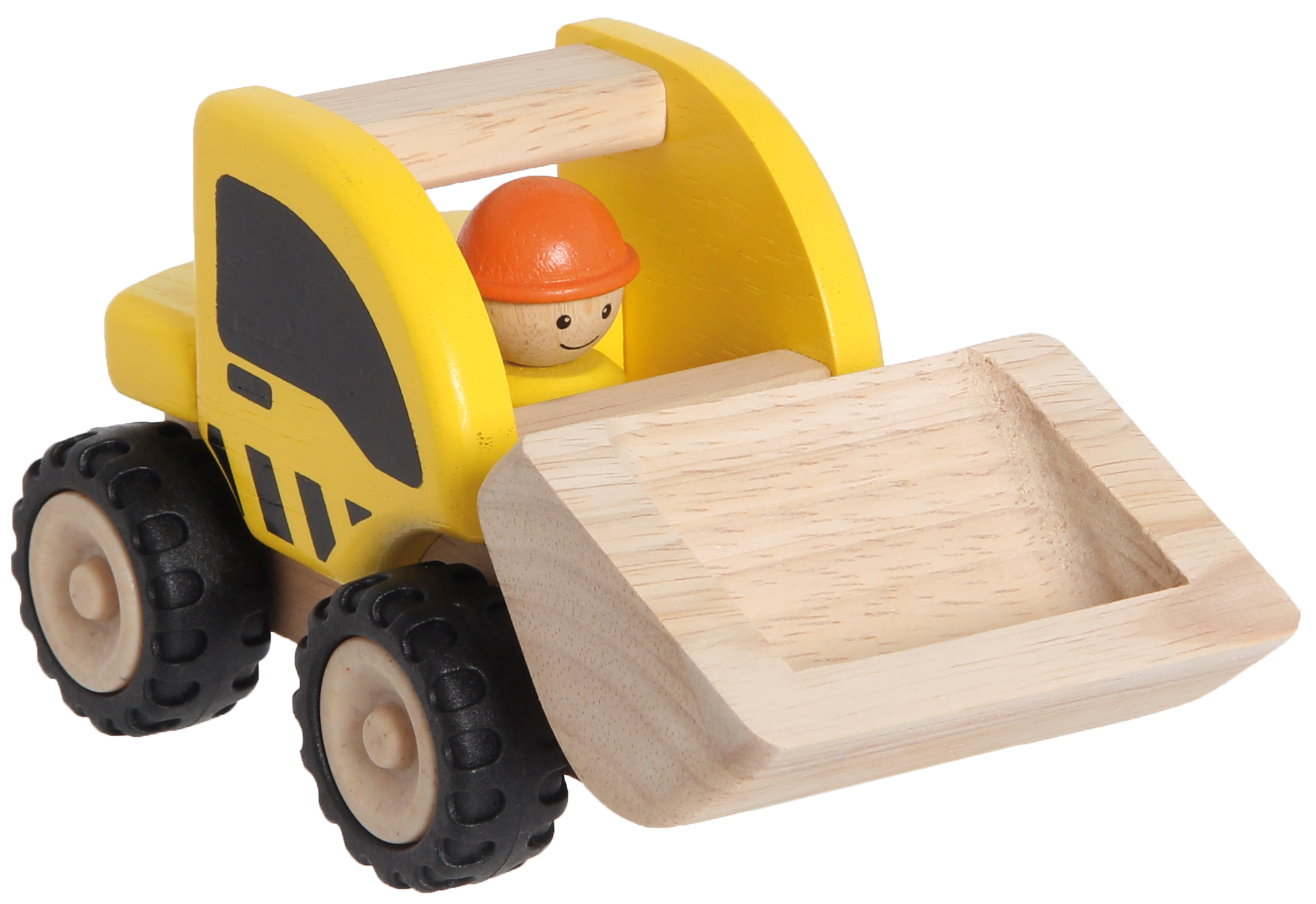 Schiebefahrzeug aus Massivholz mit beweglicher Ladeschaufel.