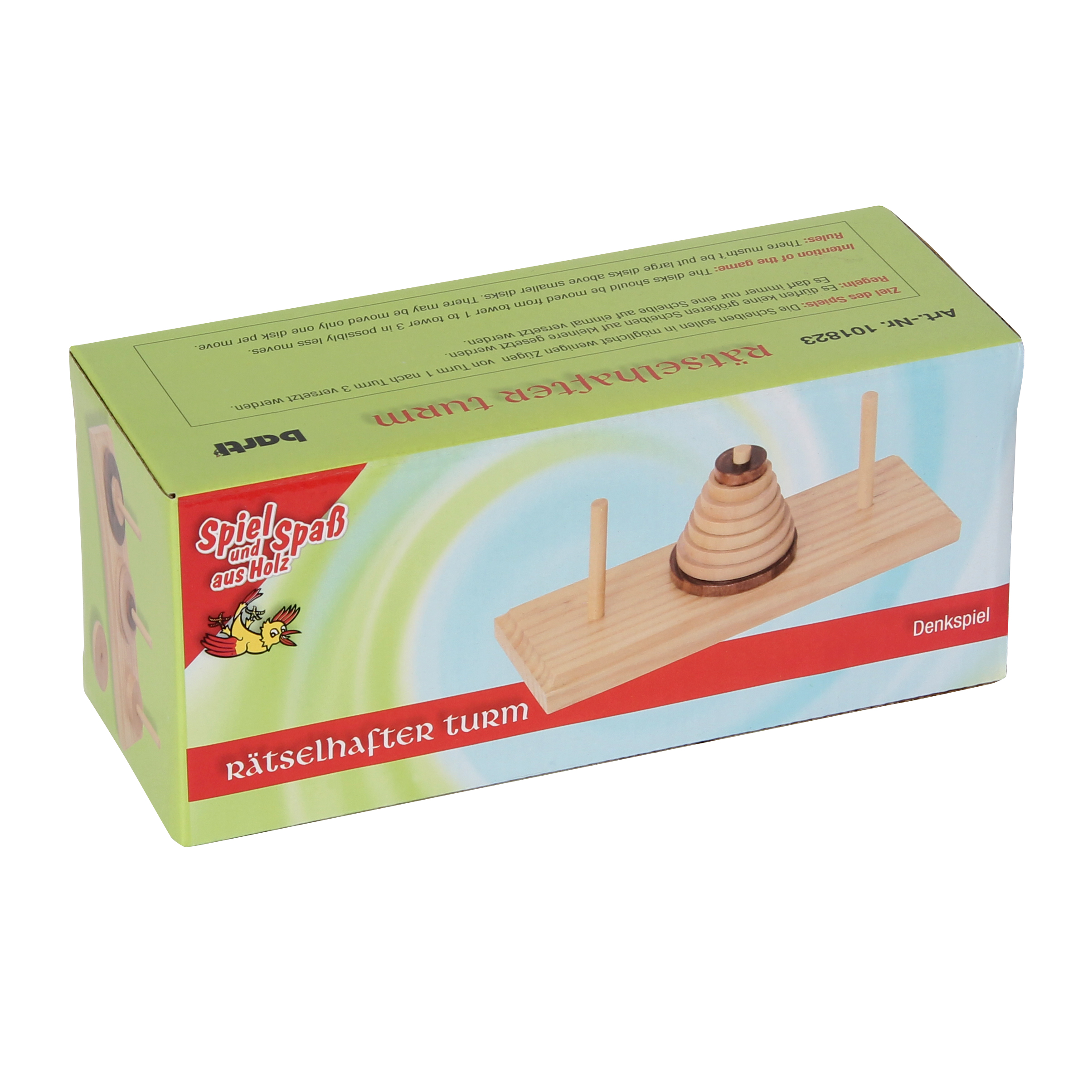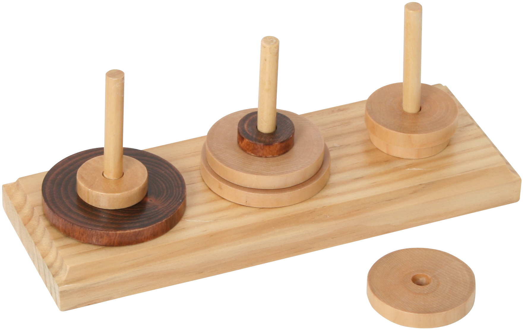 Wer den Turm schnellstmöglich von einem auf ein anderes Stäbchen verlagert, gewinnt. Dabei darf man aber immer nur ein Scheibchen bewegen und es darf auch kein größeres Scheibchen über einem kleineren liegen.