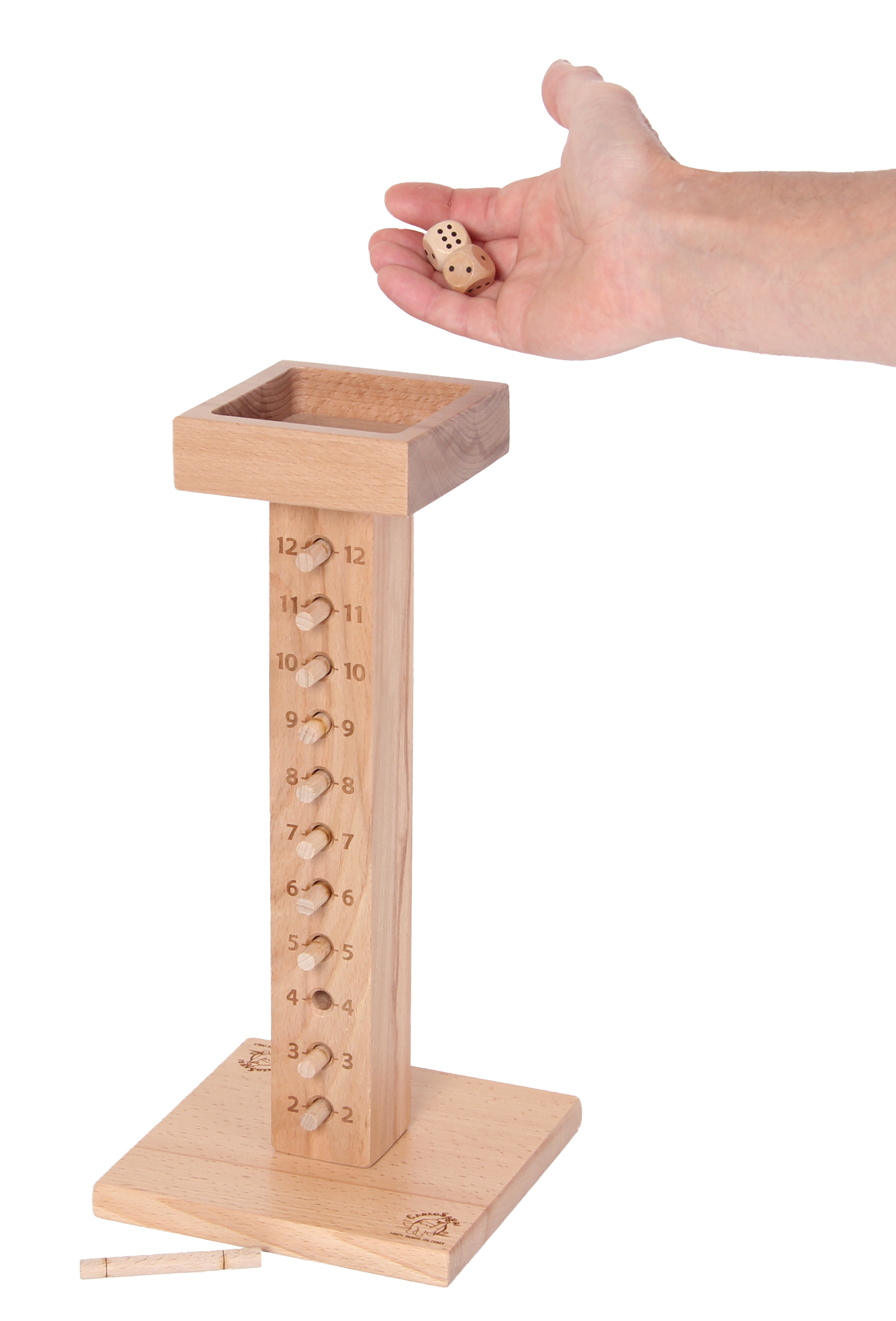 Schnell Rechnen und schnell reagieren ist gefragt! Abwechselnd wird mit den beiden Würfeln geworfen, die Mitspieler summieren im Kopf die Augenzahlen und wer als erster den passenden Holzstab heraus zieht hat die Runde gewonnen. Für 2 Spieler. Gefertigt in Italien aus Buchenholz.