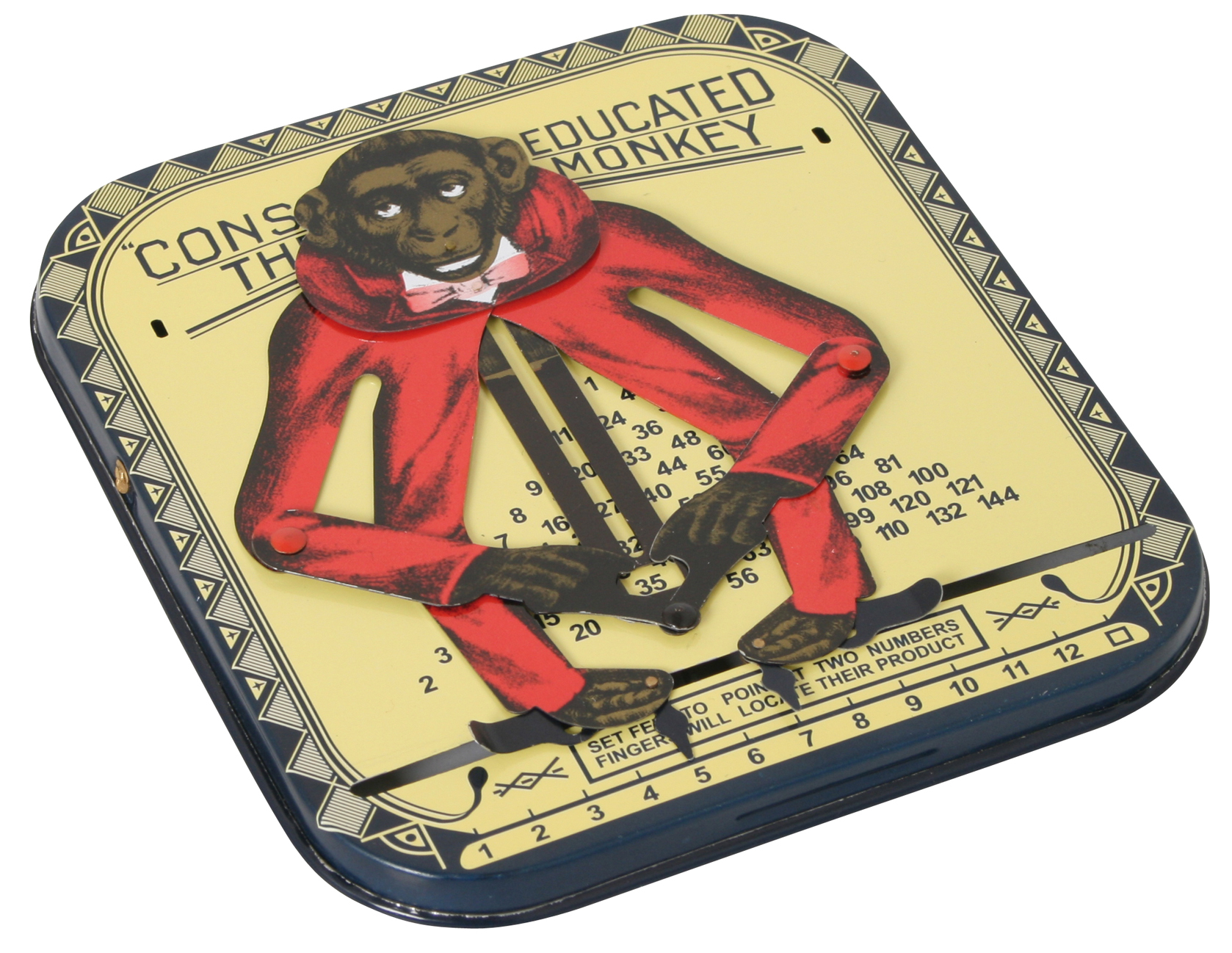 Origineller Sammler- und Nostalgieartikel aus Blech mit verblüffender Funktion: Der Affe kann multiplizieren und quadrieren. So geht's: Schiebt man die Füße des Affen auf zwei Zahlen, zeigen seine Hände das Ergebnis an.