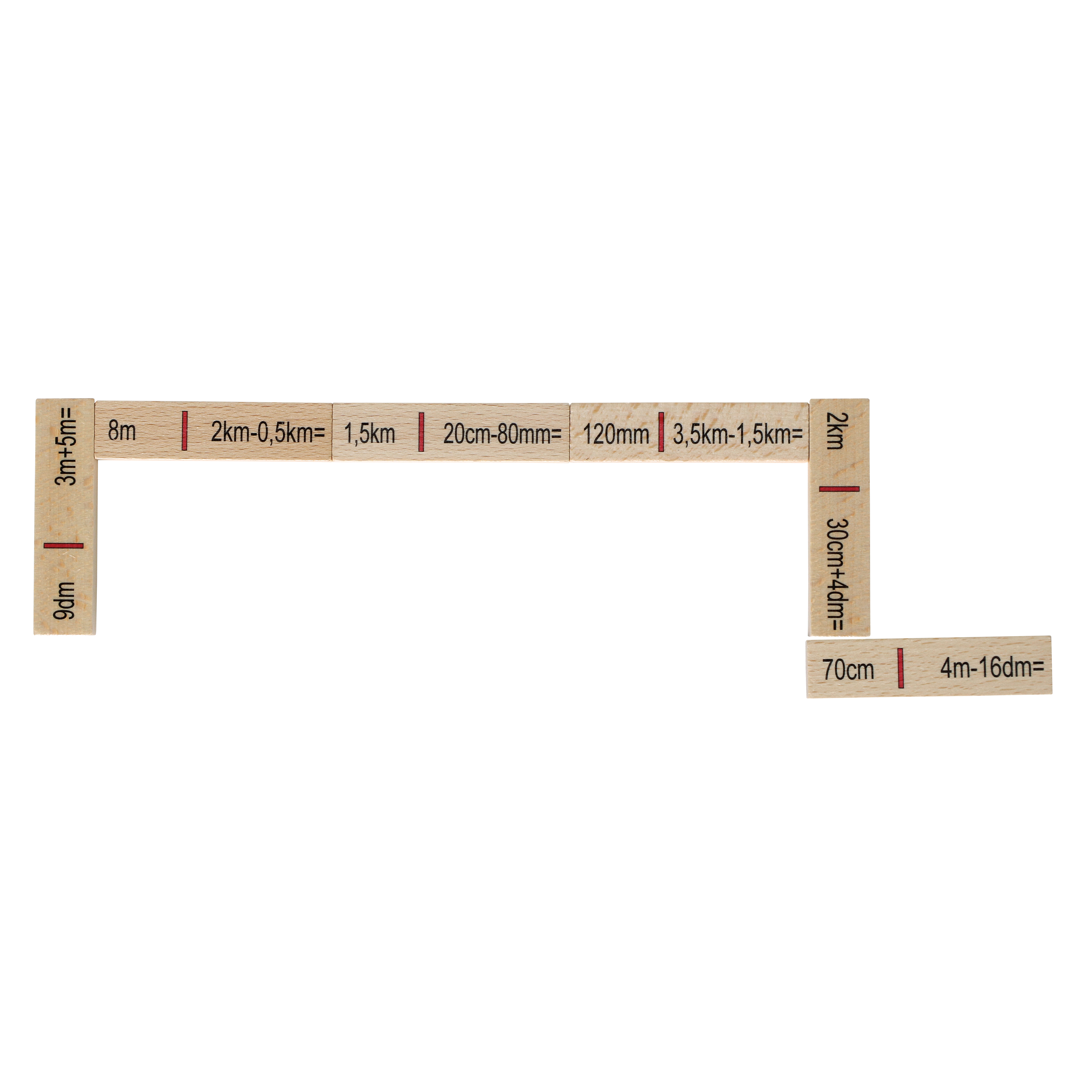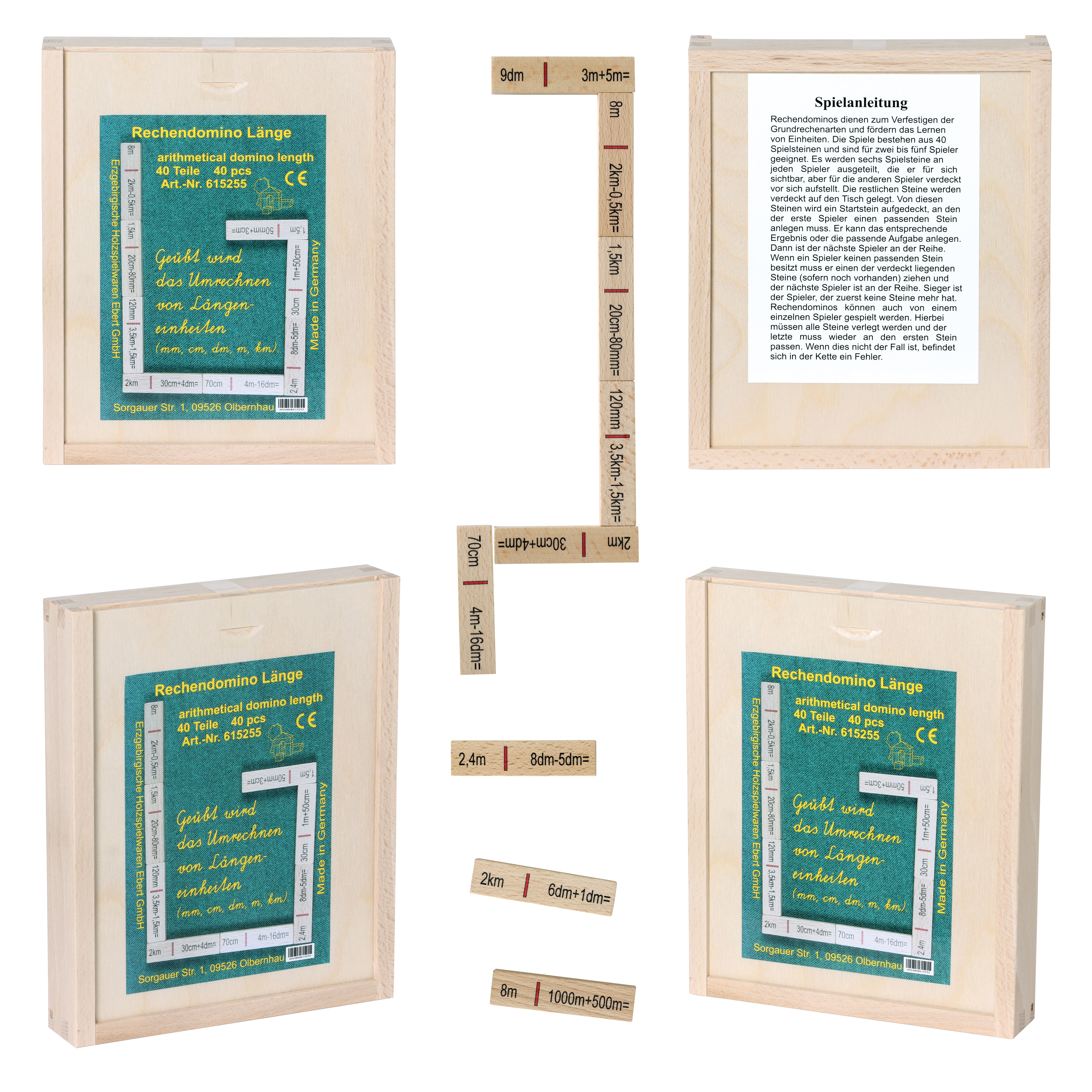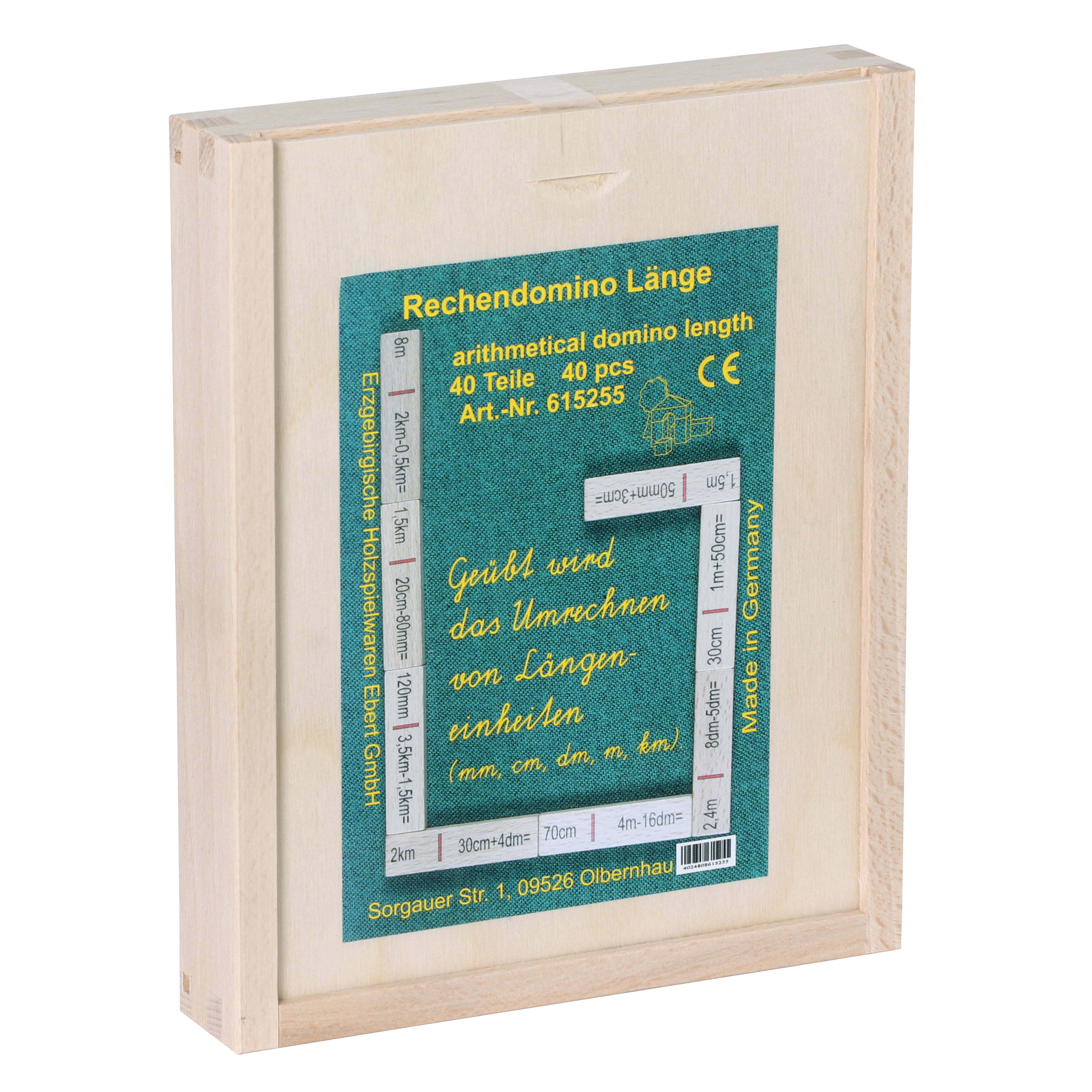 Mit dem Rechendomino trainiert das Kind ab 6 Jahren die Grundrechenarten Addition und Subtraktion mit Längen. Das Set besteht aus 40 Holz-Spielsteinen in einer praktischen Holzbox mit Schiebedeckel. Spielsteingröße: 7 x 1,7 cm. Hergestellt in Deutschland.