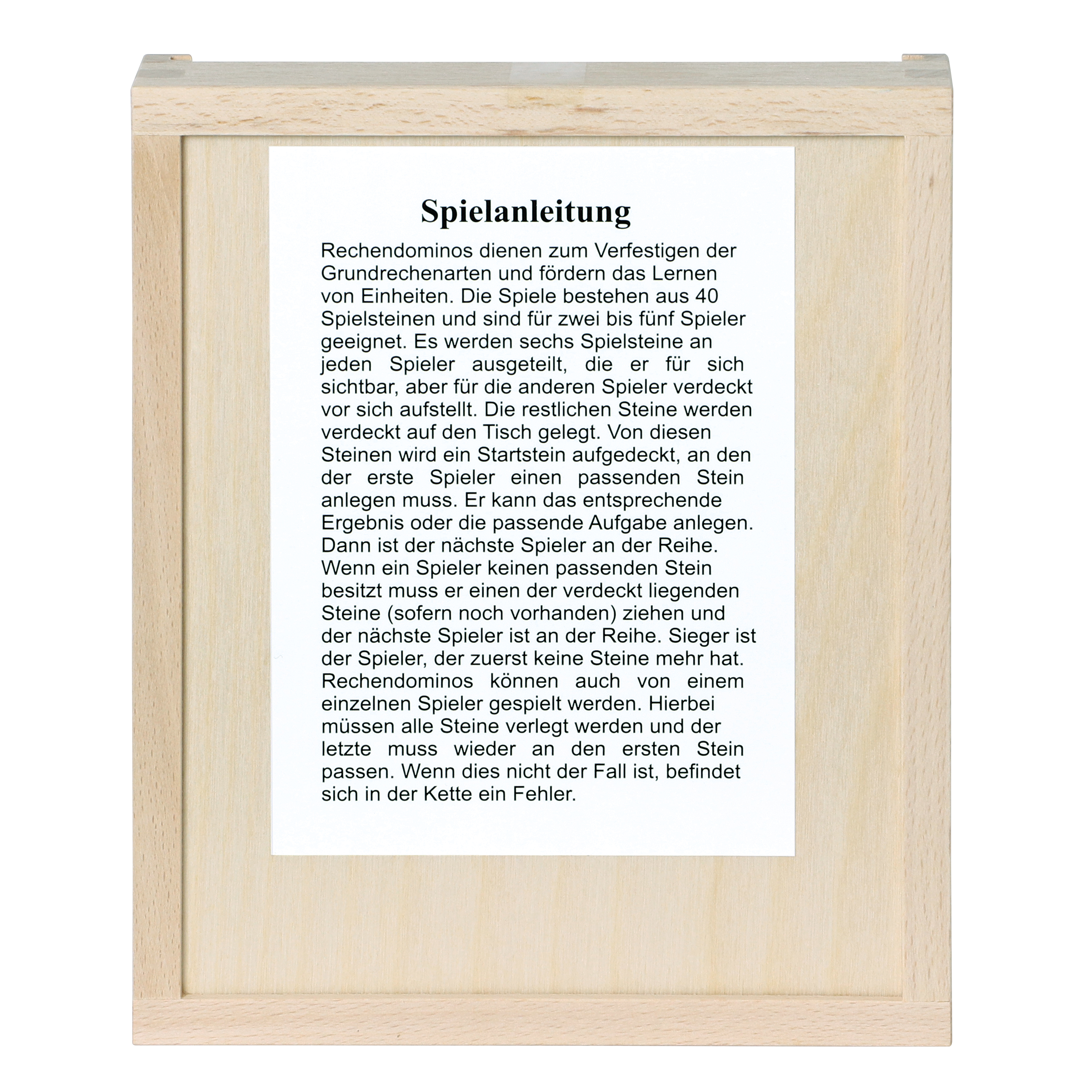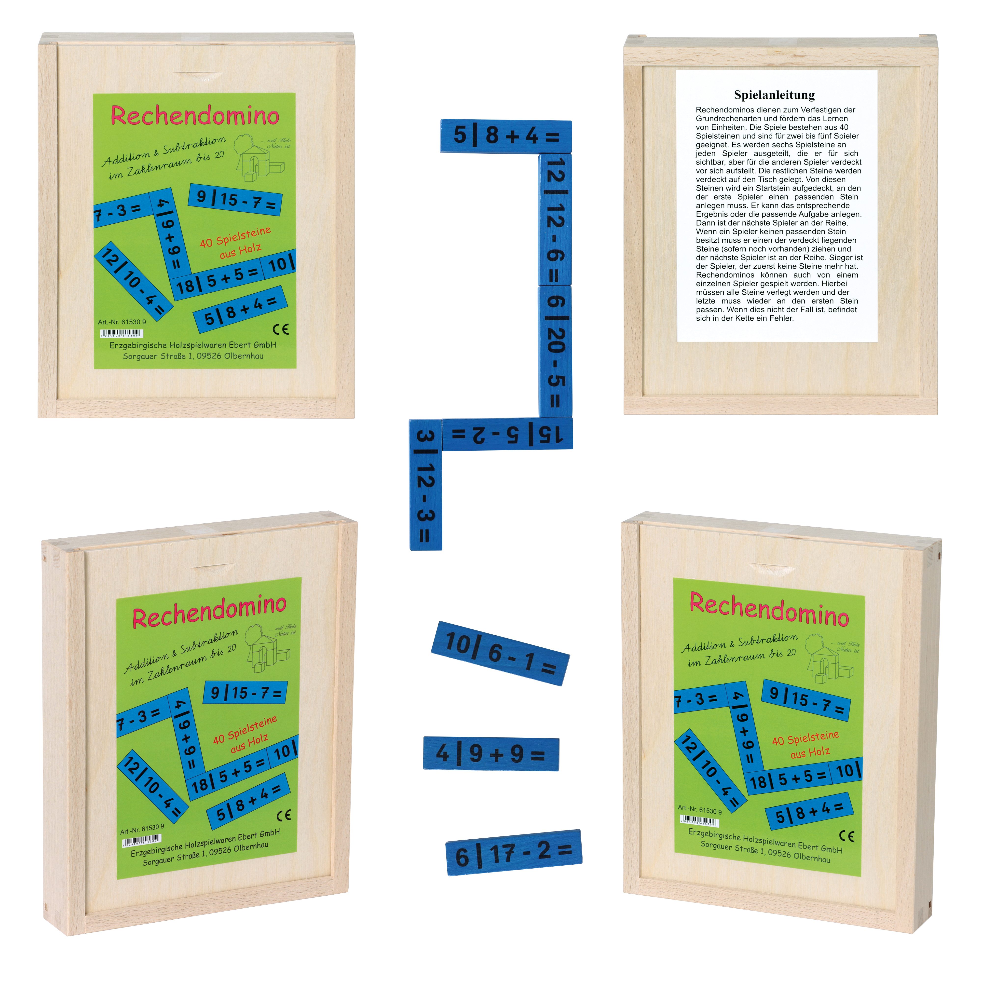 Mit dem Rechendomino trainiert das Kind ab 6 Jahren die Grundrechenarten Addition und Subtraktion bis 20. Das Set besteht aus 40 Holz-Spielsteinen in einer praktischen Holzbox mit Schiebedeckel. Spielsteingröße: 7 x 1,7 cm. Hergestellt in Deutschland.