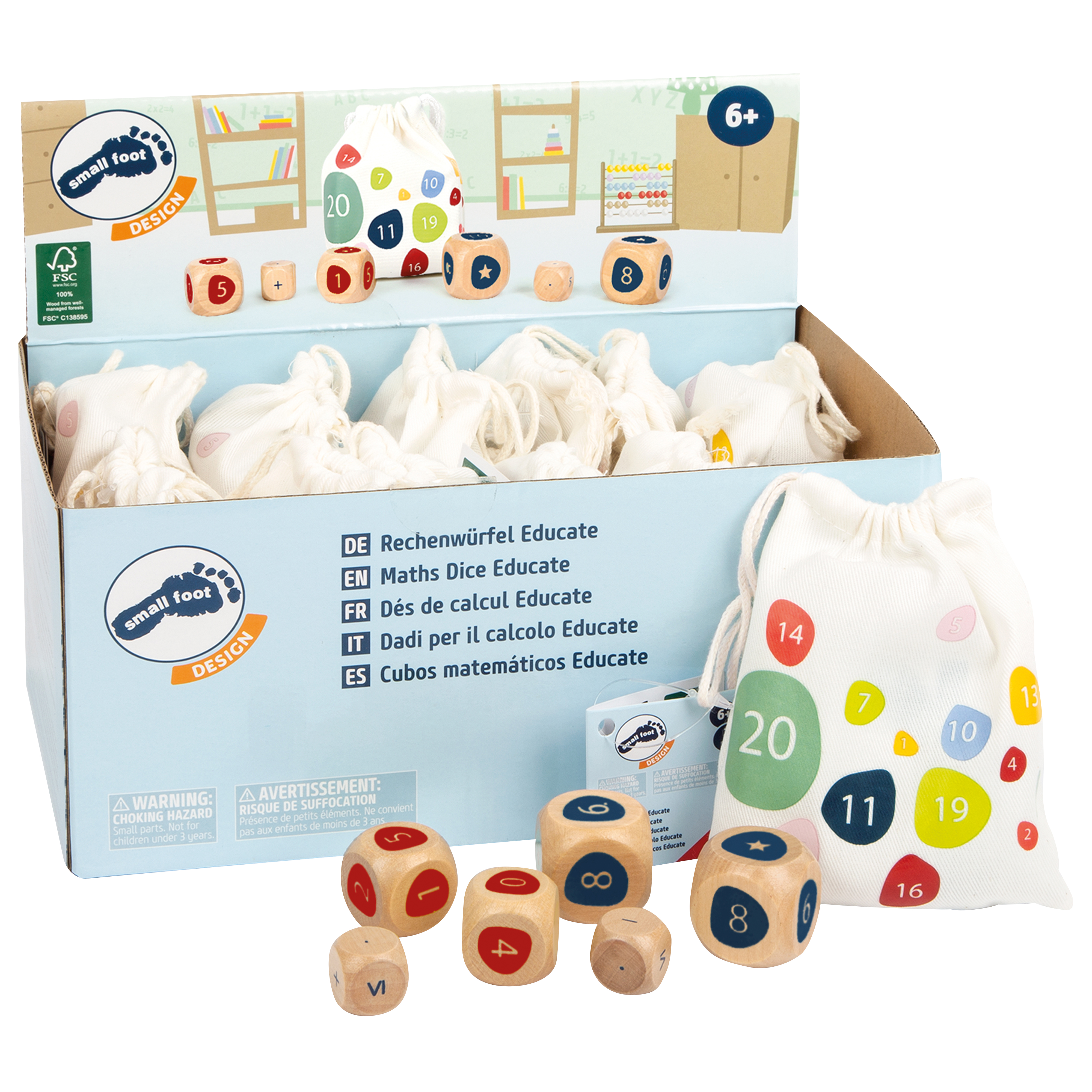 Dieser Beutel kommt mit einer Fülle an Rechenaufgaben daher! Enthalten sind sechs Rechenwürfel aus FSC-zertifiziertem Holz, mit denen unzählige Kombinationen an Rechenaufgaben gewürfelt werden können - von einfacher Addition und Subtraktion bis hin zu schwereren Matheaufgaben (z. B. Multiplikation). Alle Aufgaben entstehen per Zufallsprinzip, so bleibt das Rechnen spannend! Durch das Hinzunehmen bzw. Weglassen von Würfeln bestimmt jeder Spieler, wie schwer die Rechenaufgabe werden soll. Würfelgrößen: L: 30mm, S: 15mm.
