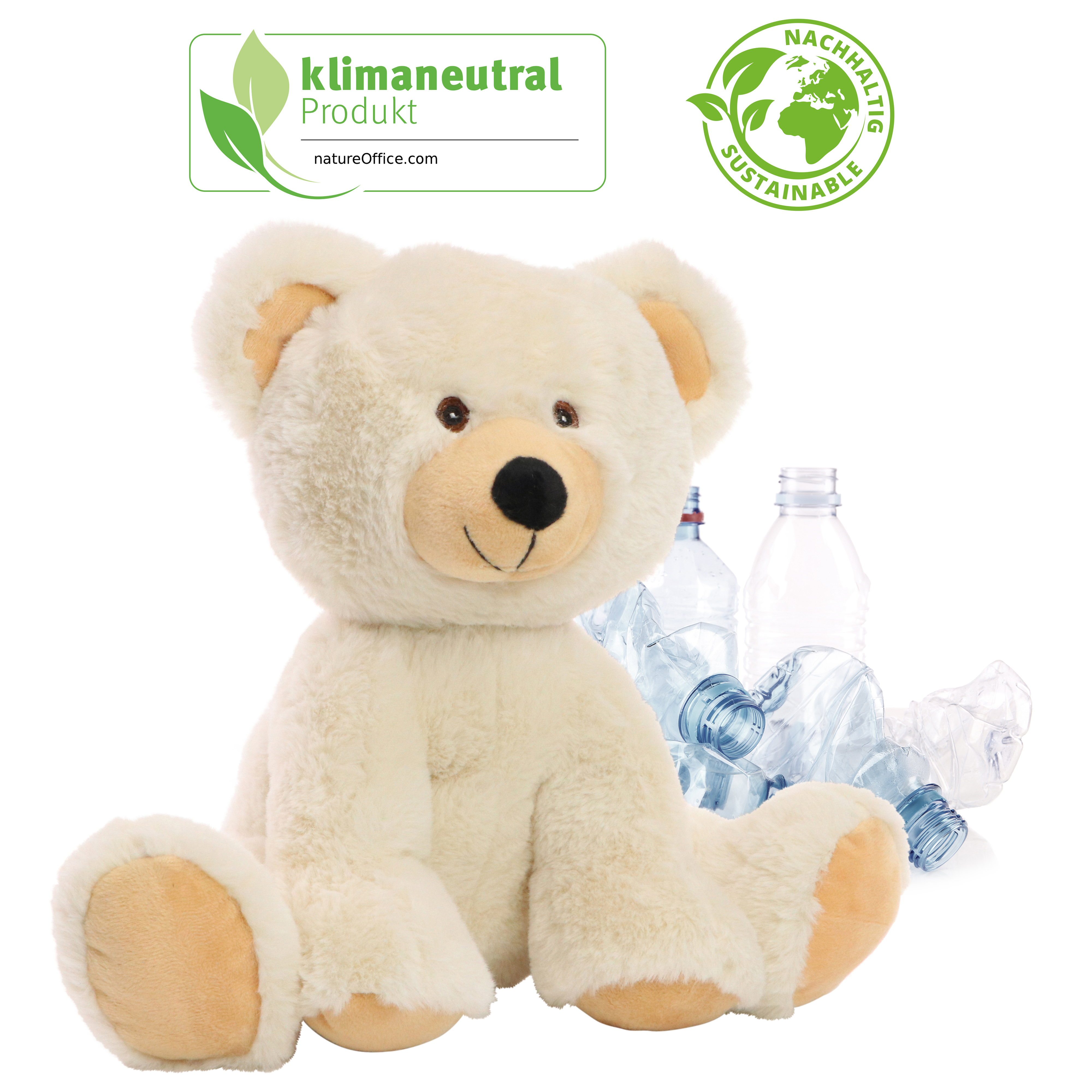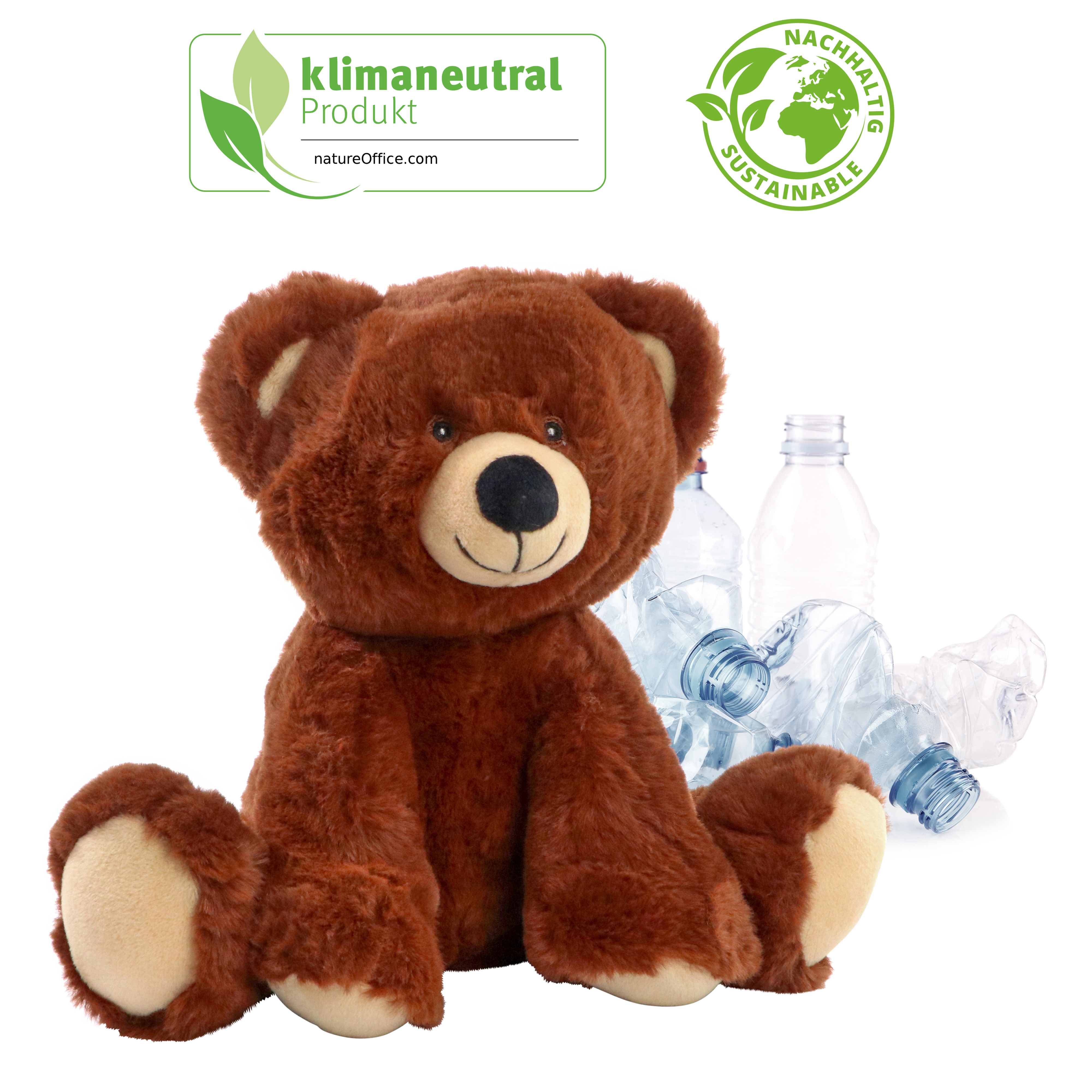 Teddybären sind die beliebtesten Kuscheltiere. Dieser superweiche Kuschelbär besteht aus genutzten und recycelten Plastikflaschen. Je nach Artikelgröße wird für die Herstellung des Materiasl etwa 6-8 PET-Flaschen (500ml) verwendet. Augen und Nase sind gestickt, es werden also keine zusätzlichen Plastikteile verwendet. Für Kinder ist er ein treuer Begleiter, der Sicherheit gibt und beim Einschlafen hilft; aber auch Erwachsene erfreuen sich immer wieder über ein so nachhaltiges und freundliches Mitbringsel oder Give-away.