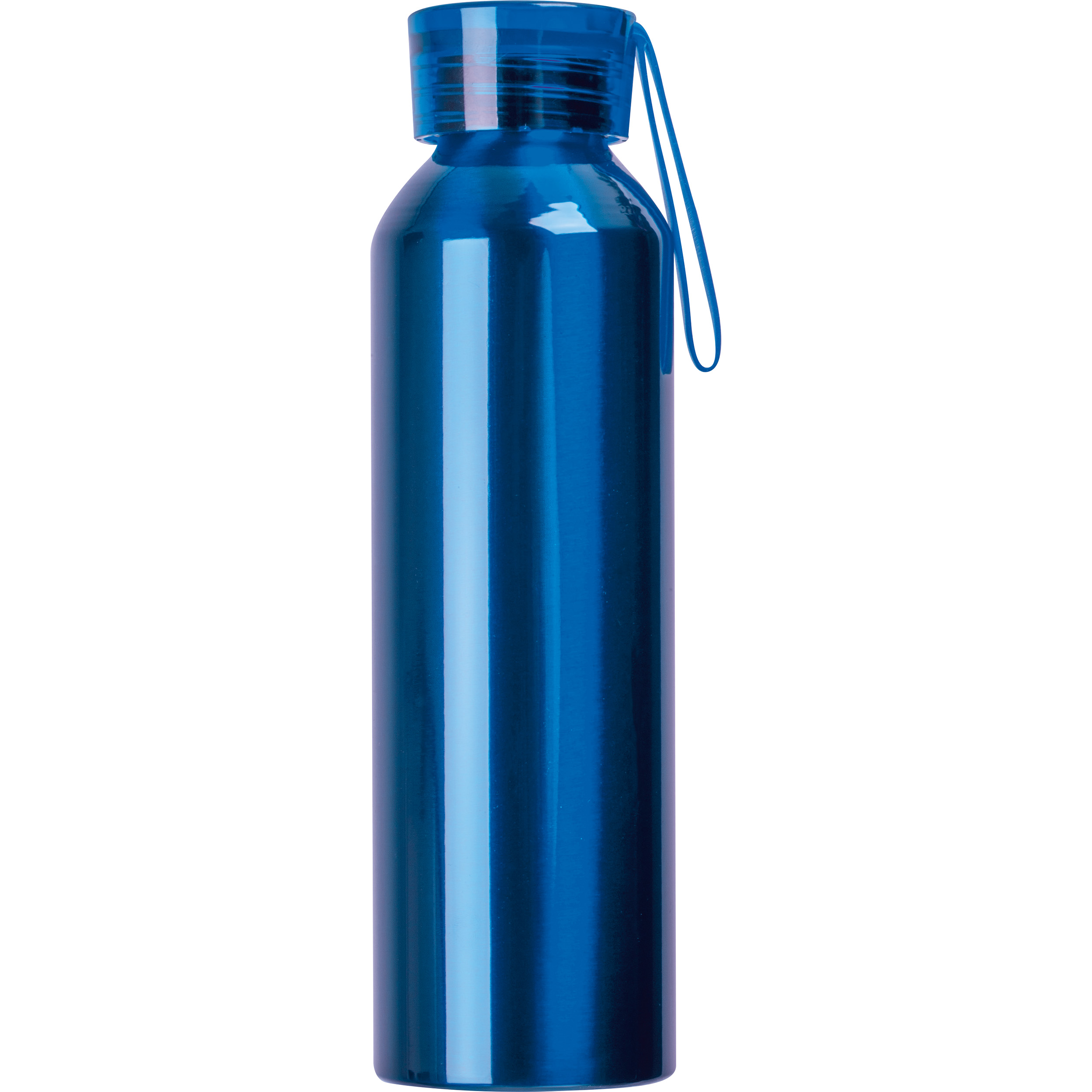 Trinkflasche aus recyceltem Aluminium mit Kunststoffdeckel, einer Trageschlaufe aus Silikon und einem Fassungsvolumen von 600 ml. Praktisch für unterwegs. Wir gravieren Ihr Logo auf die Trinkflasche.
