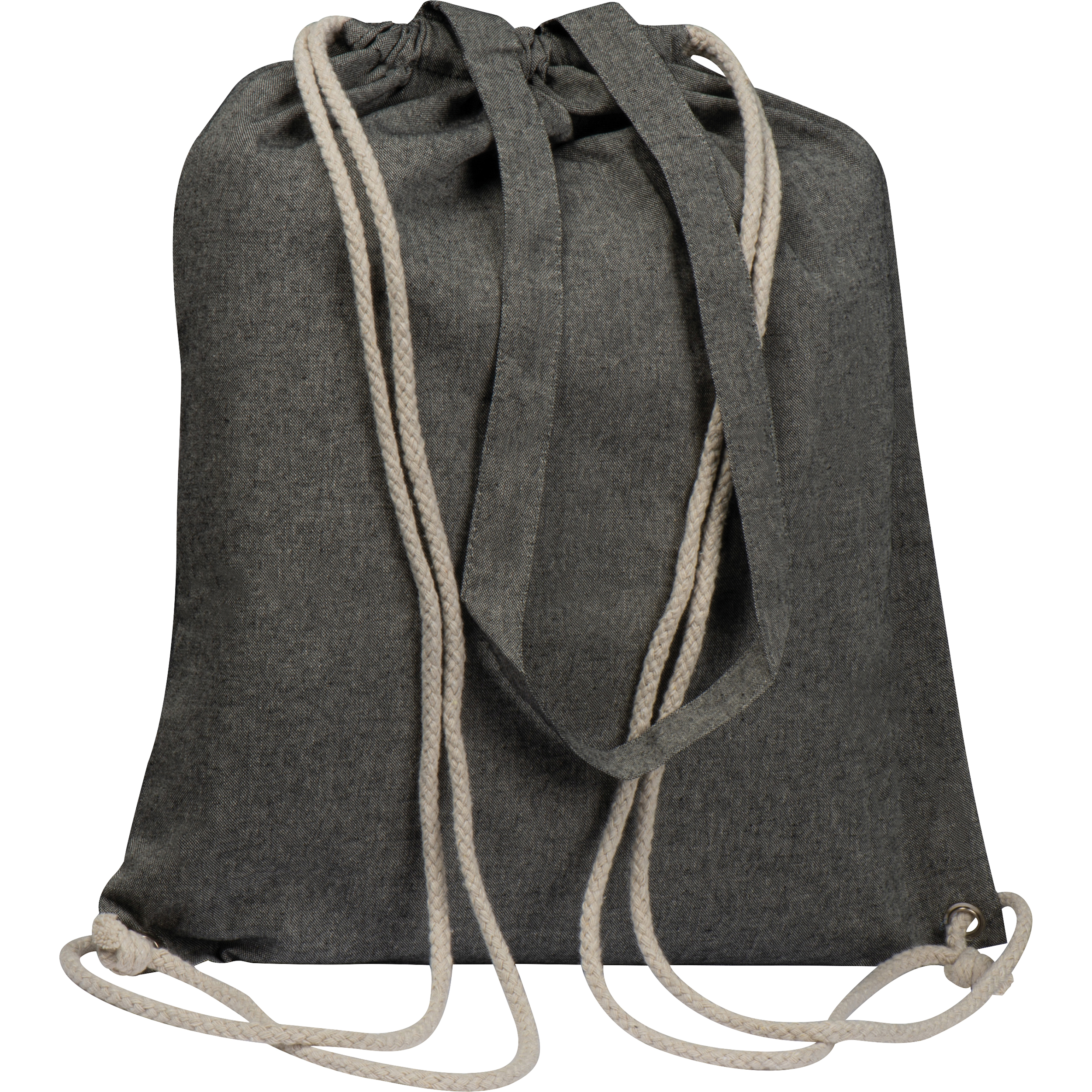 Oeko-Tex® STANDARD 100 zertifizierte, Tasche aus recycelter Baumwolle mit langen Tragehenkeln, zusätzlichen Tragekordeln durch die die Tasche als Rucksack getragen werden kann und einer Grammatur von 140g / m². Die Werbung wird auf eine Seite der Tasche gedruckt.