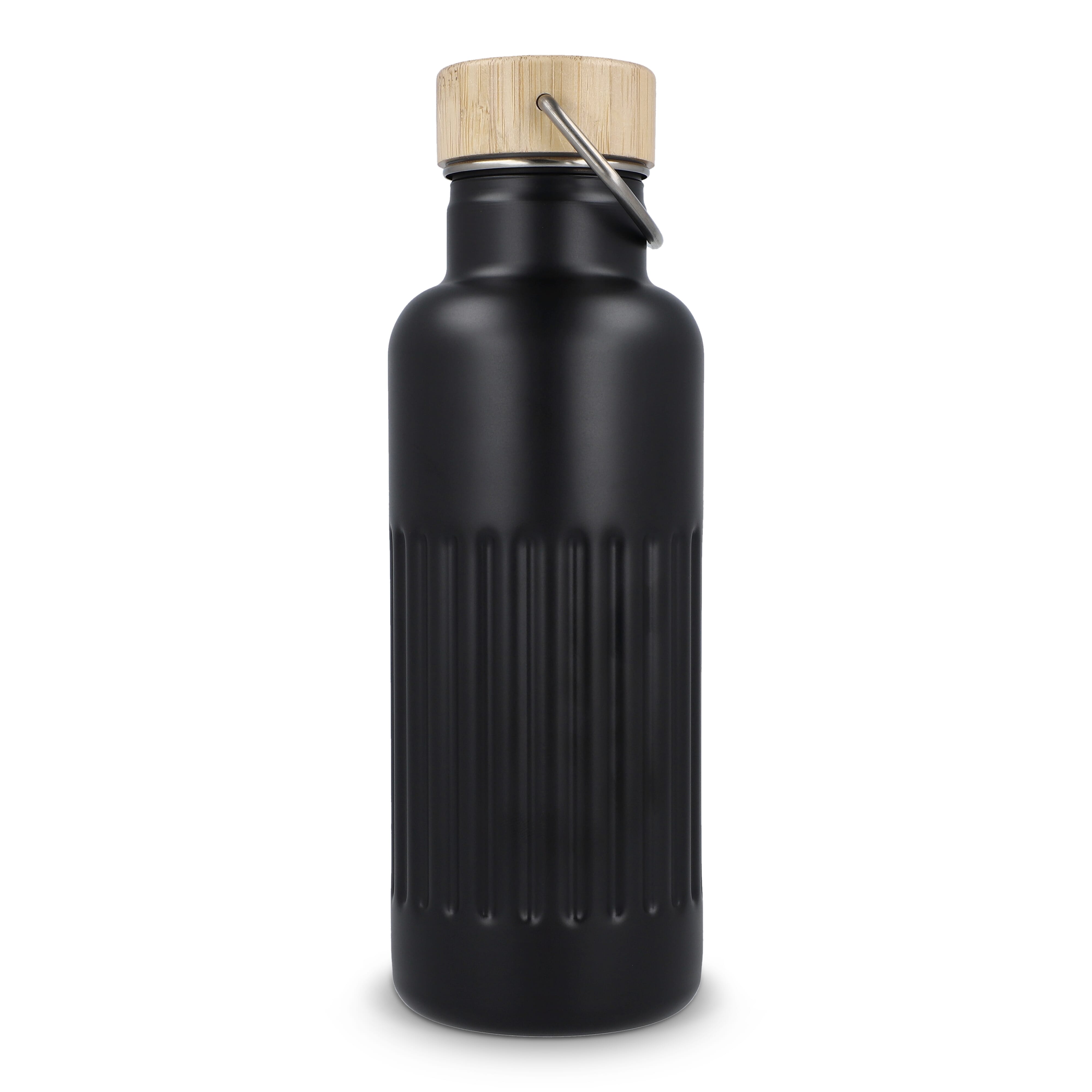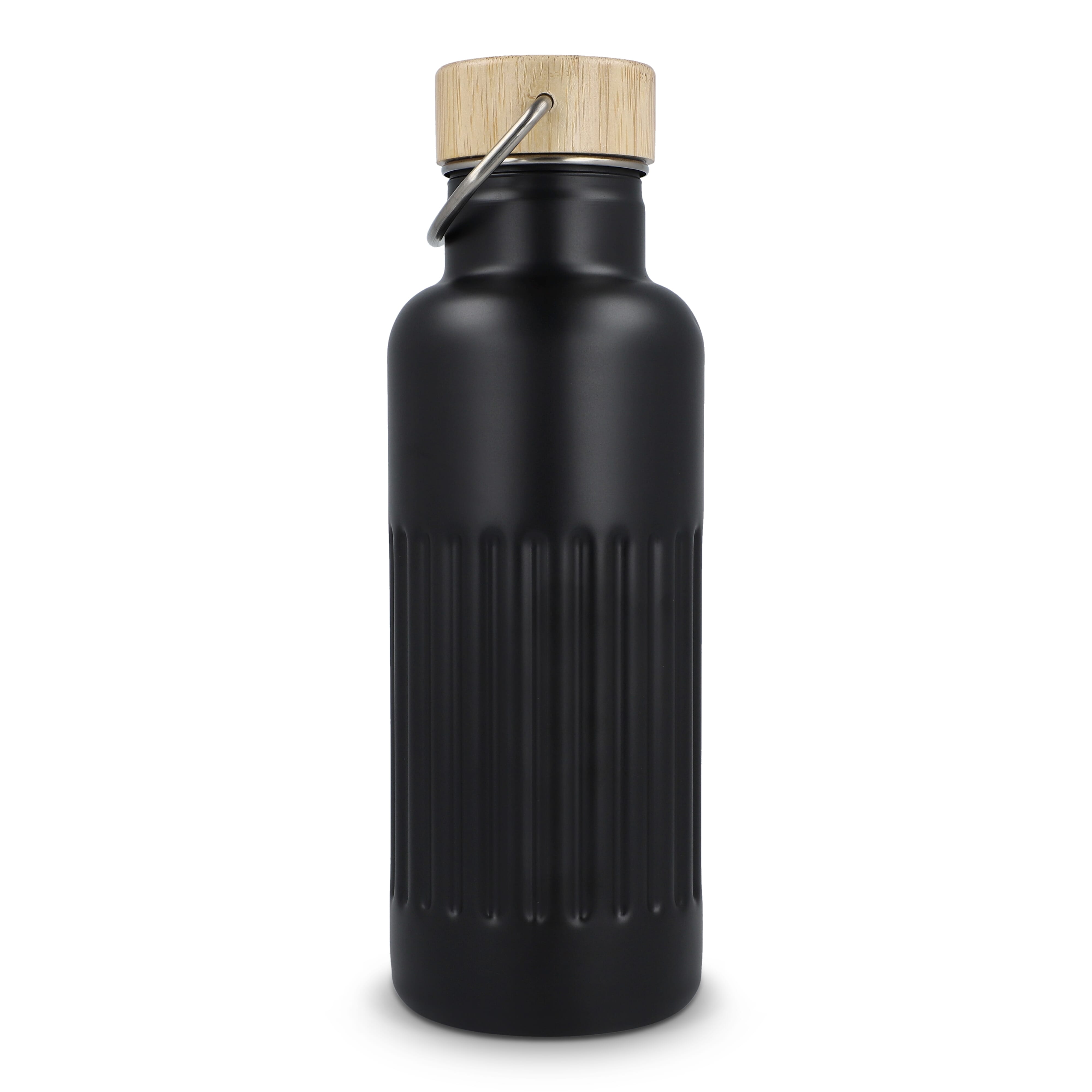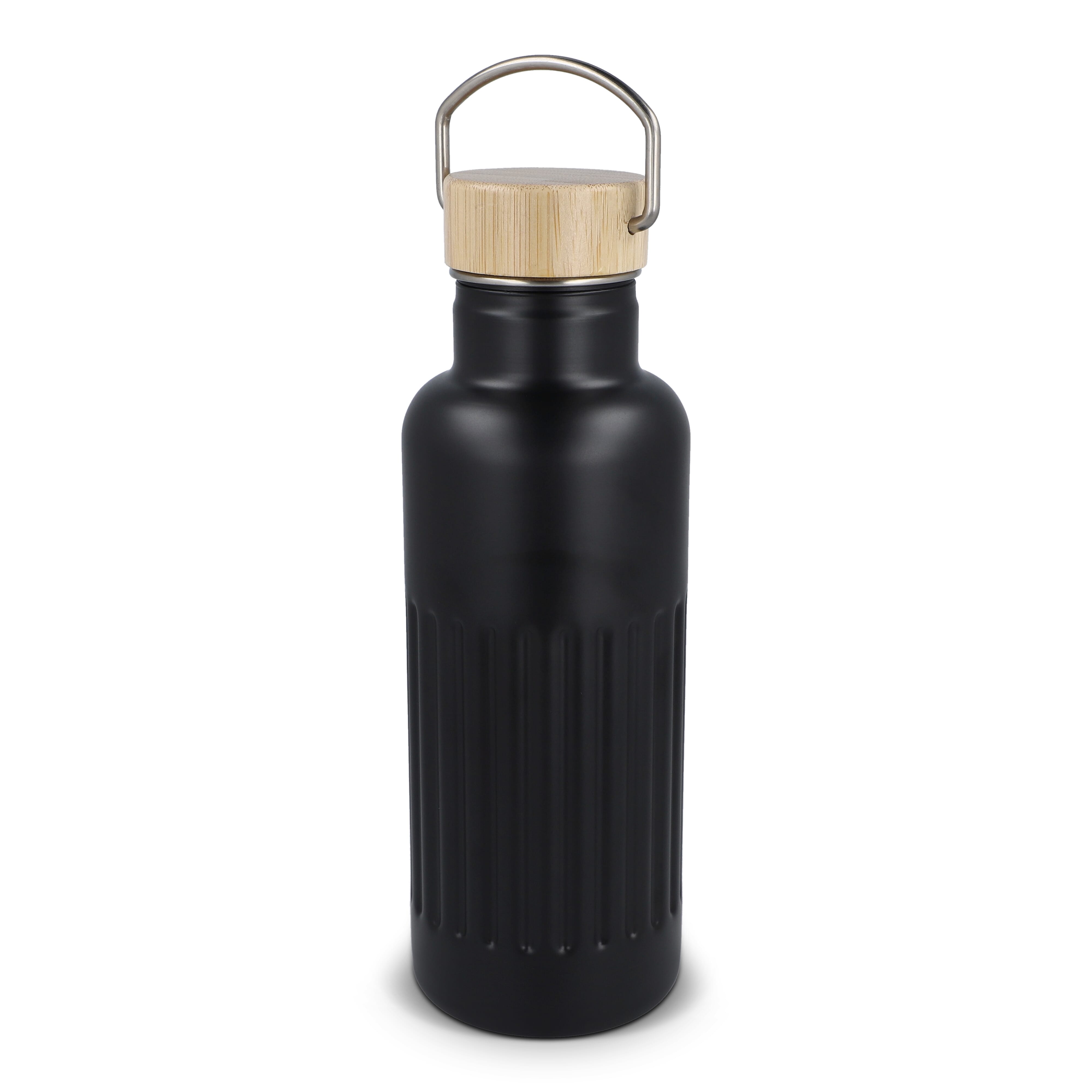 Recycelte Edelstahl-Isolierflasche mit 500 ml Fassungsvermögen und auslaufsicherem Bambusdeckel. Der Flaschenkörper hat ein modernes Streifenmuster, in einer Geschenkbox verpackt.