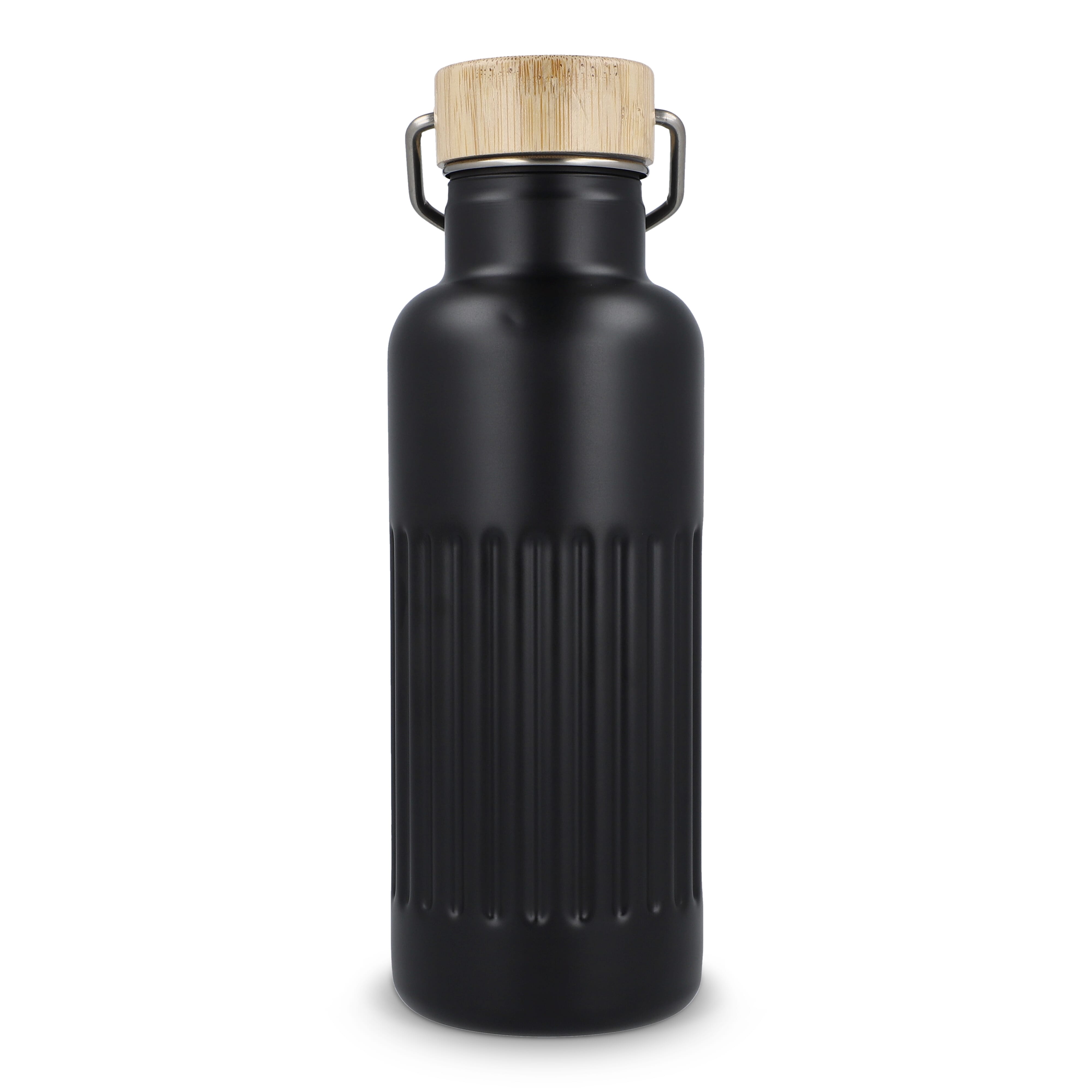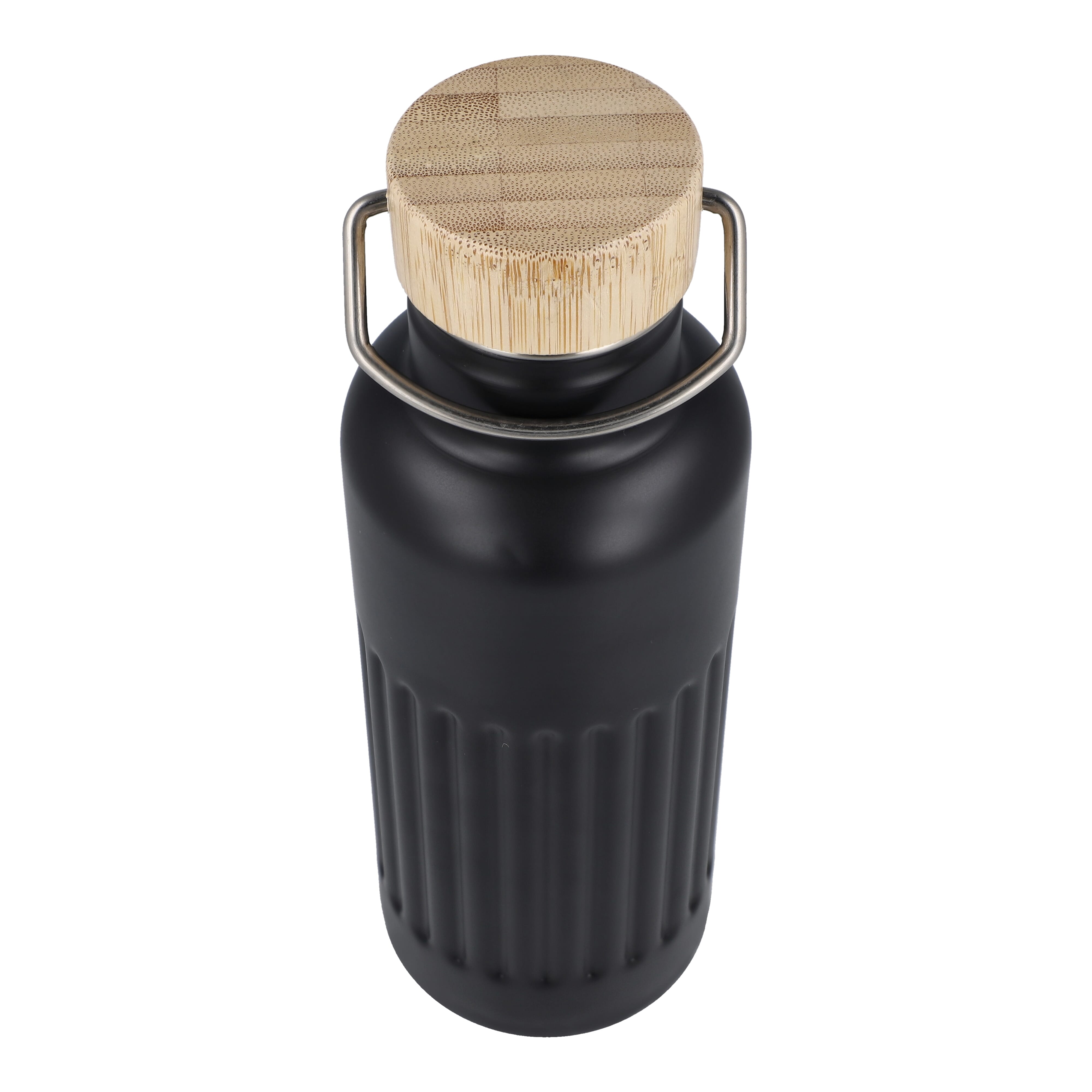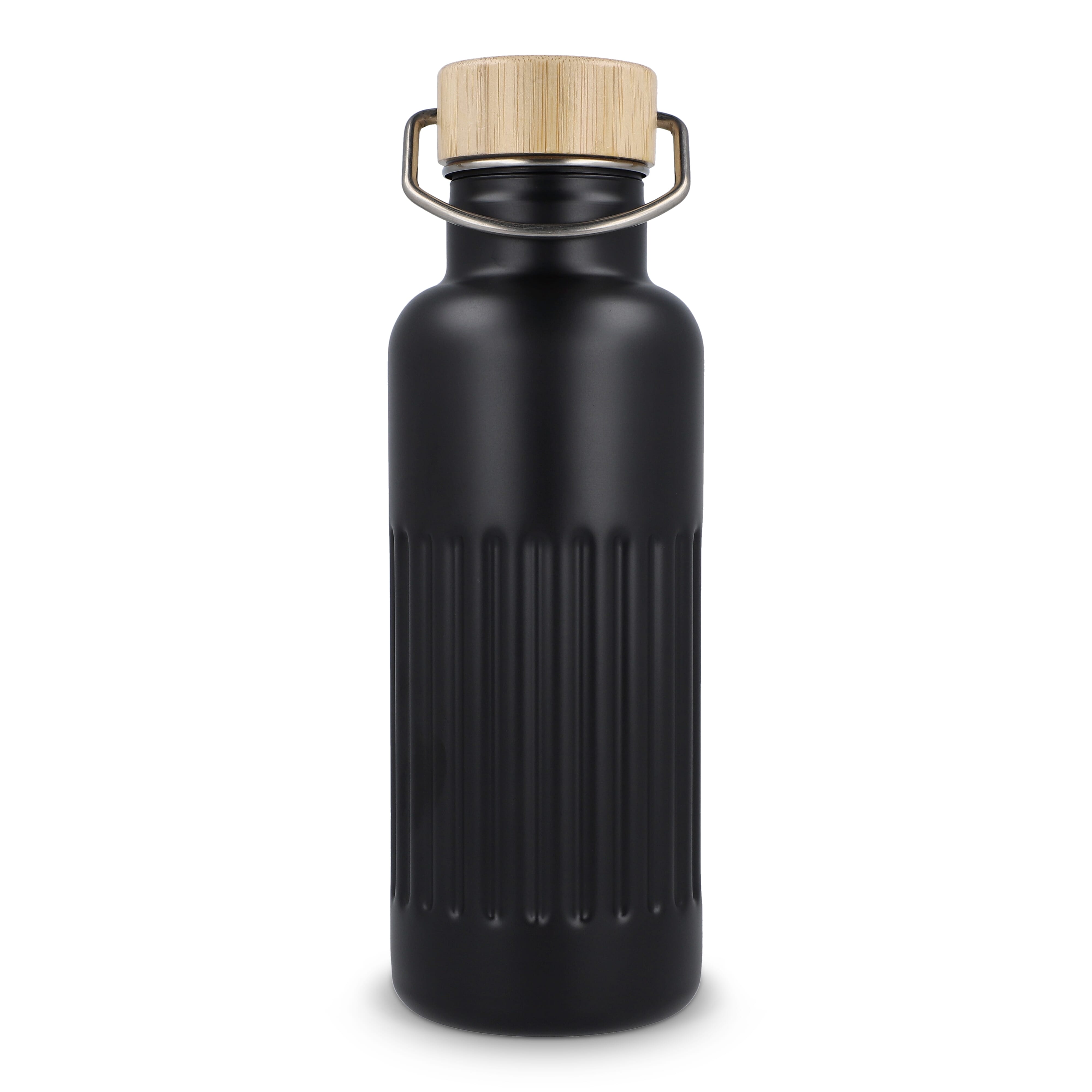Recycelte Edelstahl-Isolierflasche mit 500 ml Fassungsvermögen und auslaufsicherem Bambusdeckel. Der Flaschenkörper hat ein modernes Streifenmuster, in einer Geschenkbox verpackt.