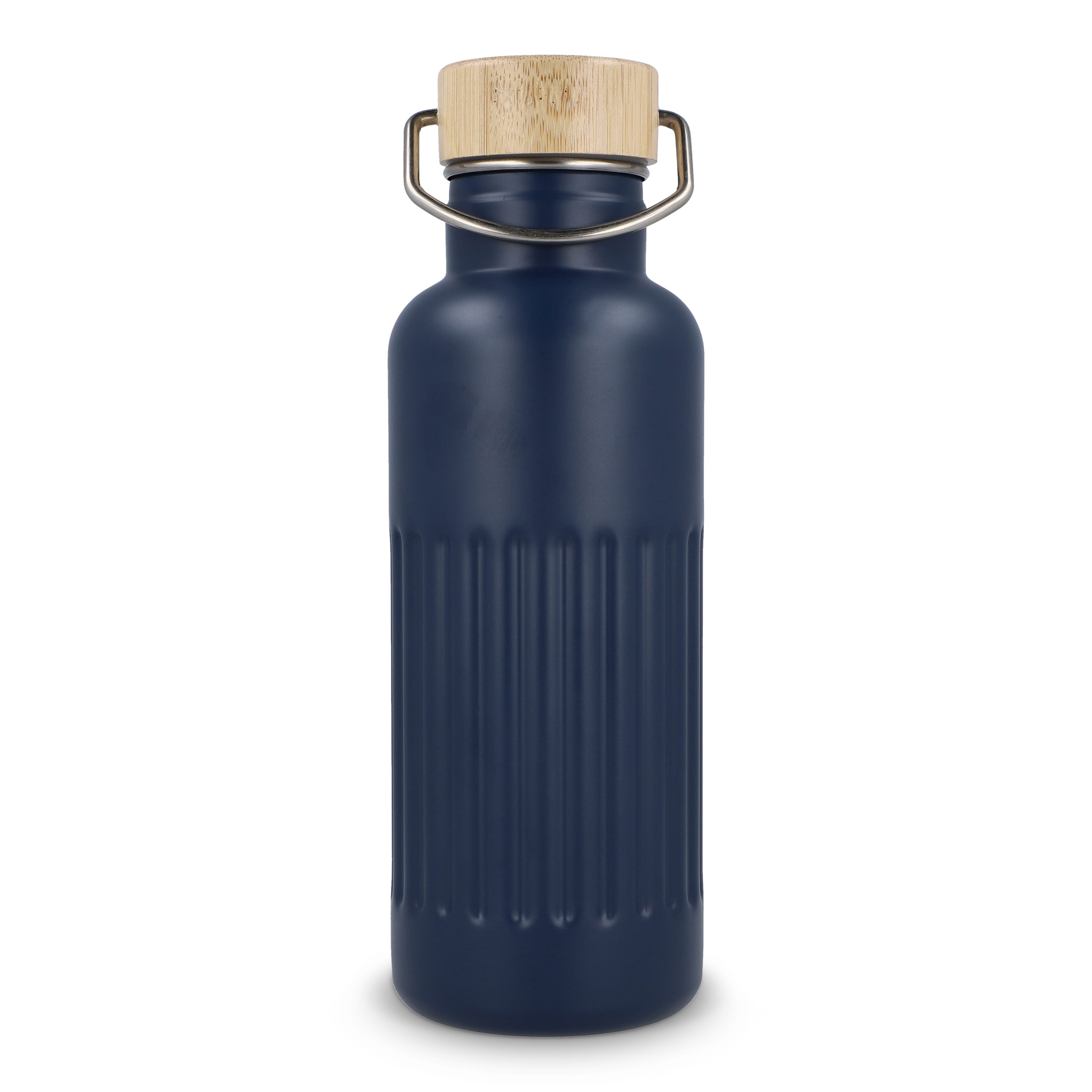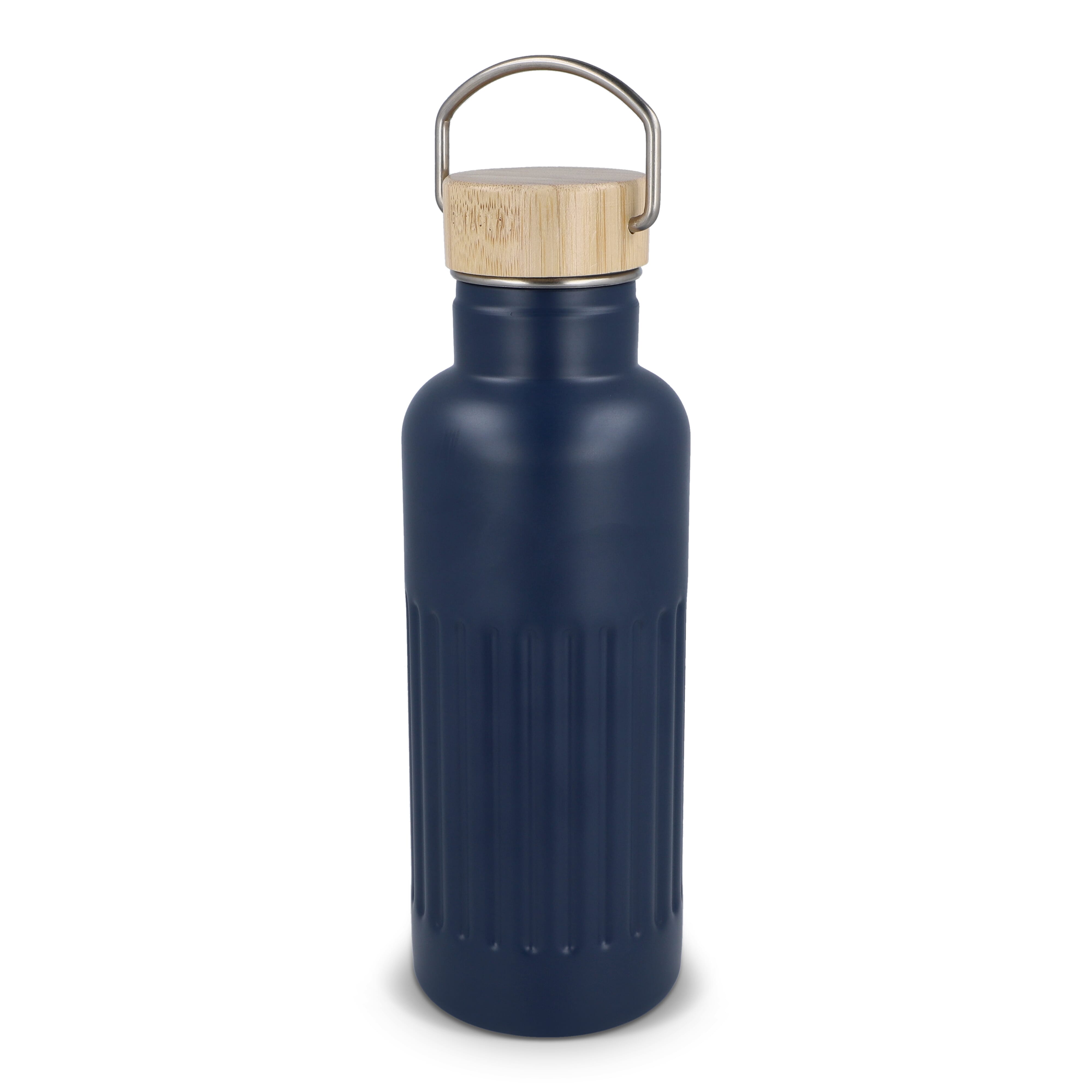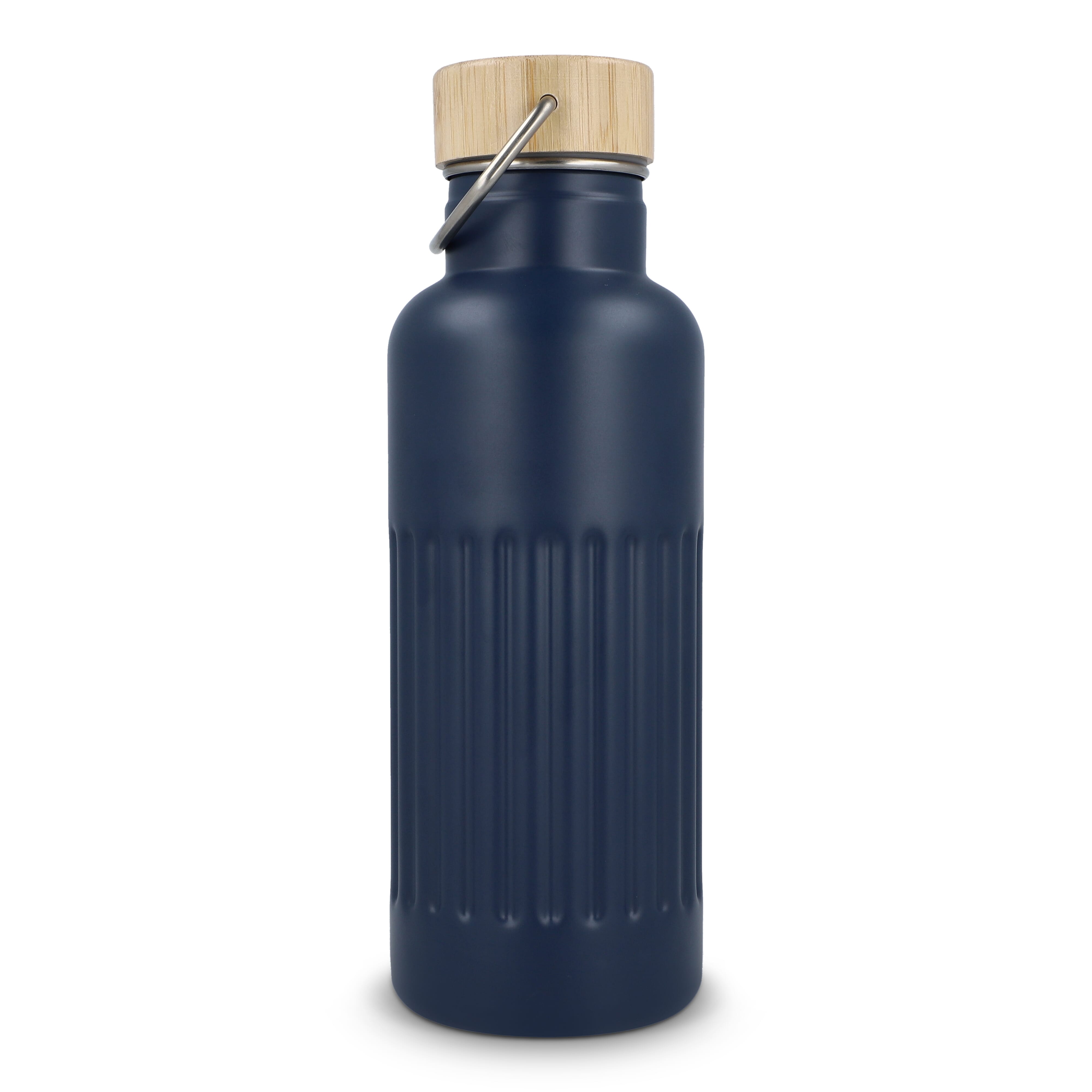 Recycelte Edelstahl-Isolierflasche mit 500 ml Fassungsvermögen und auslaufsicherem Bambusdeckel. Der Flaschenkörper hat ein modernes Streifenmuster, in einer Geschenkbox verpackt.