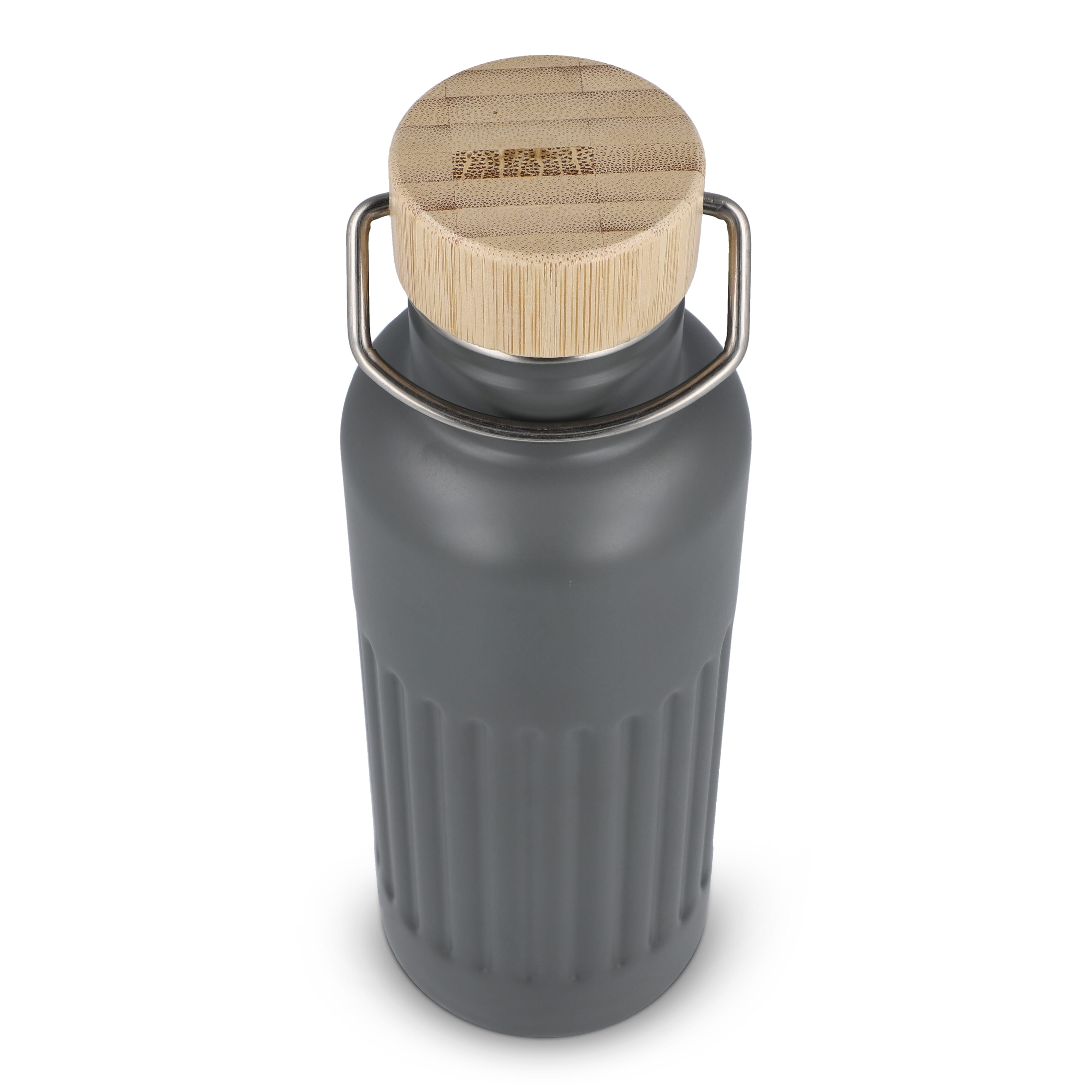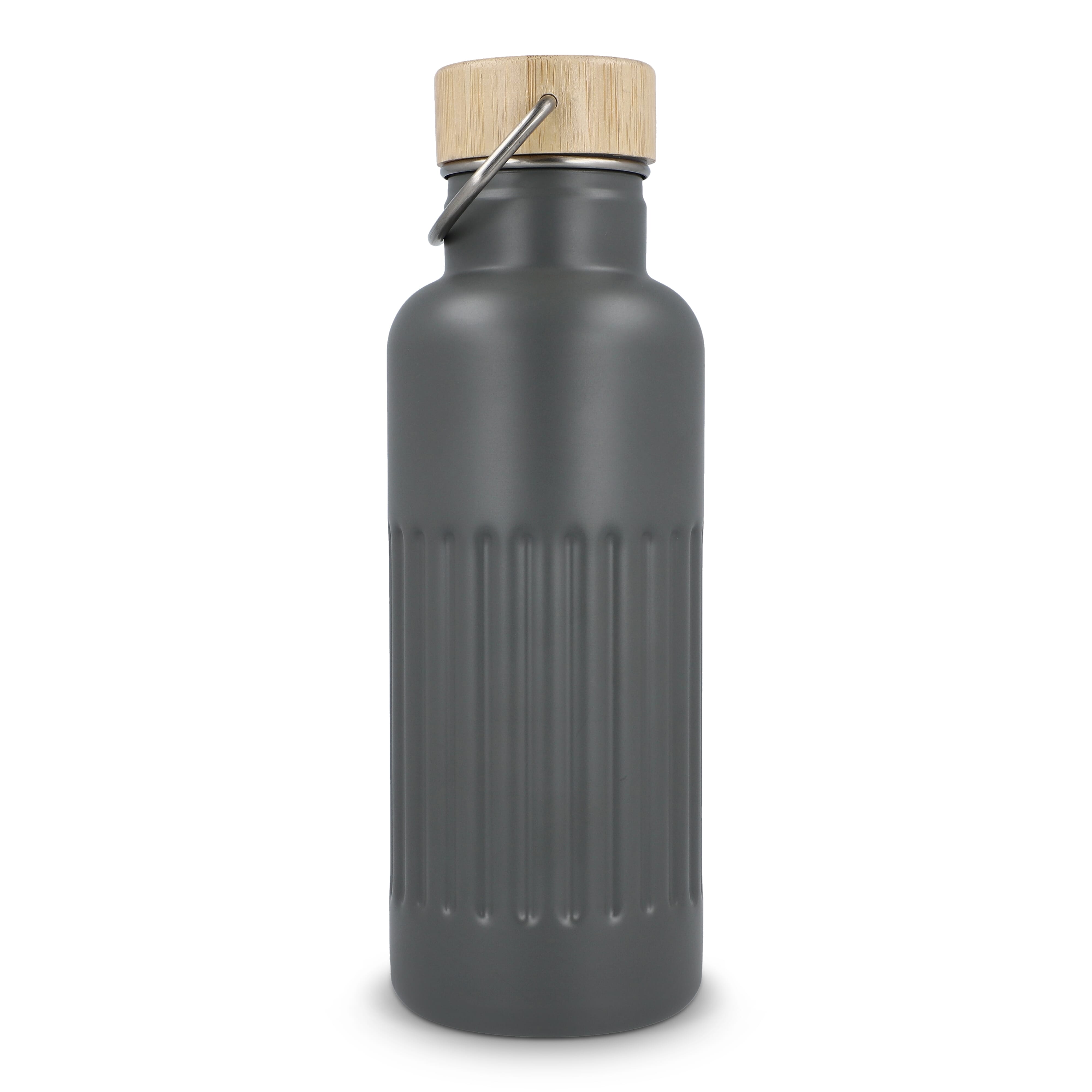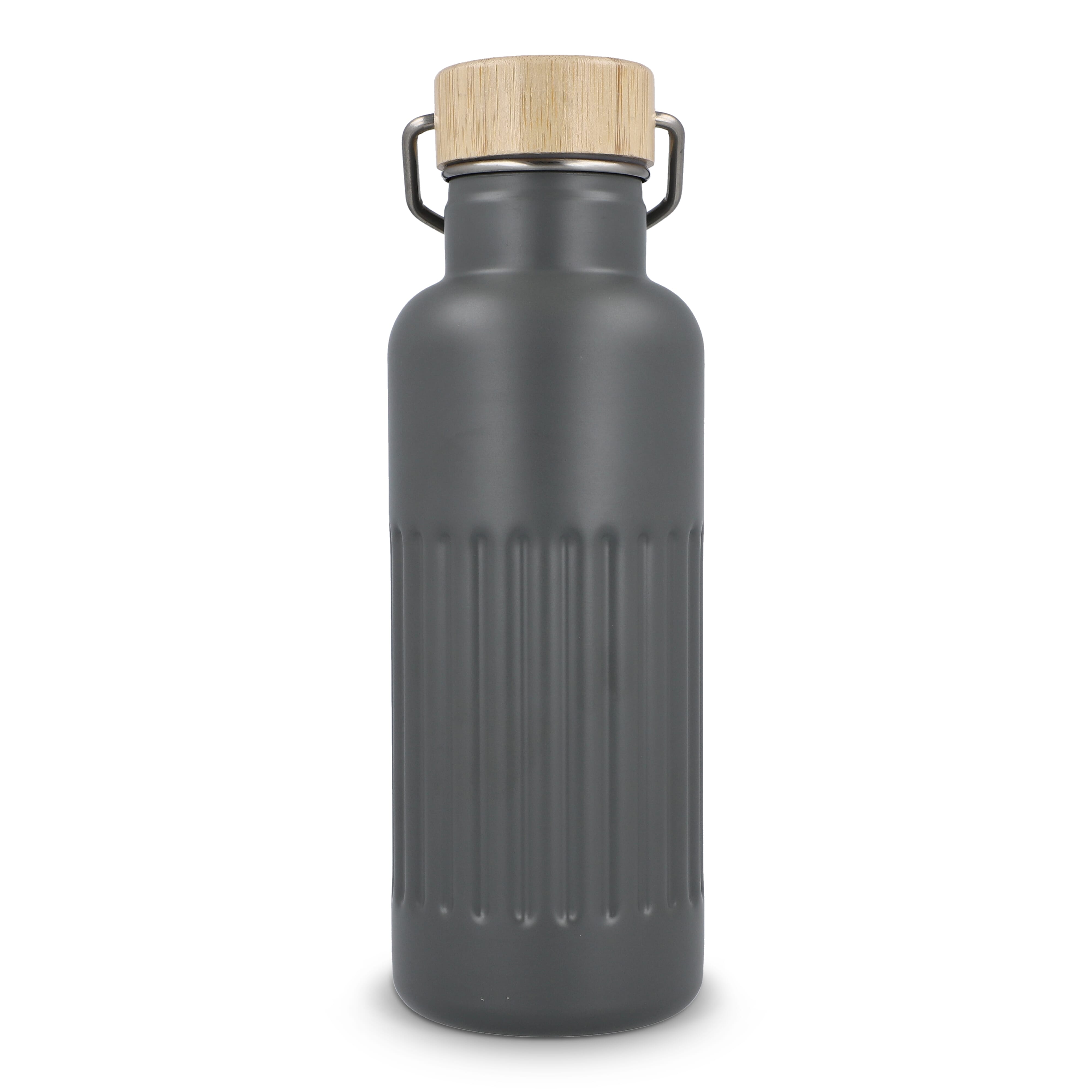 Recycelte Edelstahl-Isolierflasche mit 500 ml Fassungsvermögen und auslaufsicherem Bambusdeckel. Der Flaschenkörper hat ein modernes Streifenmuster, in einer Geschenkbox verpackt.