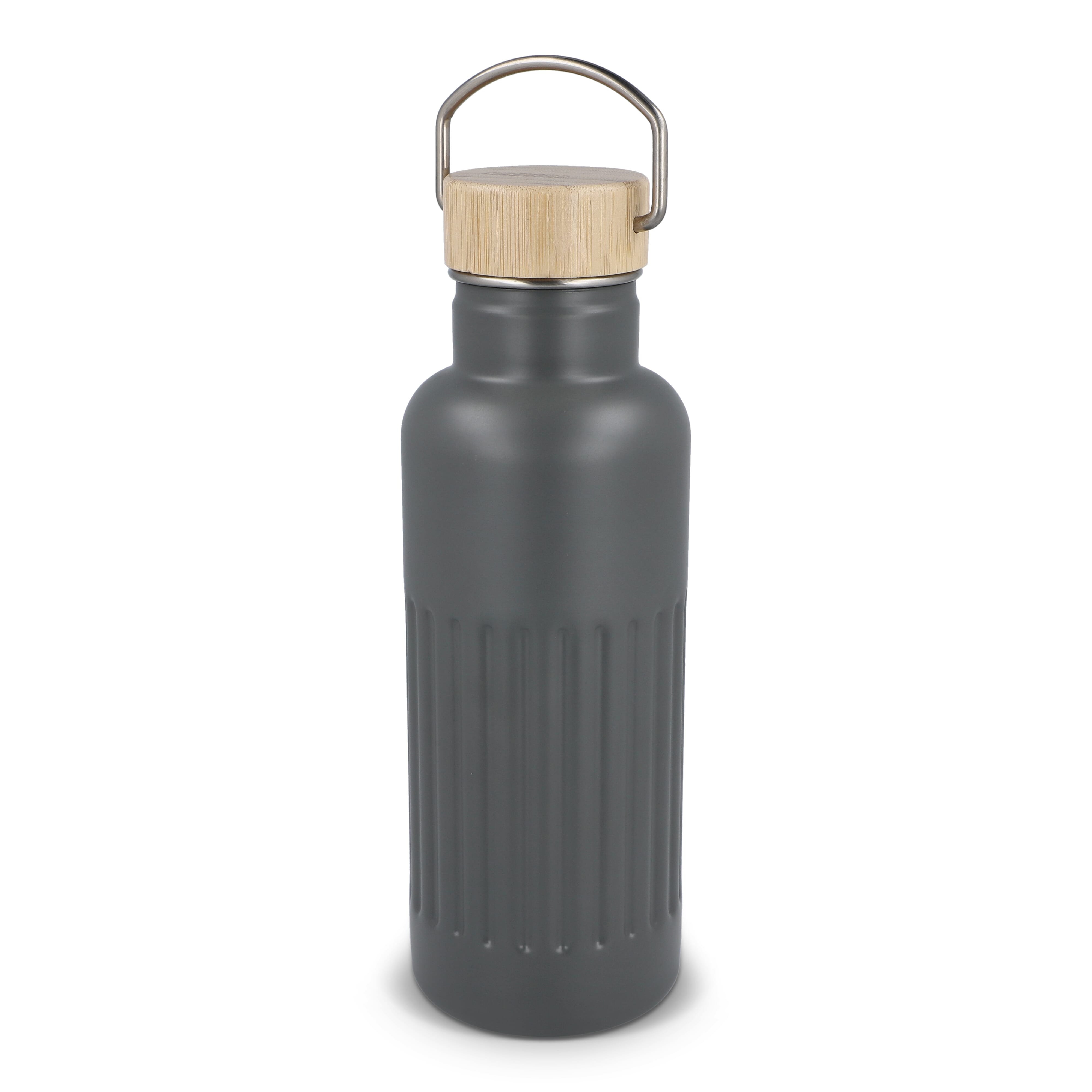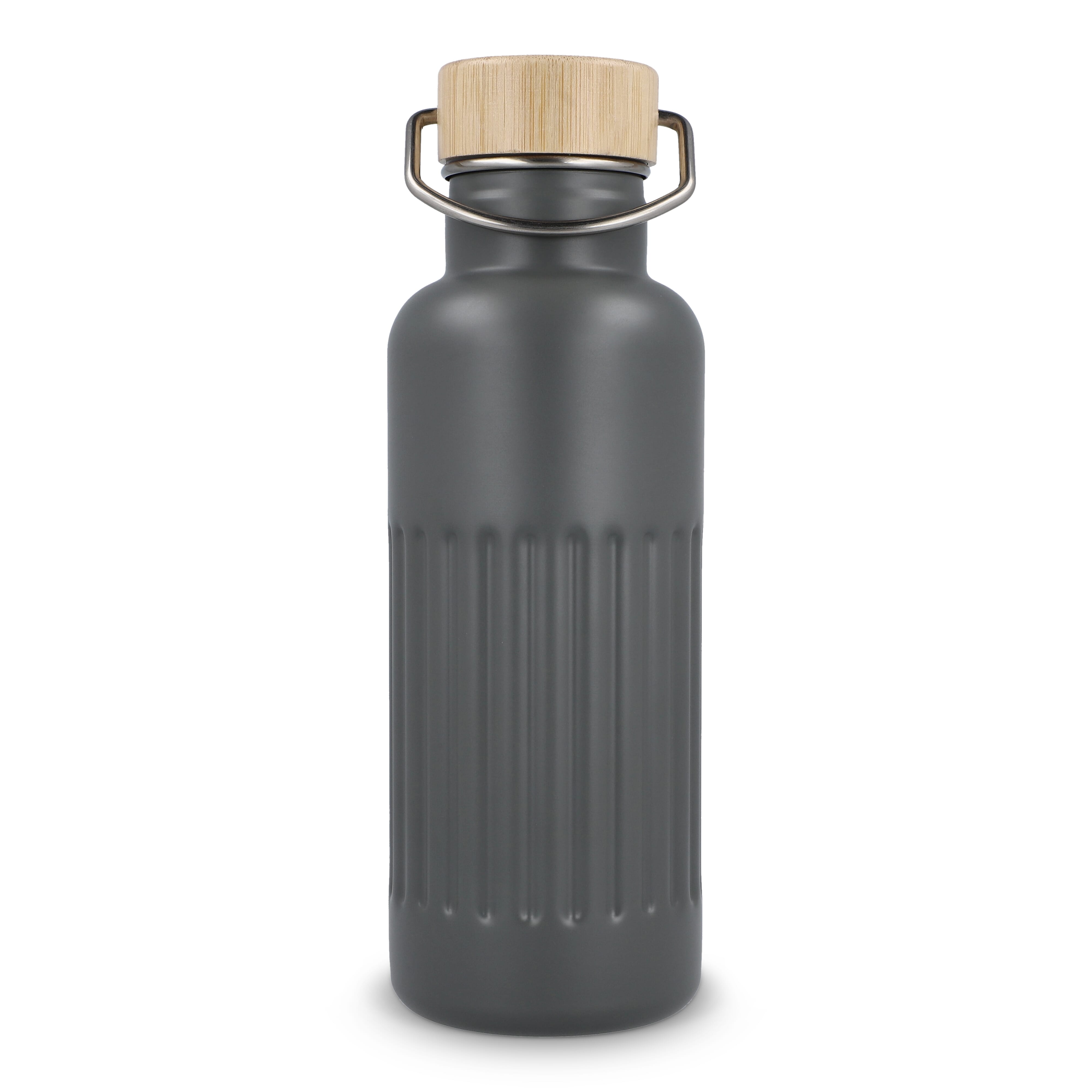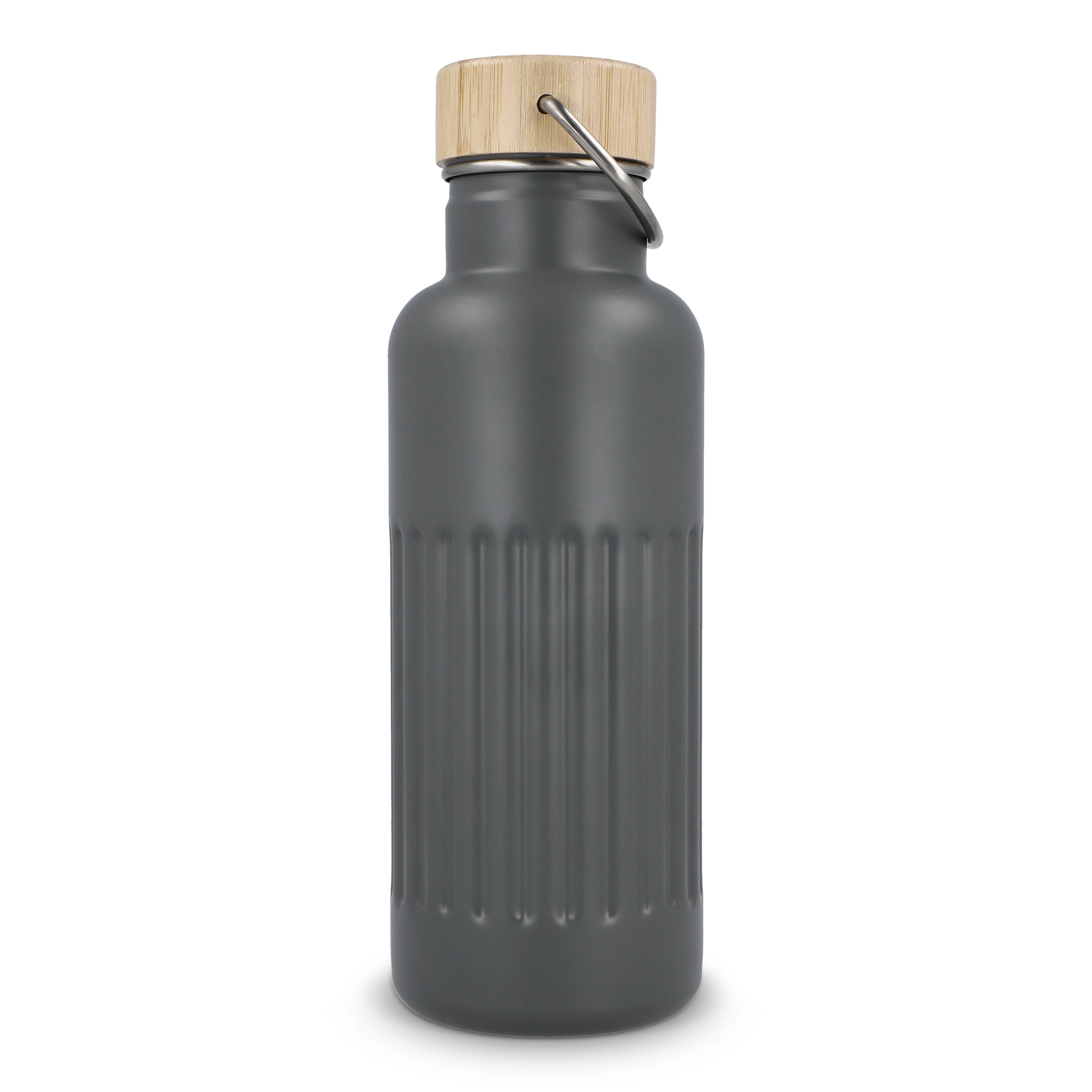 Recycelte Edelstahl-Isolierflasche mit 500 ml Fassungsvermögen und auslaufsicherem Bambusdeckel. Der Flaschenkörper hat ein modernes Streifenmuster, in einer Geschenkbox verpackt.