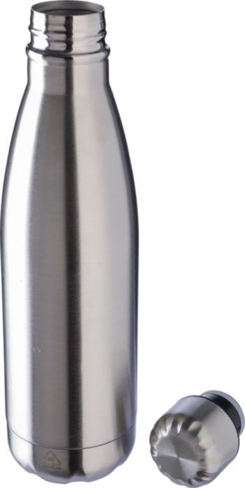 Recycelte einwandige Edelstahlflasche (650 ml) mit Schraubverschluss. Hergestellt aus rostfreiem Stahl 304. Eingraviertes Recycelt-Logo auf der Flasche. Einzeln verpackt in einer braunen Pappschachtel.