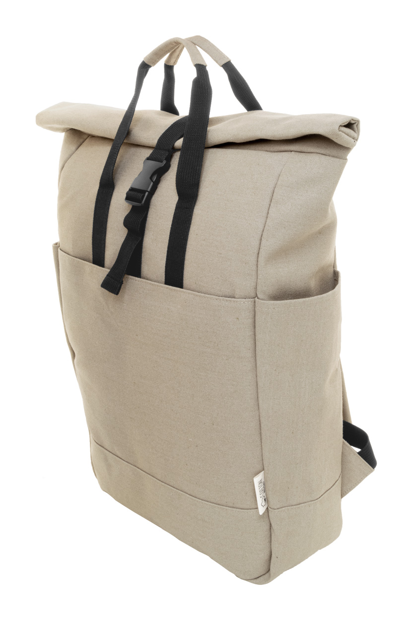 Rolltop-Rucksack aus recycelten Canvas mit Schnalle und Klettverschluss, gepolstertem Laptopfach (15"), Vorder- und Seitentaschen. Mit Trolley-Gurt, gepolstertem Rücken und Schultergurten. 70 % recycelter Baumwolle und 30 % RPET-Polyester. Mit Label recycelte Baumwolle.
