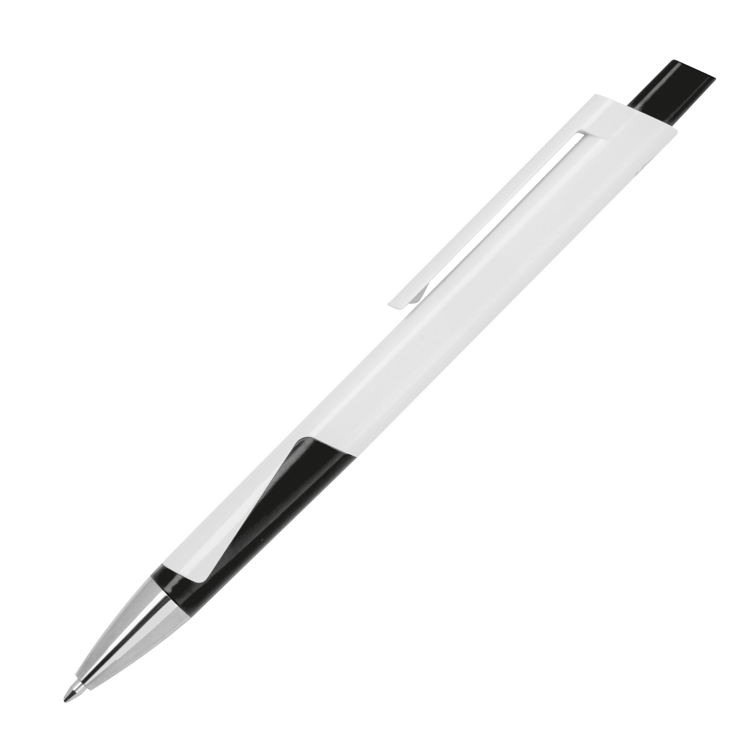 Weißer Kugelschreiber aus recyceltem Kunststoff (RABS) mit blau schreibende Großraummine. Ihr Logo drucken wir neben den Clip.
