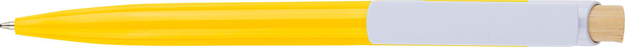 Recycelter ABS-Kugelschreiber mit Bambus-Druckknopf und weißem Clip. Mit recyceltem Logo im In-Mould-Verfahren. Ungefähre Schreiblänge 600 Meter. Blaue Tinte.