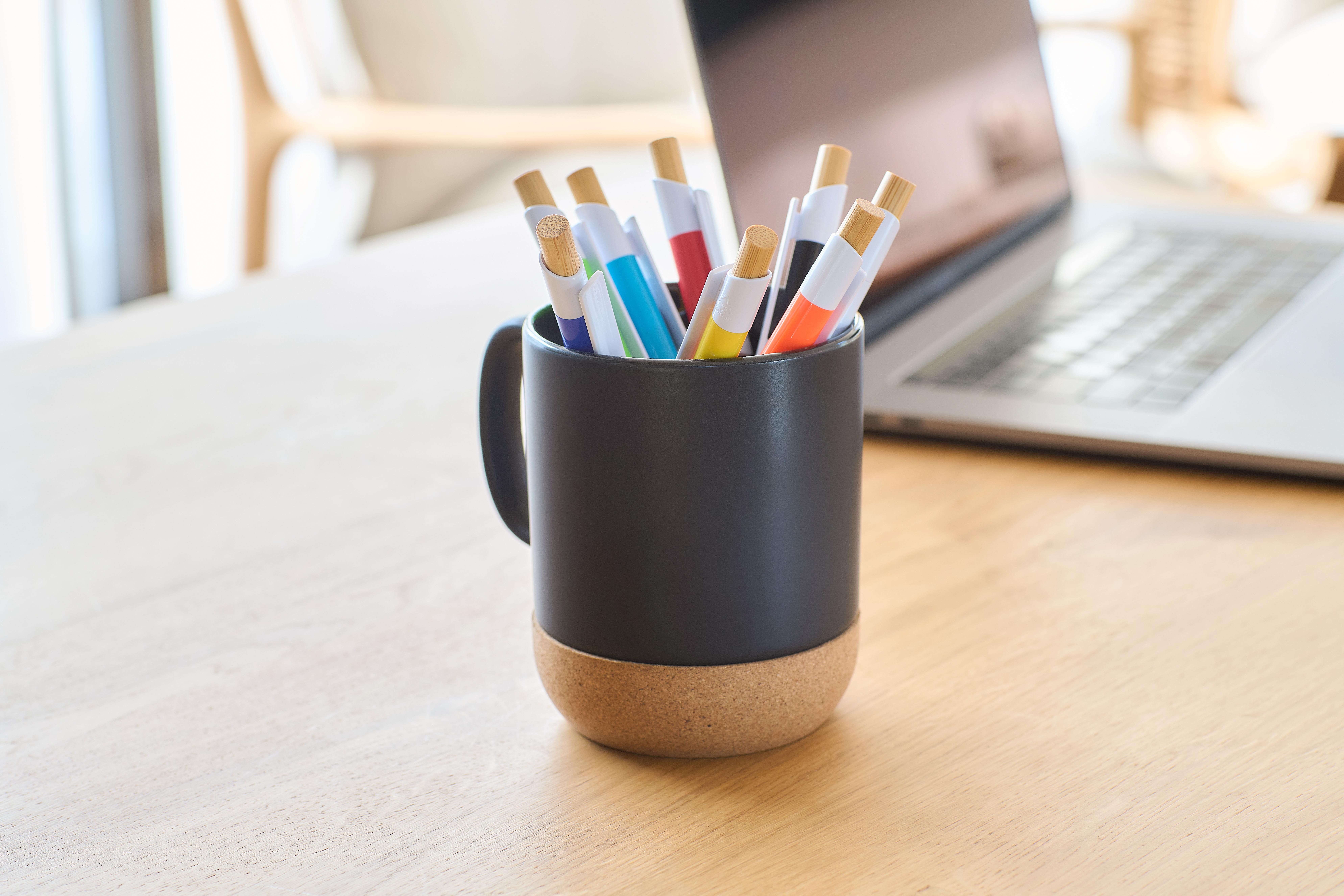 Recycelter ABS-Kugelschreiber mit Bambus-Druckknopf und weißem Clip. Mit recyceltem Logo im In-Mould-Verfahren. Ungefähre Schreiblänge 600 Meter. Blaue Tinte.