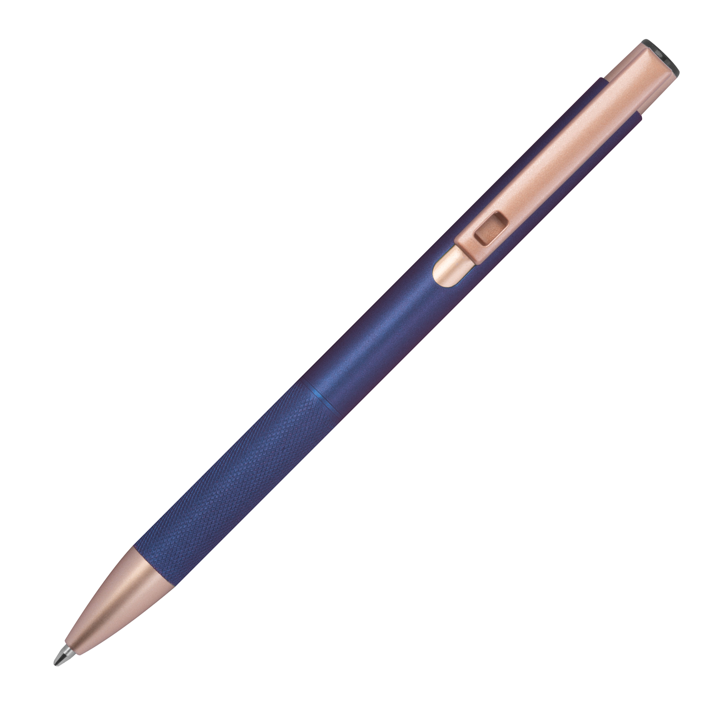 Kugelschreiber aus recyceltem Aluminium mit rosé goldenen Applikationen, blau schreibender Großraummine und Griffzone in Diamantoptik. Ihre Werbung gravieren wir rechts vom Clip.