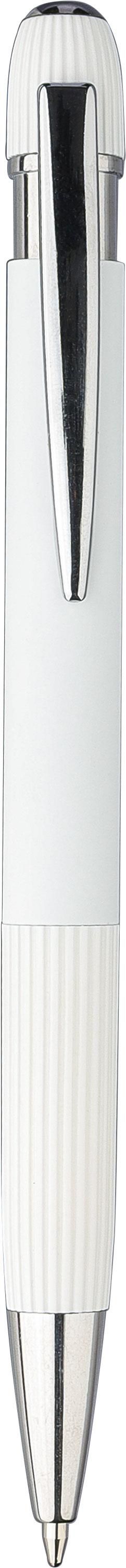 Dieser Kugelschreiber ist aus recyceltem Aluminium gefertigt und verfügt über eine gummierte Oberfläche. Er verfügt über gestreifte Details am Griff und auf der Oberseite, eine verchromte Kunststoffspitze sowie einen Druckknopf mit Metallclip. Das Recycelt-Logo ist lasergraviert. Blaue Tinte.