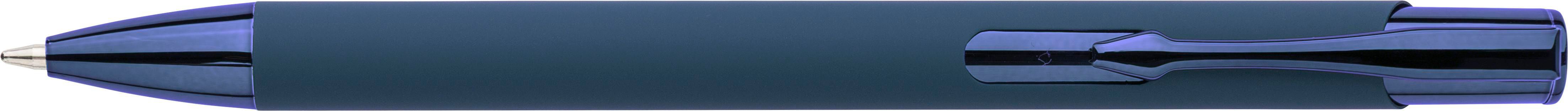 Gummierter Kugelschreiber aus recyceltem Aluminium mit glänzendem UV-Kunststoffdrücker, UV-verchromter Kunststoffspitze und UV-beschichtetem Metallclip, alles in passenden Farben. Nach der Gravur entsteht ein glänzender Spiegeleffekt in der Farbe des Stiftes. Inklusive eingraviertem Recycling-Logo. Ungefähre Schreiblänge: 800 m. Blaue Tinte.