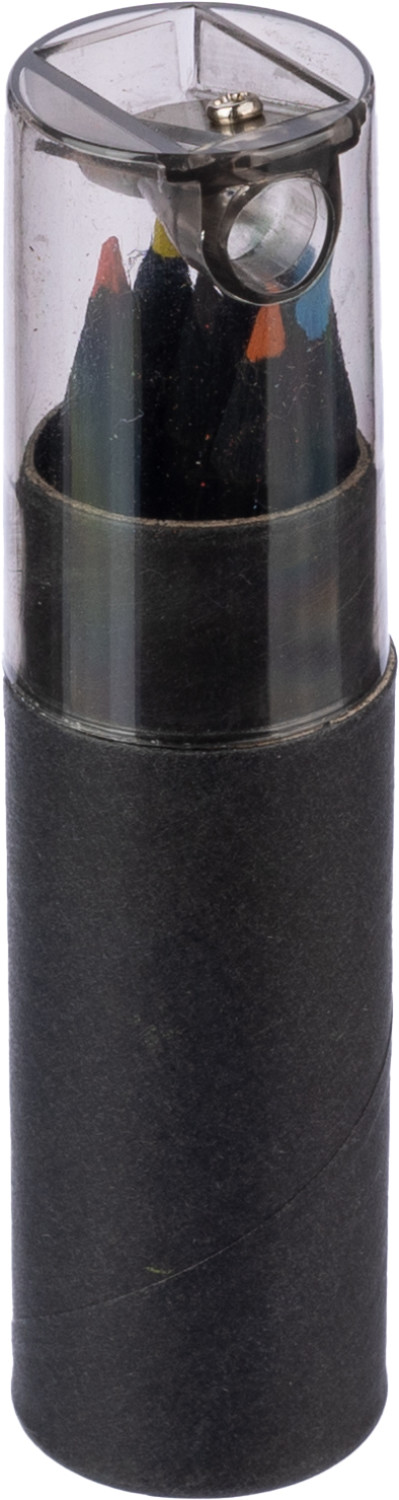 Recycelter Karton und ABS-Röhre mit 7 Buntstiften und einem in den Deckel integrierten Spitzer.