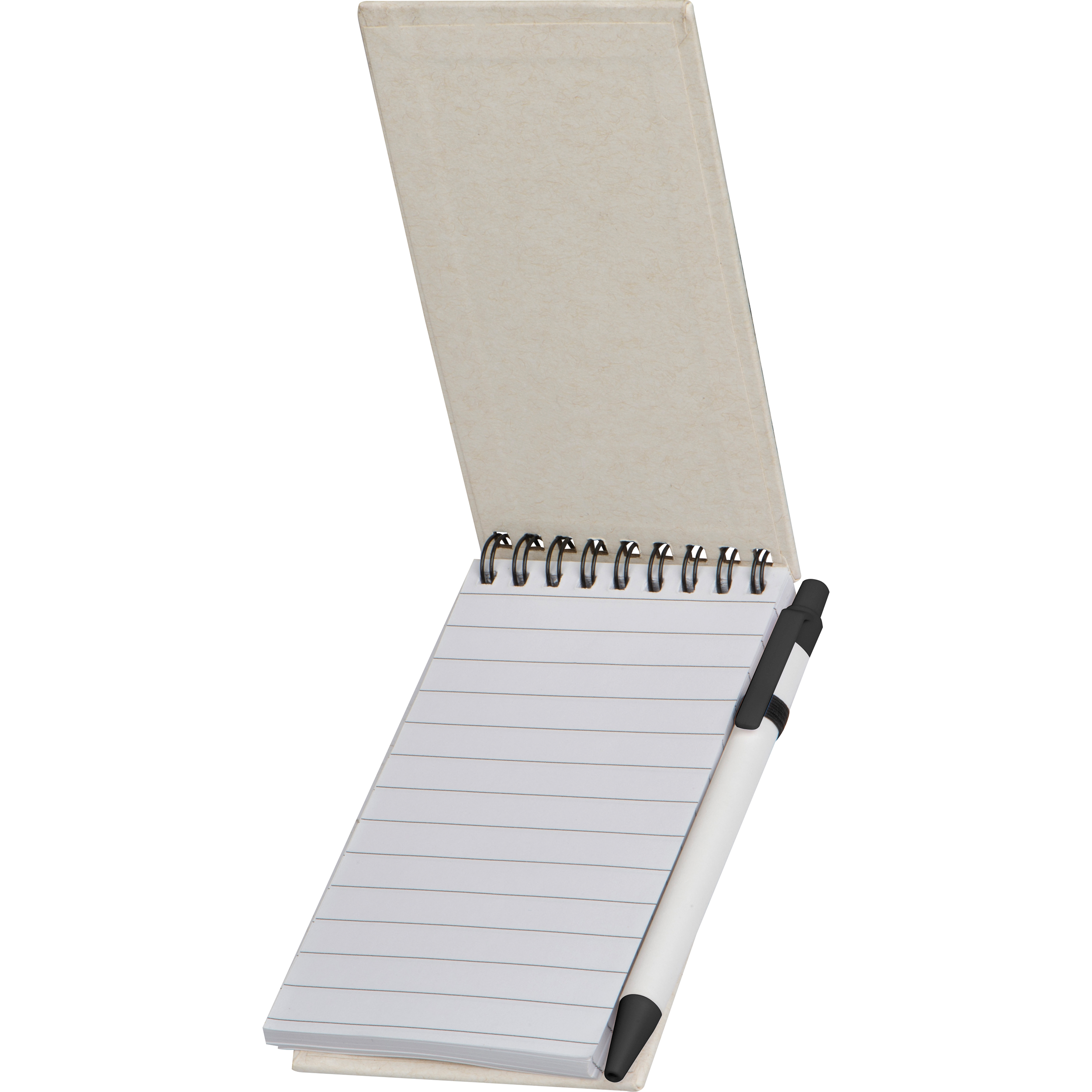 Spiralblock aus recyceltem Milchkarton mit 140 linierten Seiten, Gummiverschlussband, Kugelschreiberschlaufe und einem Papp-Kugelschreiber mit blauschreibender Kunststoffmine. Ihre Werbung drucken wir auf die Covervorderseite.