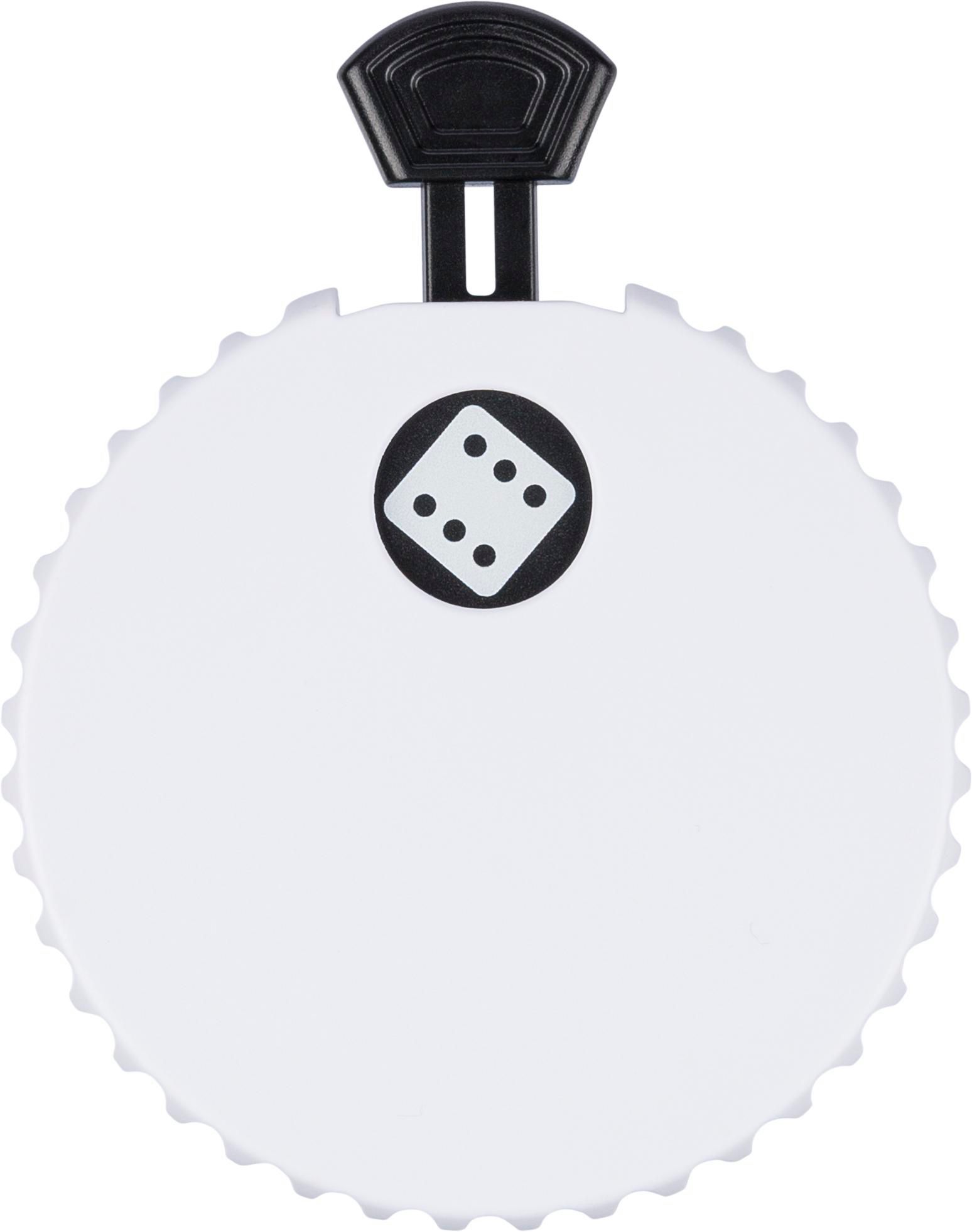 Mechanischer Würfel aus recyceltem ABS verfügt über einen Druckknopf auf seiner Oberseite. Durch Drücken wird der interne Mechanismus aktiviert und eine Zufallszahl zwischen 1 und 6 angezeigt. Auf der Rückseite befindet sich ein Flaschenöffner und ein kleines Recycelt (ABS)-Logo. Der Würfel ist in einem recycelten Polybeutel verpackt.