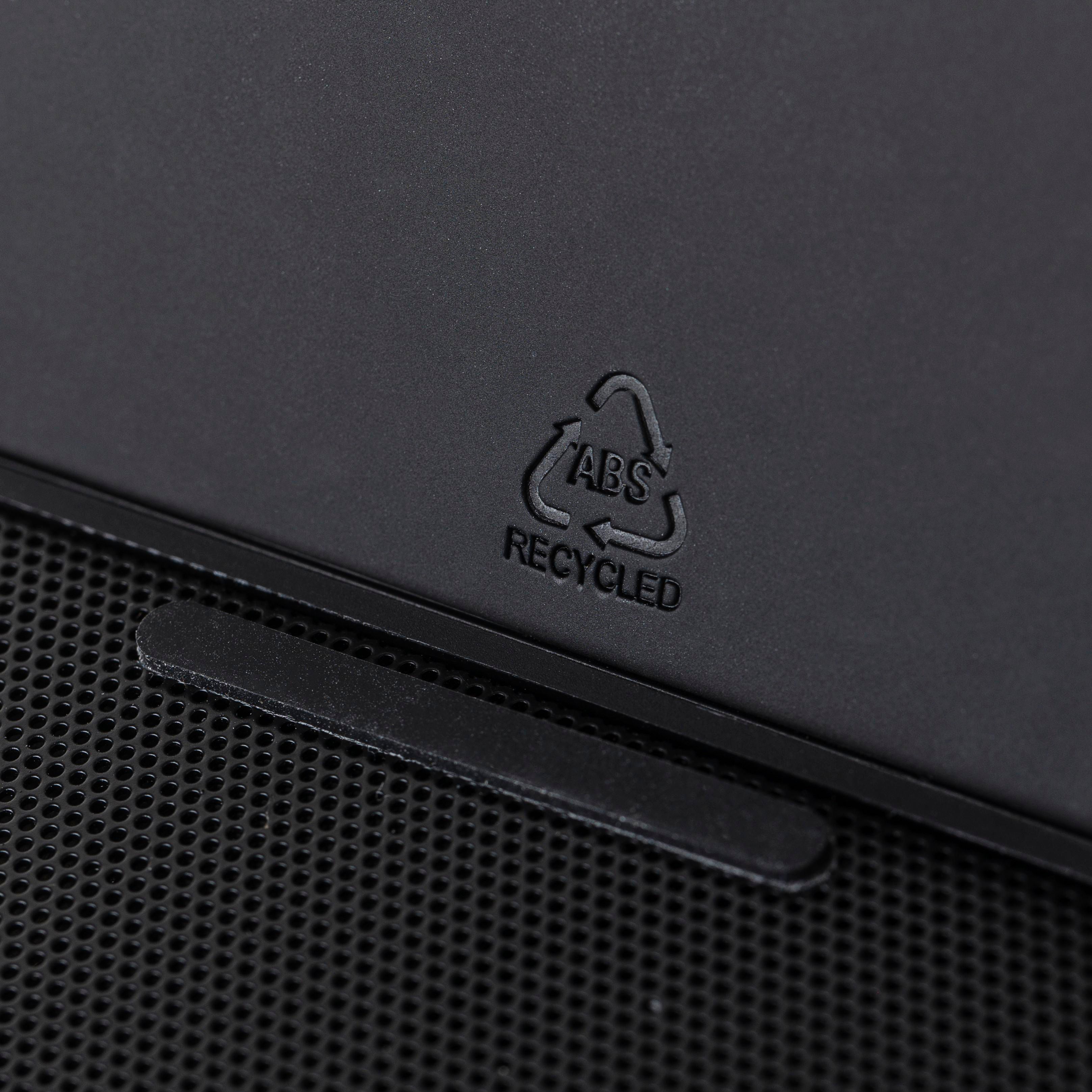 3-in-1-Wireless-Ladegerät, Lautsprecher und Handyhalterung aus recyceltem ABS in würfelförmigem Design. Mit 15-W-Schnellladefunktion, 5-W-Lautsprecherfunktion und Wireless-Connection-Technologie Version 5.4. Mit 1200-mAh-Akku, Metallgitterfront und recyceltem PU-Detail auf der Oberseite. Eingang: 5 V/500 mA. Mit Recycling-Logo gekennzeichnet. Einzeln verpackt in einem braunen Karton.