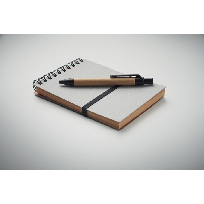 Notizbuch mit Cover aus Recyclingpapier und PU (70% Recyclingpapier, 30% PU). Spiralbindung. 70 Blatt (140 Seiten) liniertes Recyclingpapier. Elastisches Verschlussband und Stiftschlaufe. Inkl. Druckkugelschreiber aus Recyclingpapier / ABS. Blaue Tinte. FSC®-certified | FSC MIX CREDIT, P7.1, FSC-C213206