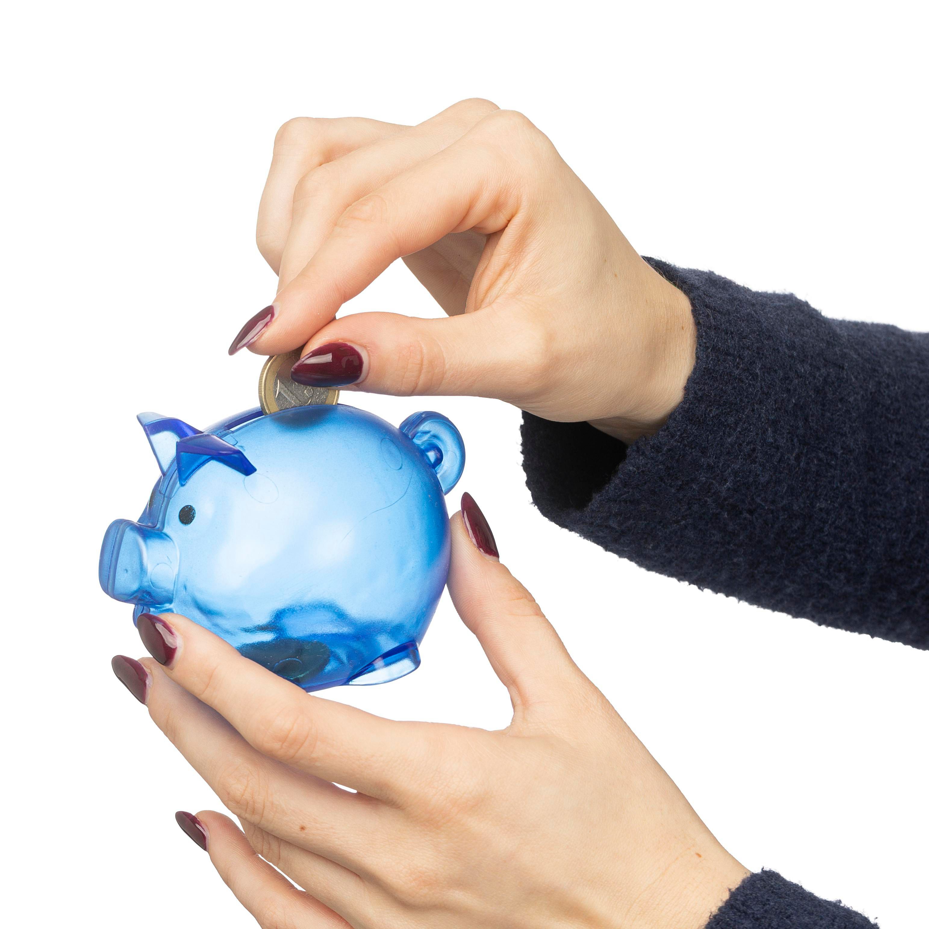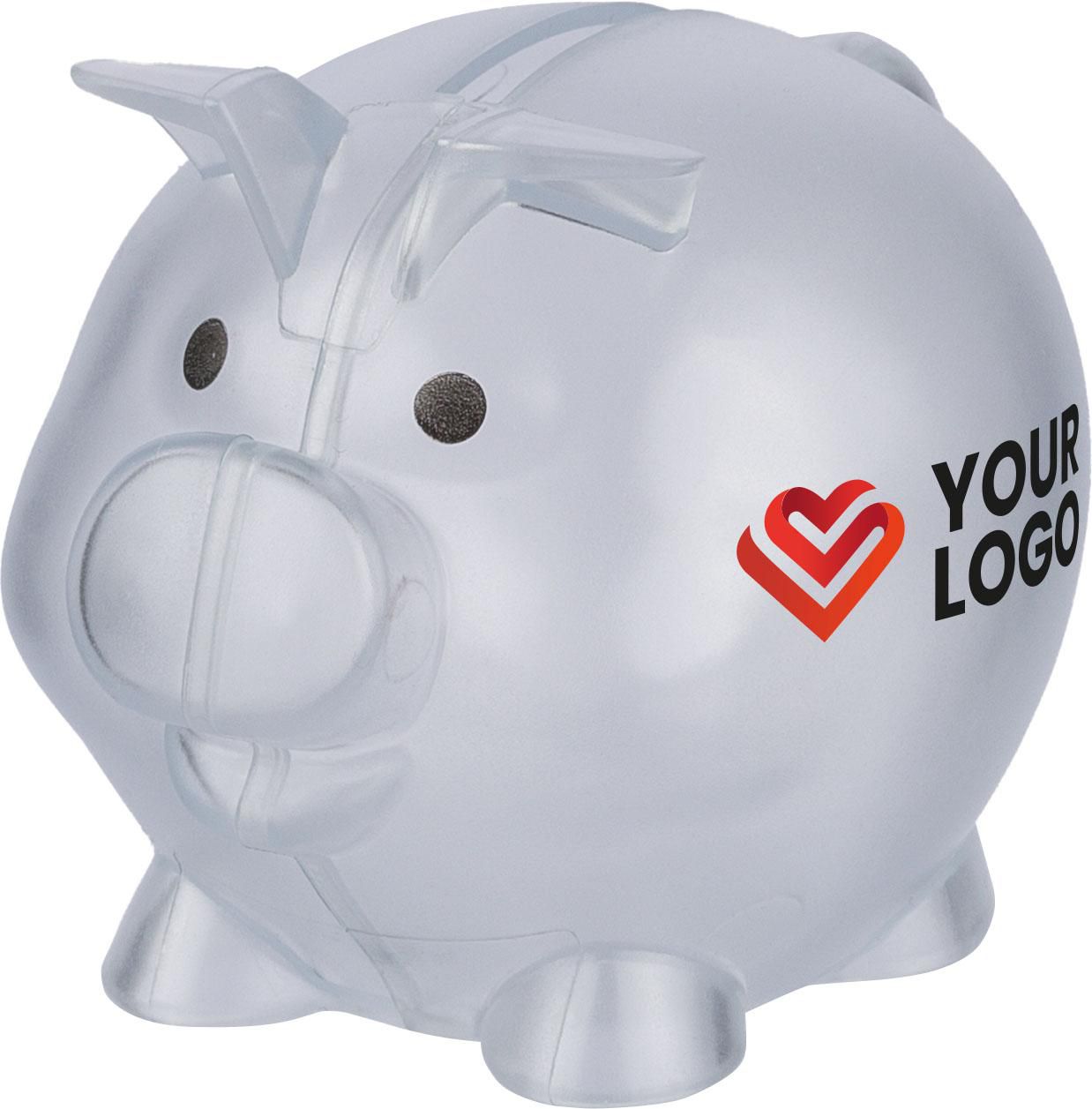 Sparschwein aus recyceltem PS-Kunststoff gefertigt. Es ist transparent und trägt auf der Rückseite ein Recycling-Logo.