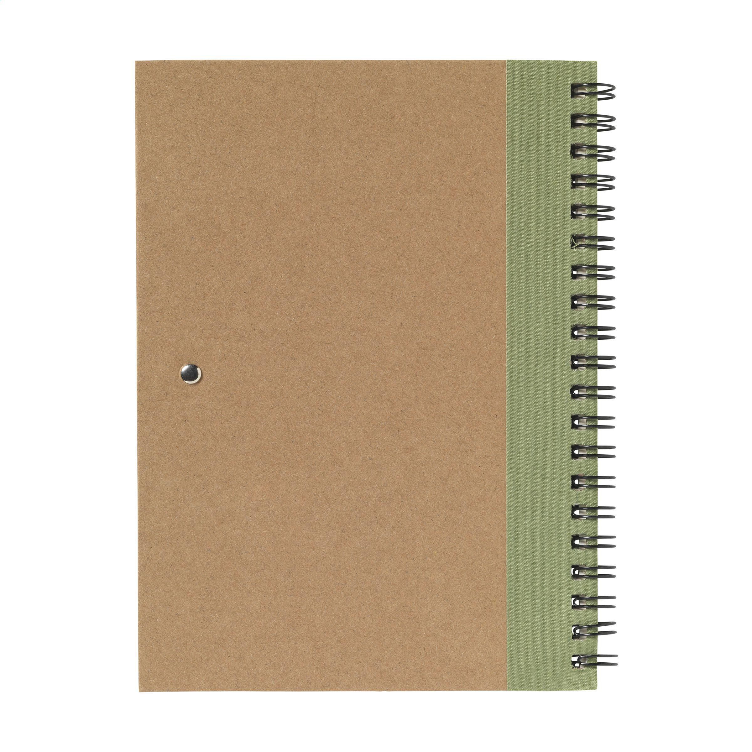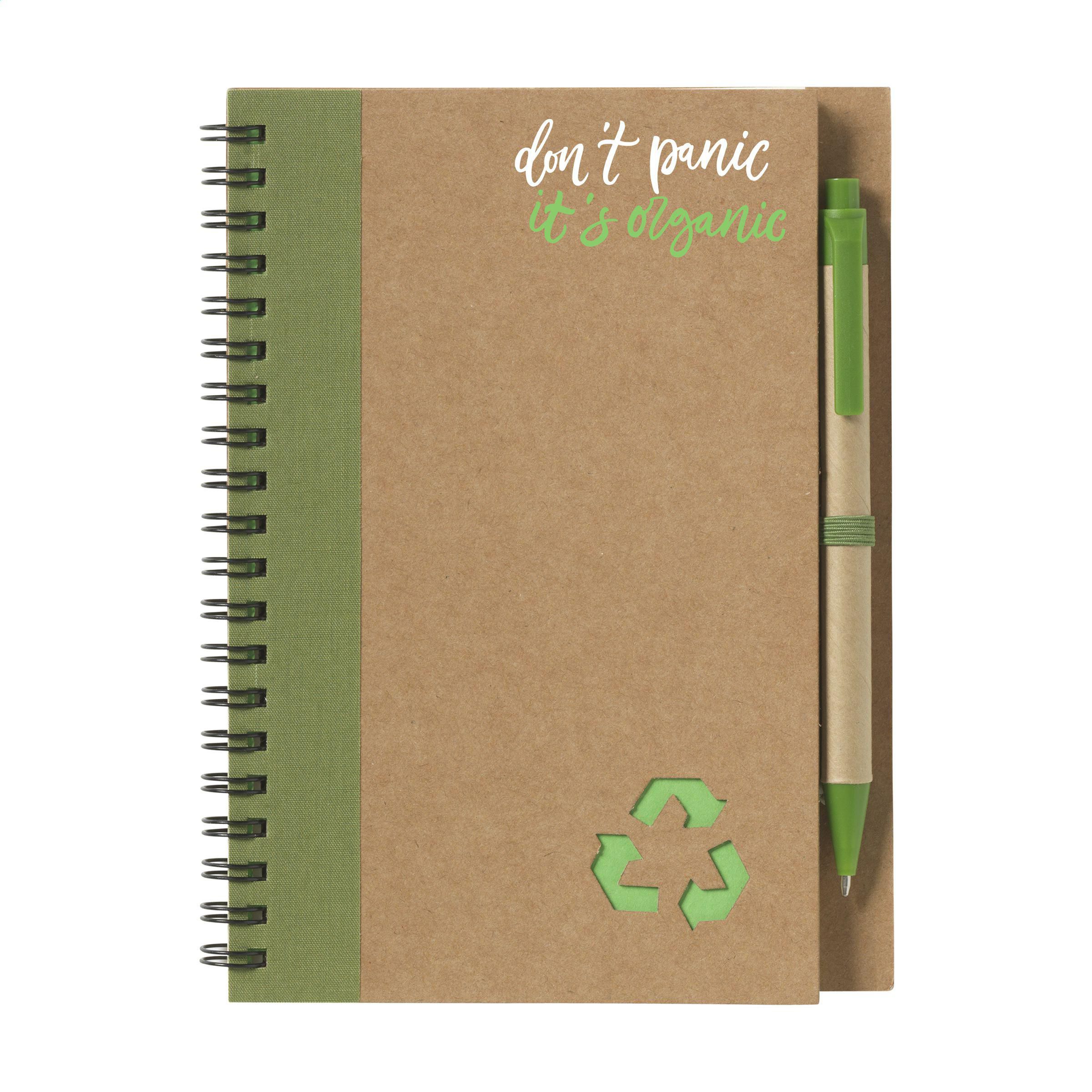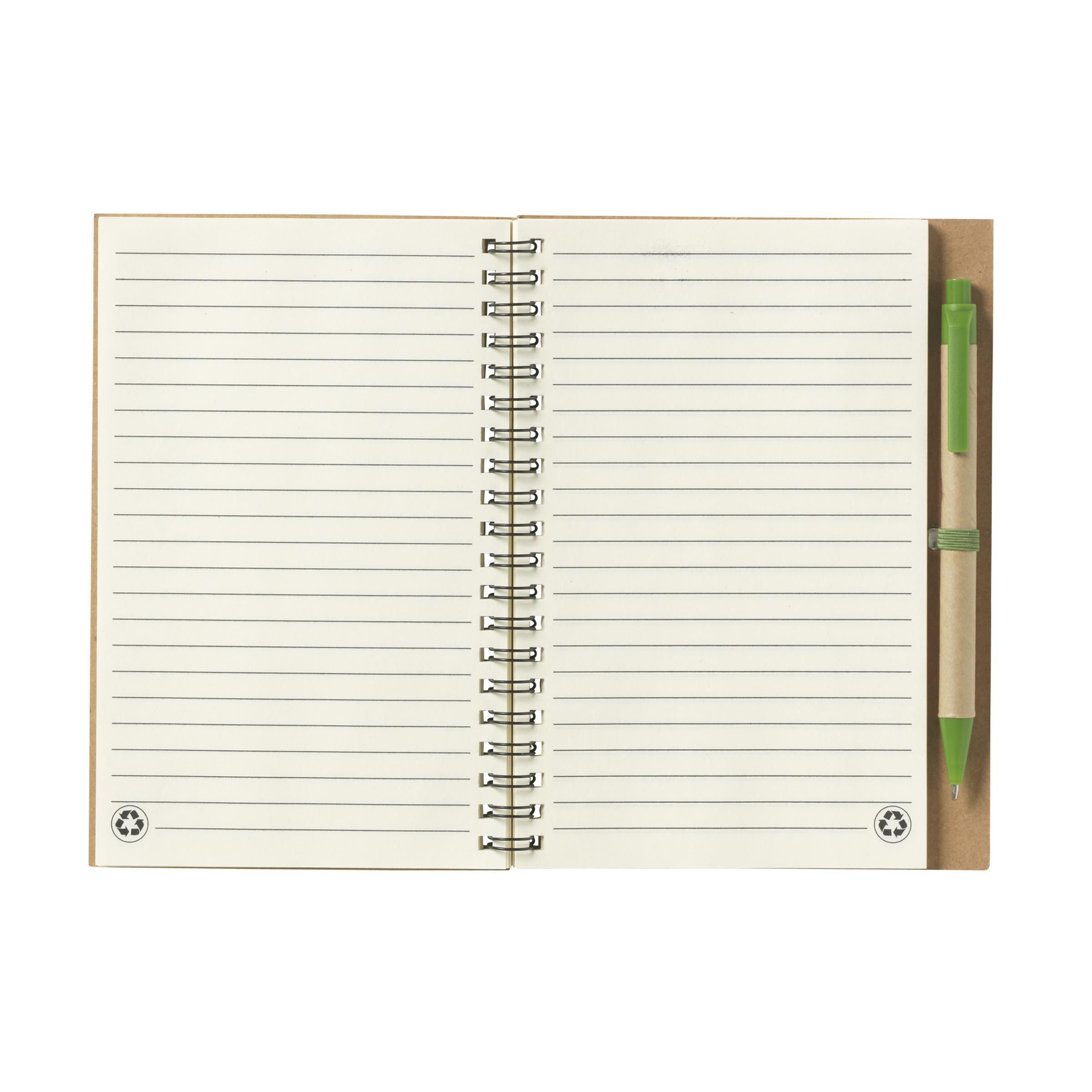 Notizbuch aus recyceltem Material mit ca. 70 Blatt/140 Seiten cremefarbenem, liniertem Papier (70 g/m²) und kartoniertem Umschlag. Gebunden in einer starken, metallenen Spiralbindung. Inkl. blauschreibendem Kugelschreiber. FSC Mix zertifiziert.