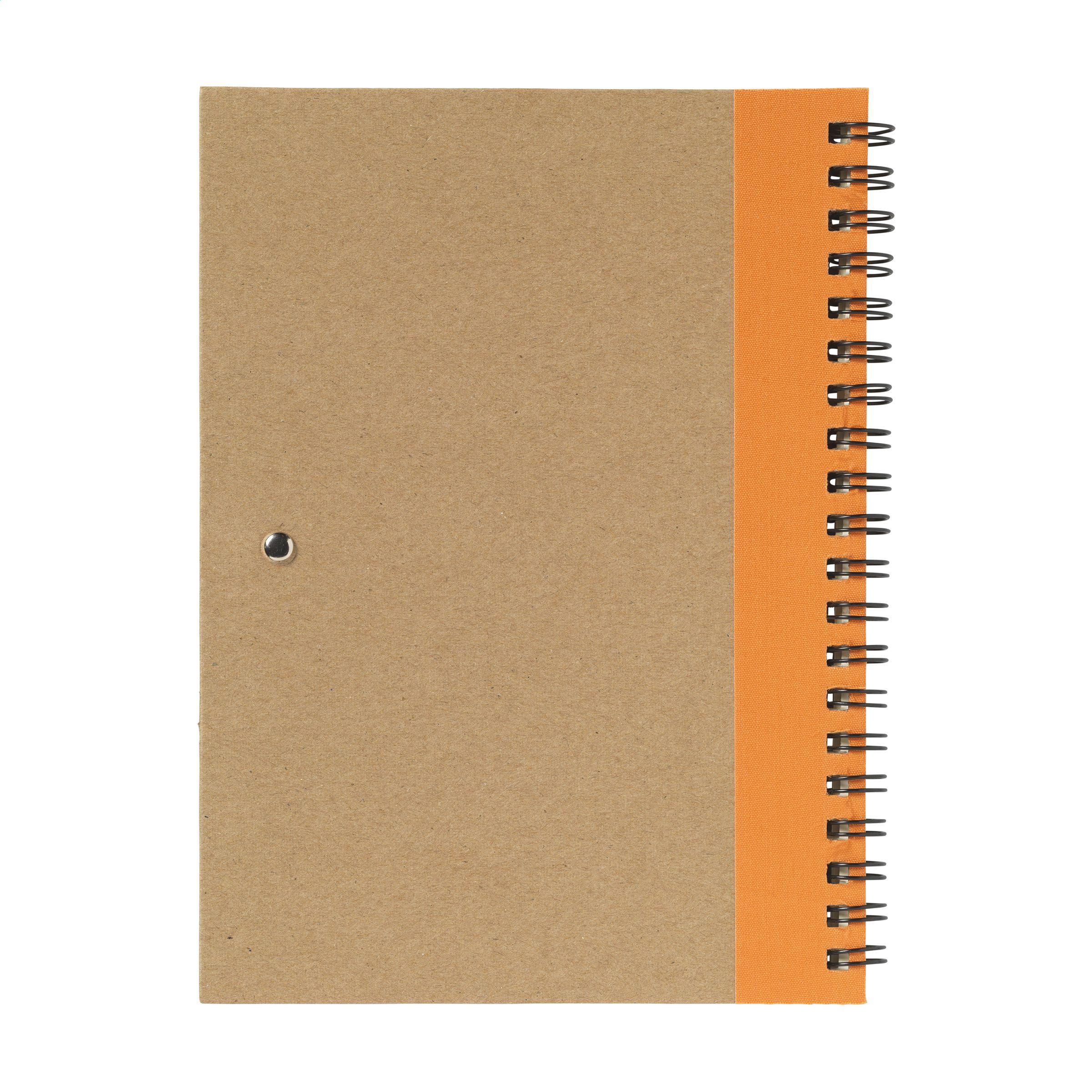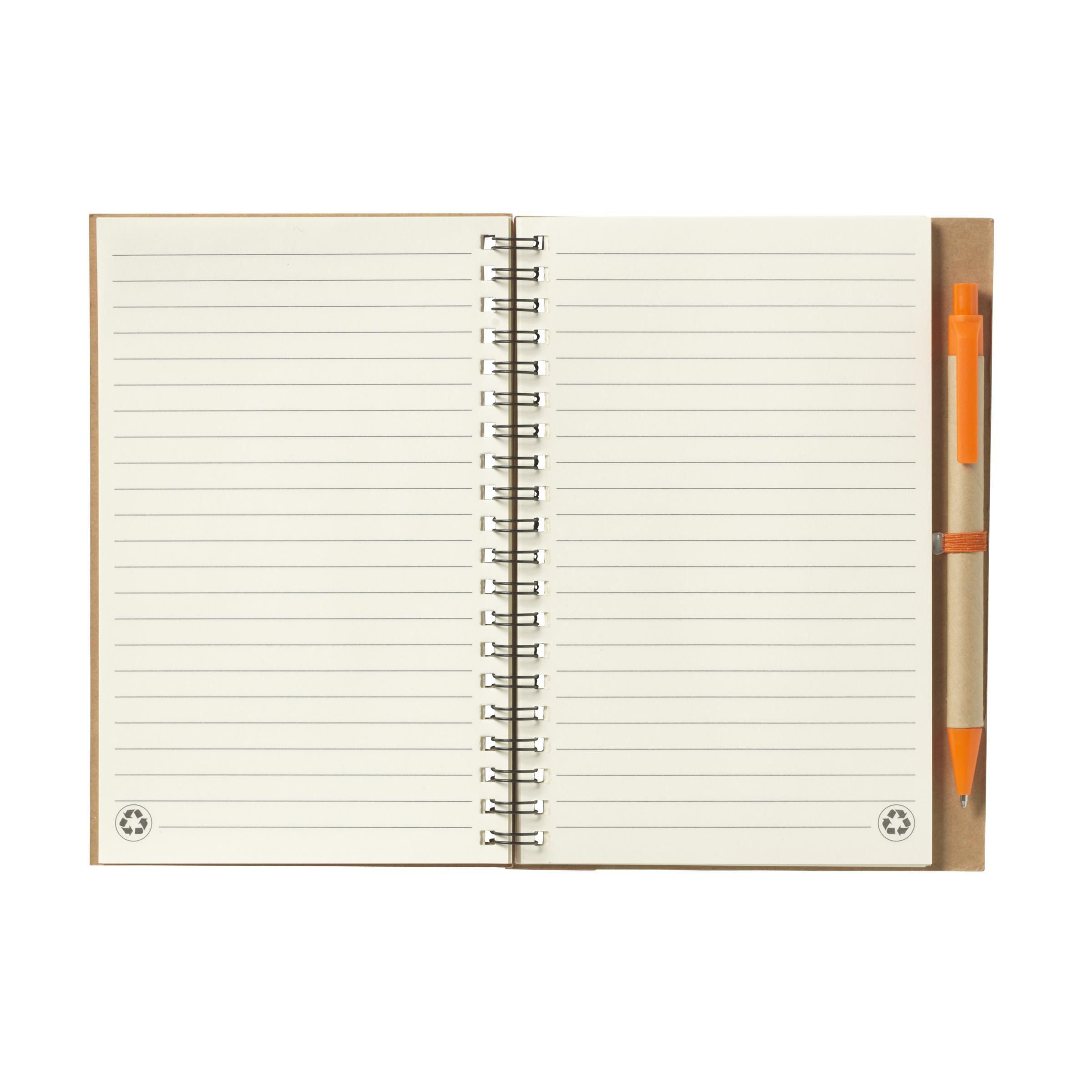 Notizbuch aus recyceltem Material mit ca. 70 Blatt/140 Seiten cremefarbenem, liniertem Papier (70 g/m²) und kartoniertem Umschlag. Gebunden in einer starken, metallenen Spiralbindung. Inkl. blauschreibendem Kugelschreiber. FSC Mix zertifiziert.