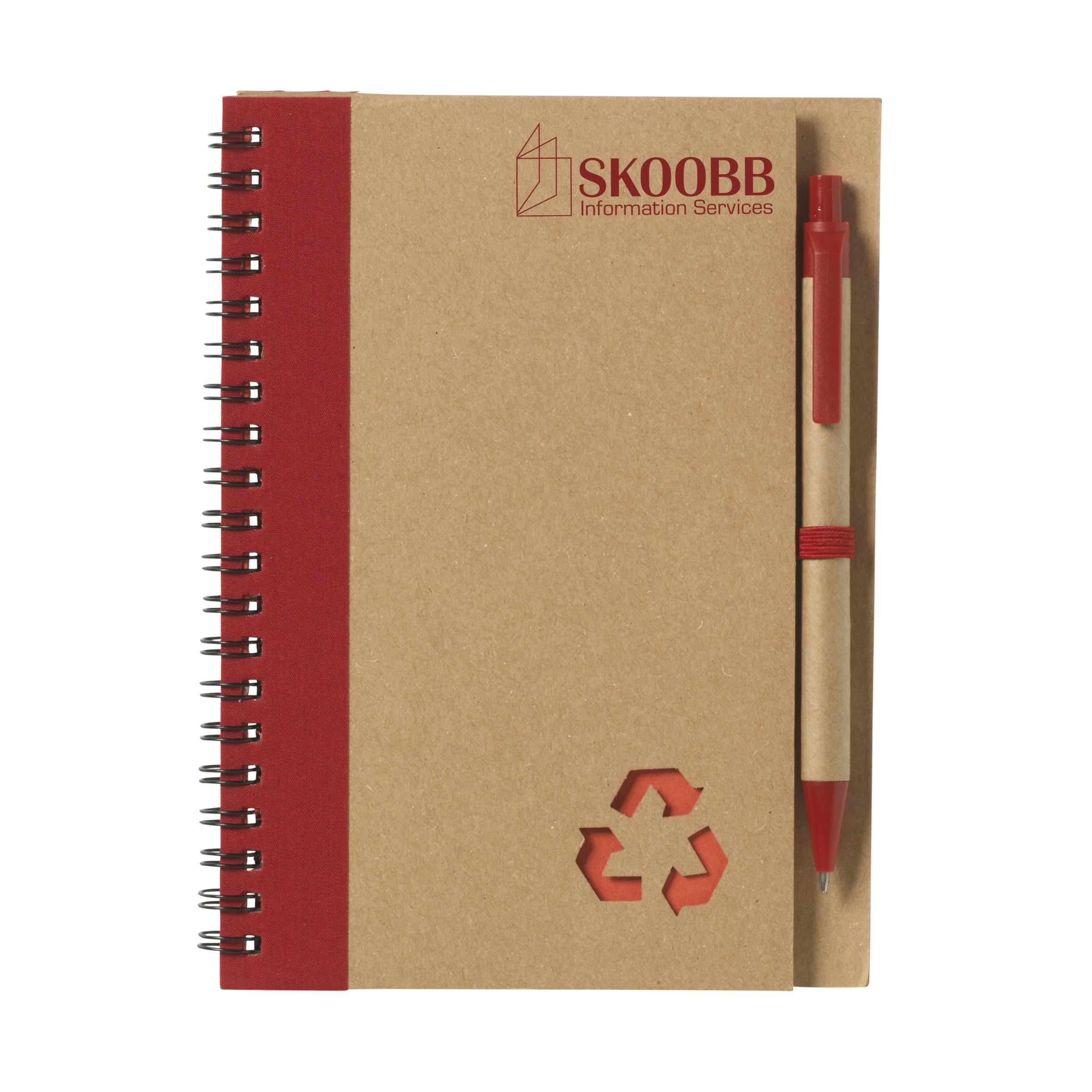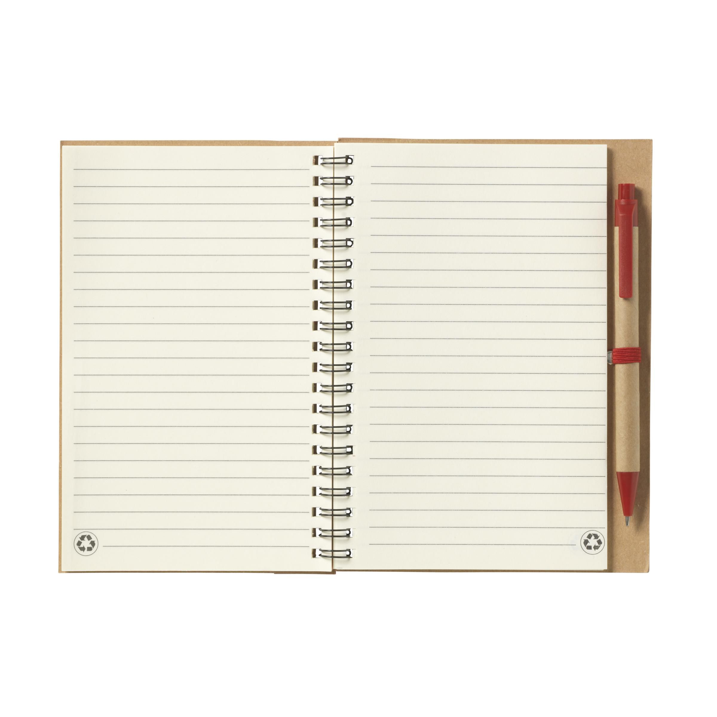Notizbuch aus recyceltem Material mit ca. 70 Blatt/140 Seiten cremefarbenem, liniertem Papier (70 g / m²), kartoniertem Umschlag. Gebunden in einer starken, metallenen Spiralbindung. Inkl. blauschreibendem Kugelschreiber.