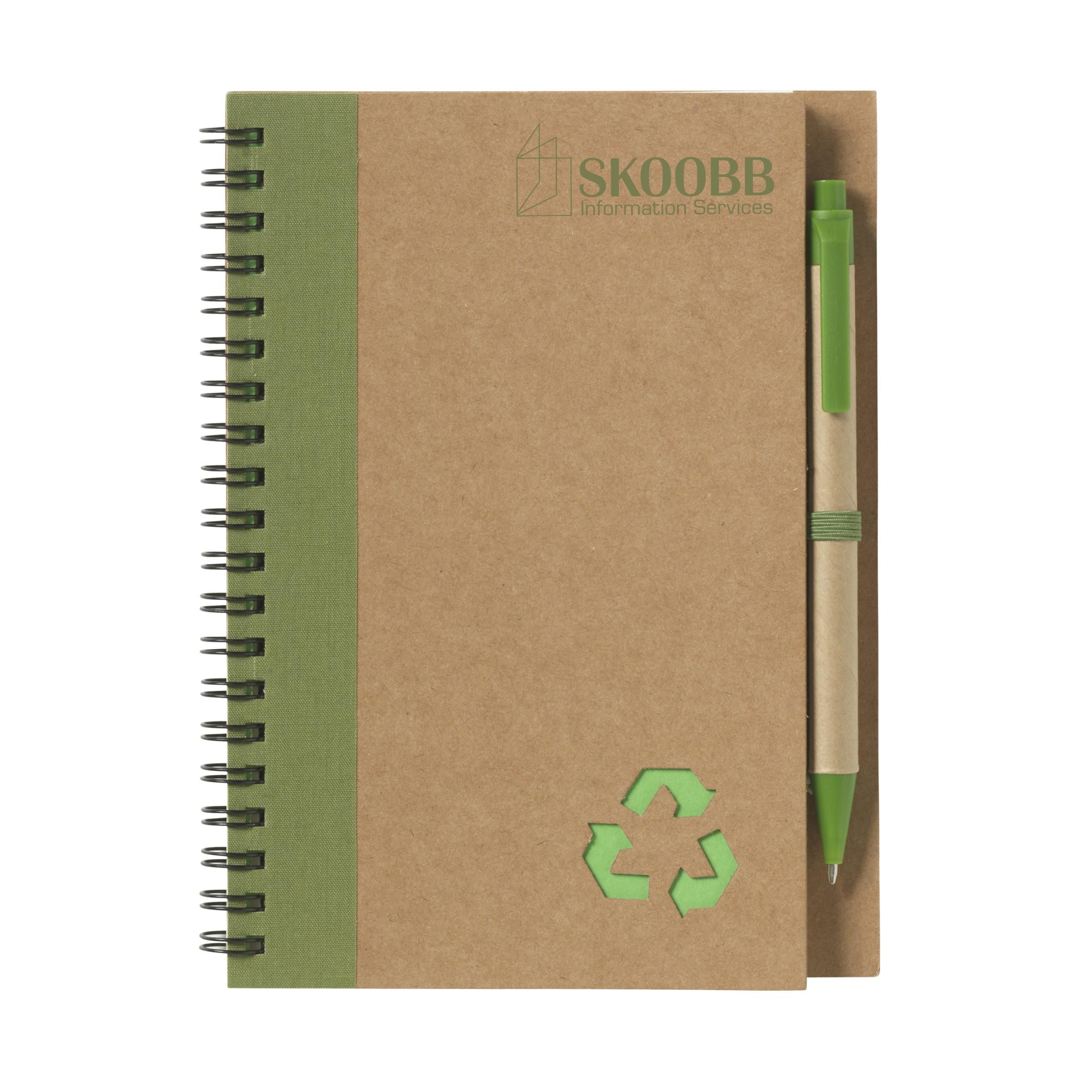 Notizbuch aus recyceltem Material mit ca. 70 Blatt/140 Seiten cremefarbenem, liniertem Papier (70 g / m²), kartoniertem Umschlag. Gebunden in einer starken, metallenen Spiralbindung. Inkl. blauschreibendem Kugelschreiber.