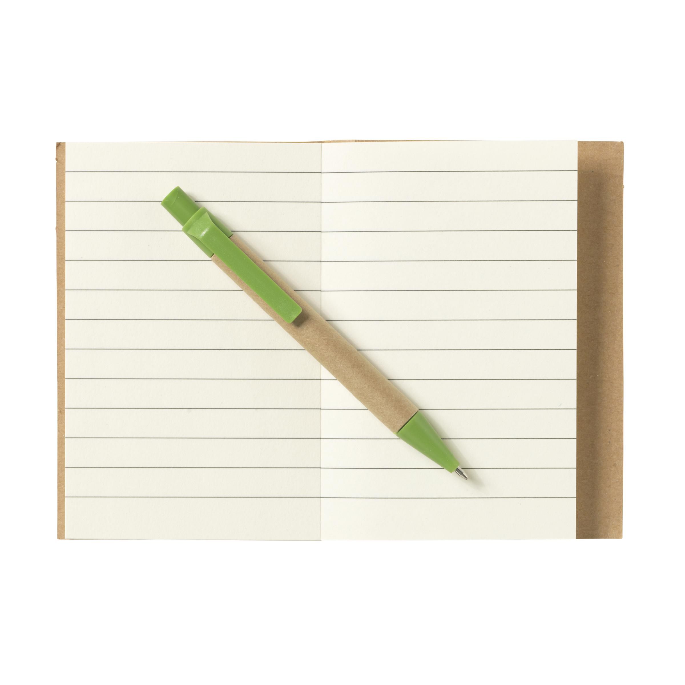 Mininotizbuch aus recyceltem Material mit ca. 80 Blatt cremefarbenem, liniertem Papier, Pappumschlag und gebundenem Rücken. Inkl. blauschreibendem Kugelschreiber.