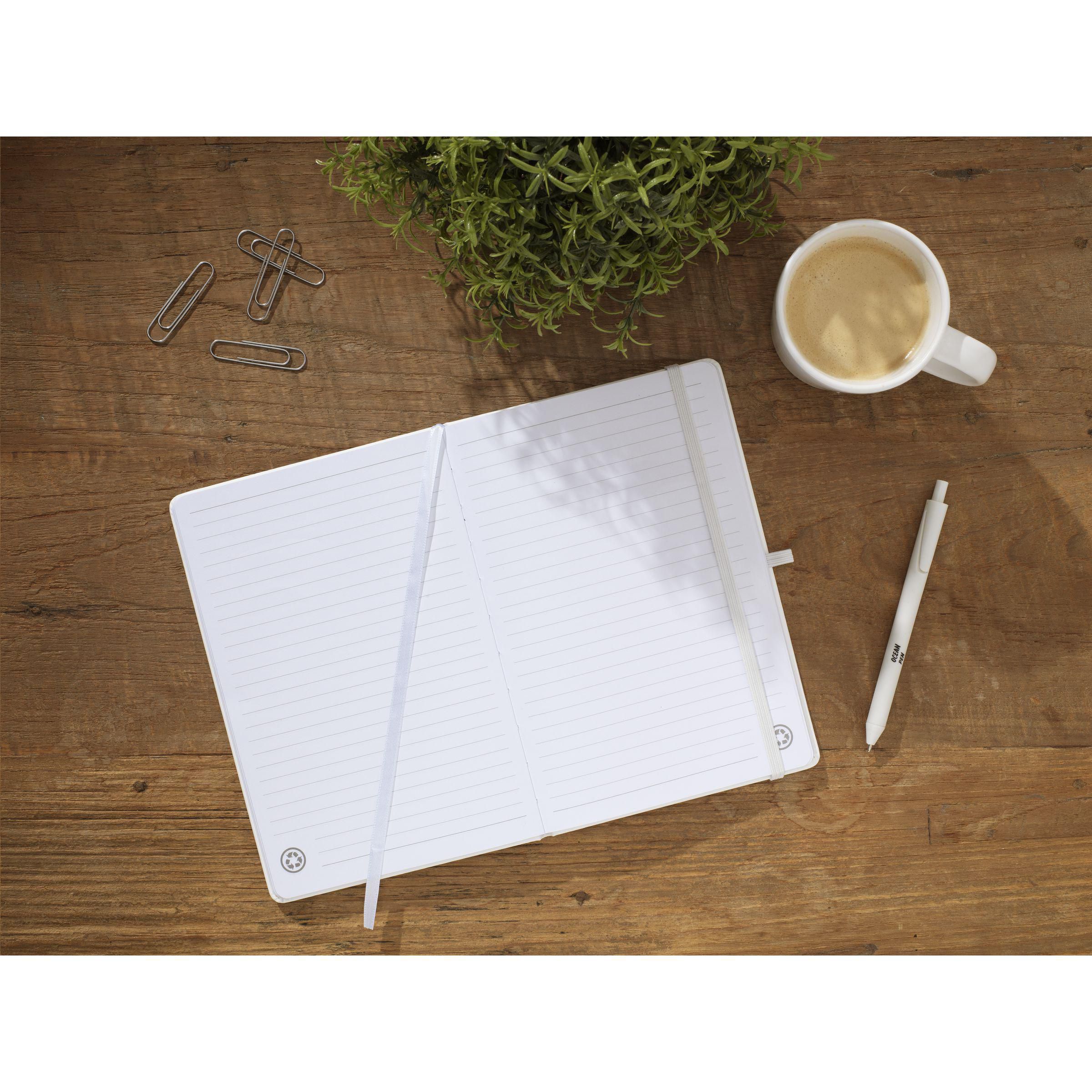 A5-Notizbuch mit Hardcover aus recyceltem PU und ca. 96 Blatt/192 Seiten weißem, liniertem, GRS-zertifiziertem Papier (70 g/m²). Mit gebundenem Rücken, Verschlussgummiband und Seidenleseband. GRS-zertifiziert. Recyceltes Material insgesamt: 93%.
