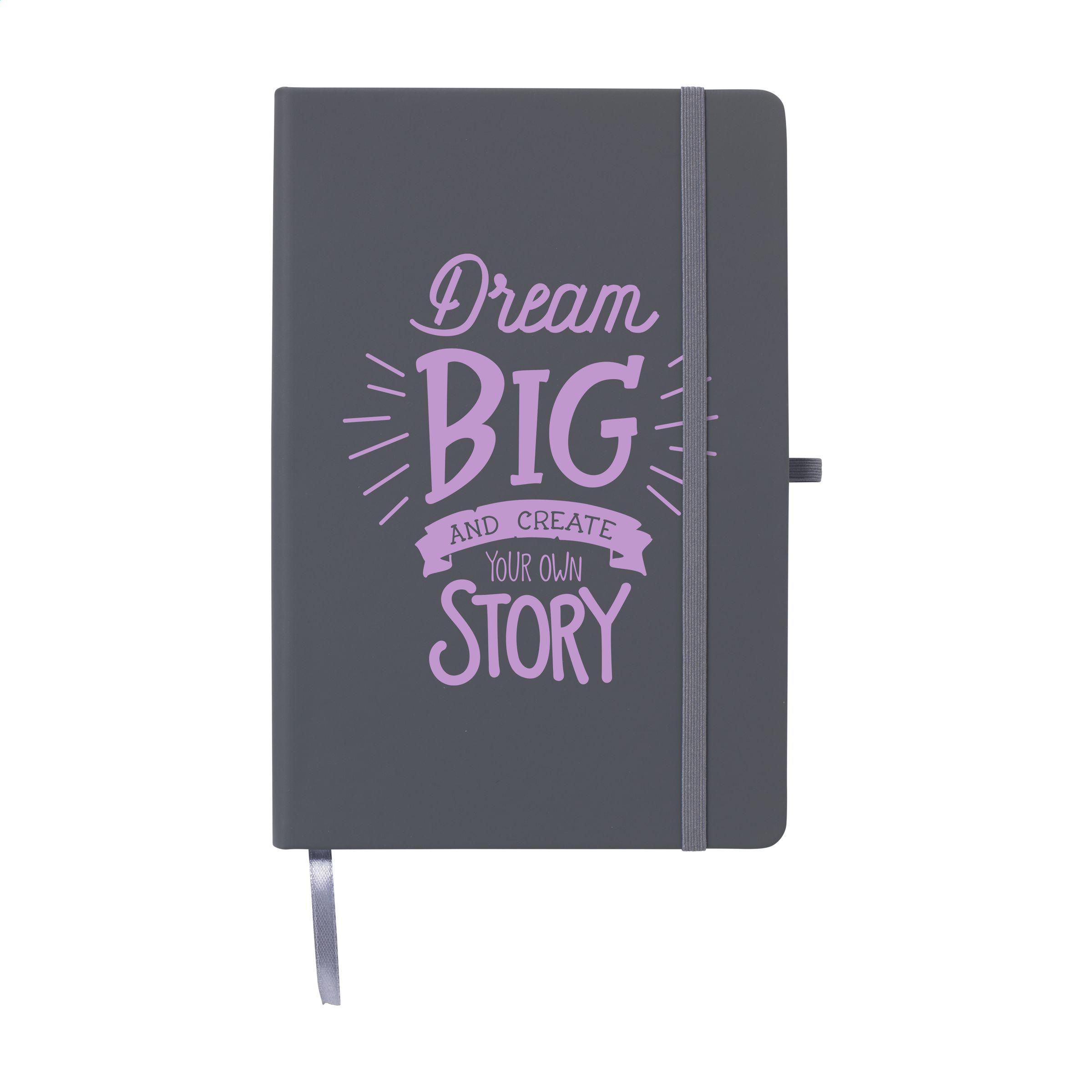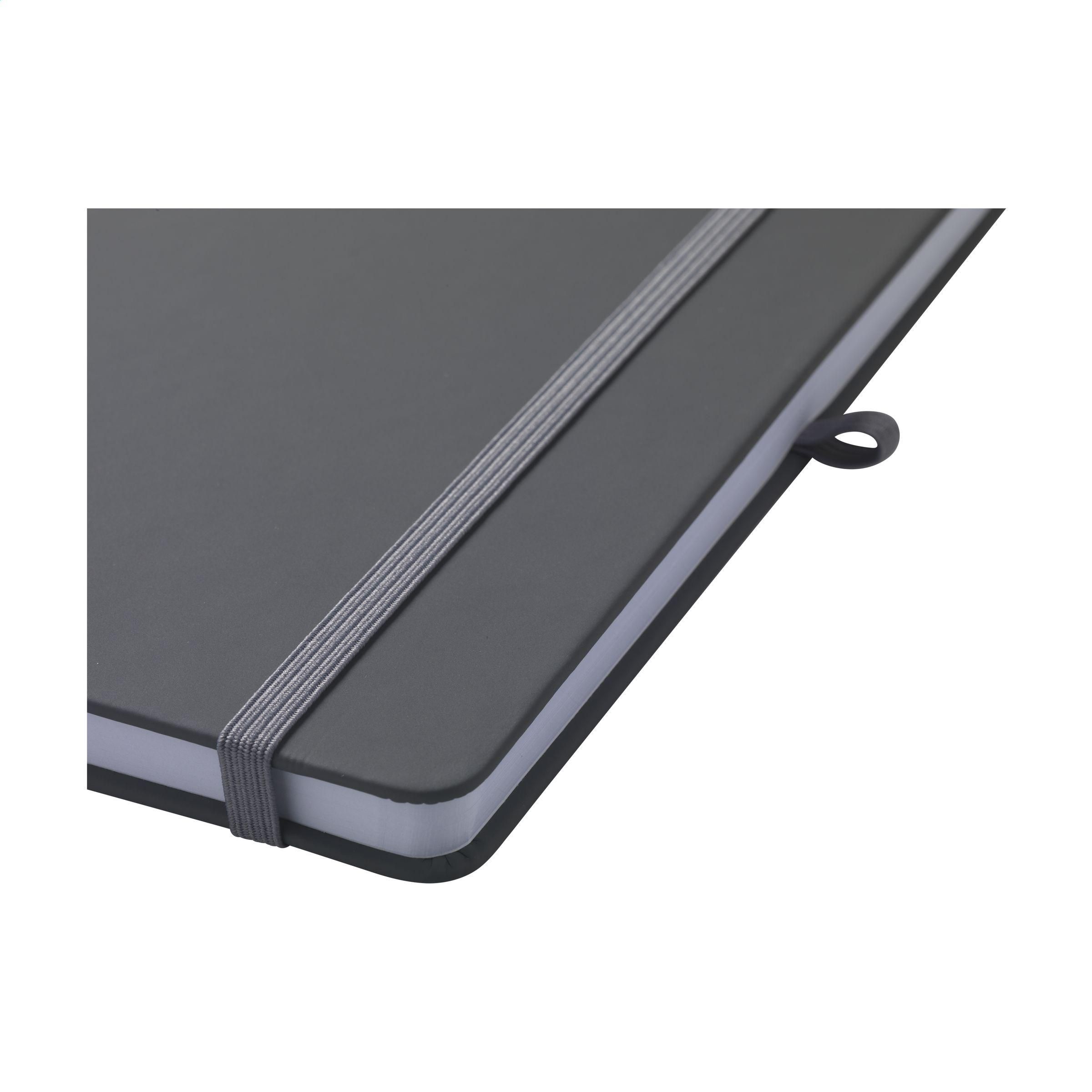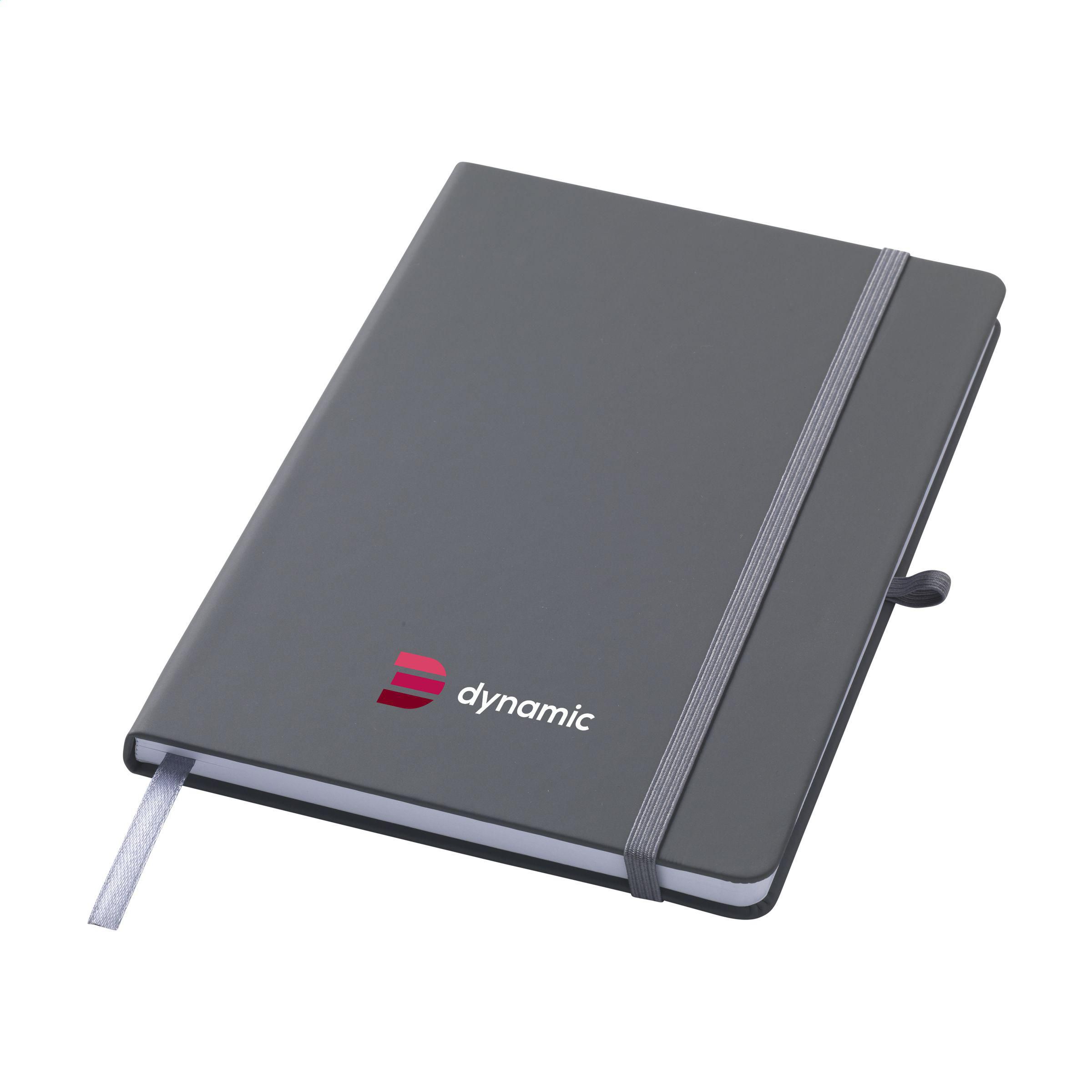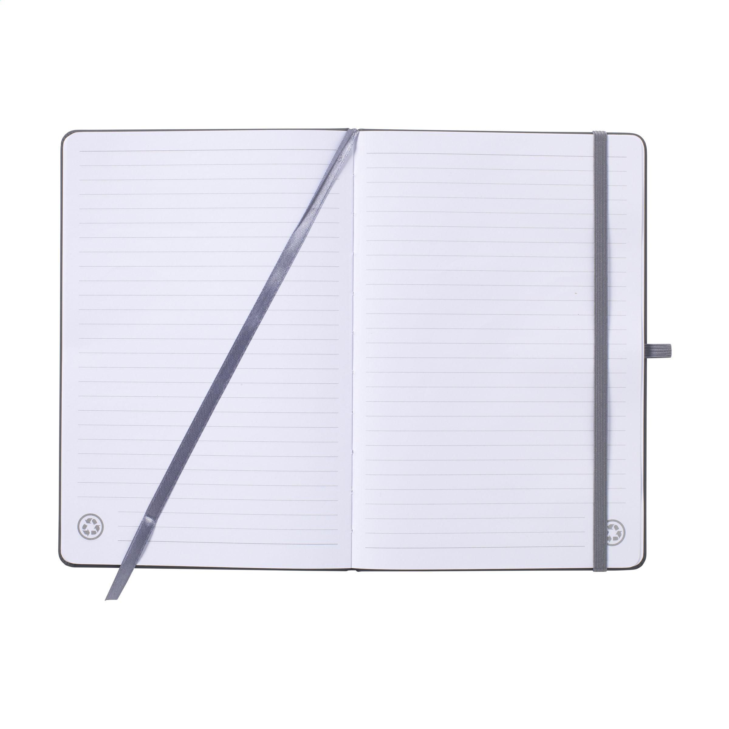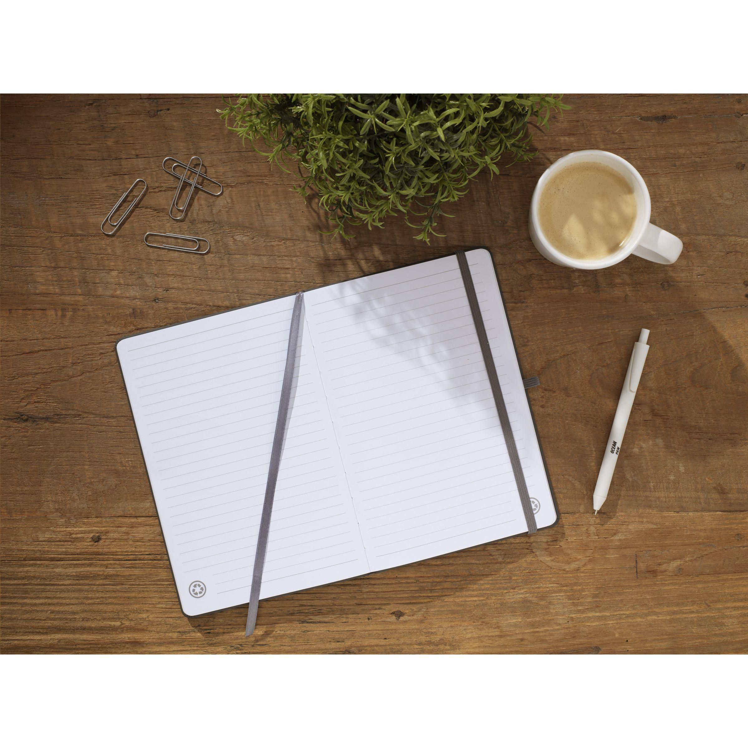 A5-Notizbuch mit Hardcover aus recyceltem PU und ca. 96 Blatt/192 Seiten weißem, liniertem, GRS-zertifiziertem Papier (70 g/m²). Mit gebundenem Rücken, Verschlussgummiband und Seidenleseband. GRS-zertifiziert. Recyceltes Material insgesamt: 93%.