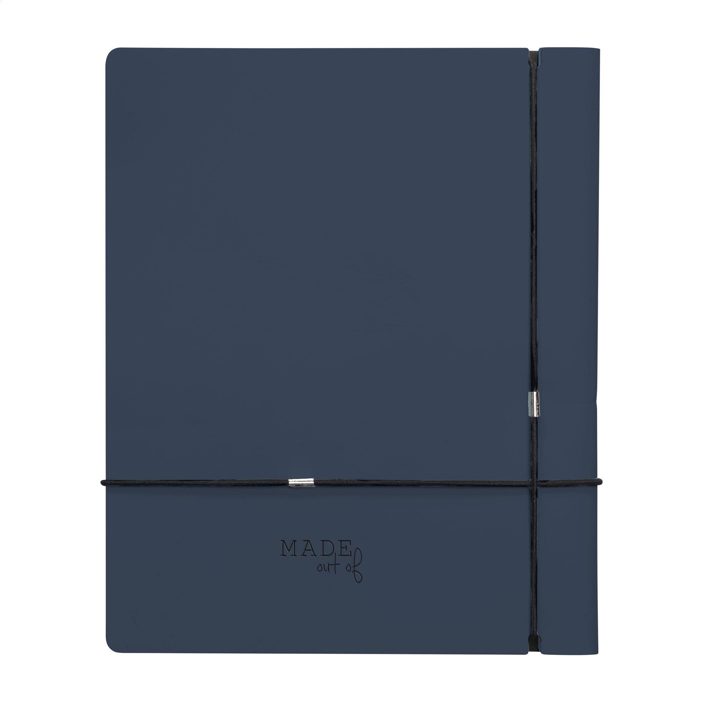 A5-Notizbuch mit Einband aus recycelten italienischen Lederabfällen und natürlichen Bindemitteln. Ein Produkt der Marke MADE out of. Das recycelte Leder ist sehr robust, hat ein wunderschönes mattes Aussehen und riecht nach Leder. Die farbige Deckschicht besteht aus einer sehr dünnen PU-Beschichtung auf 100%iger Wasserbasis. Der herausnehmbare, nachfüllbare Inhalt (Reuse & Reduce) dieses Notizbuchs mit Verschlussgummi besteht aus ca. 120 Blatt/240 Seiten liniertem, recyceltem Papier (90 g/m²). Der Inhalt wird mit einem stabilen Gummiband an Ort und Stelle gehalten. Handgefertigt. Niederländisches Design. Hergestellt in den Niederlanden. Made Out Of ist B-Corp-zertifiziert; die Kollektion wird nach den höchstmöglichen ökologischen und sozialen B-Corp-Standards hergestellt.