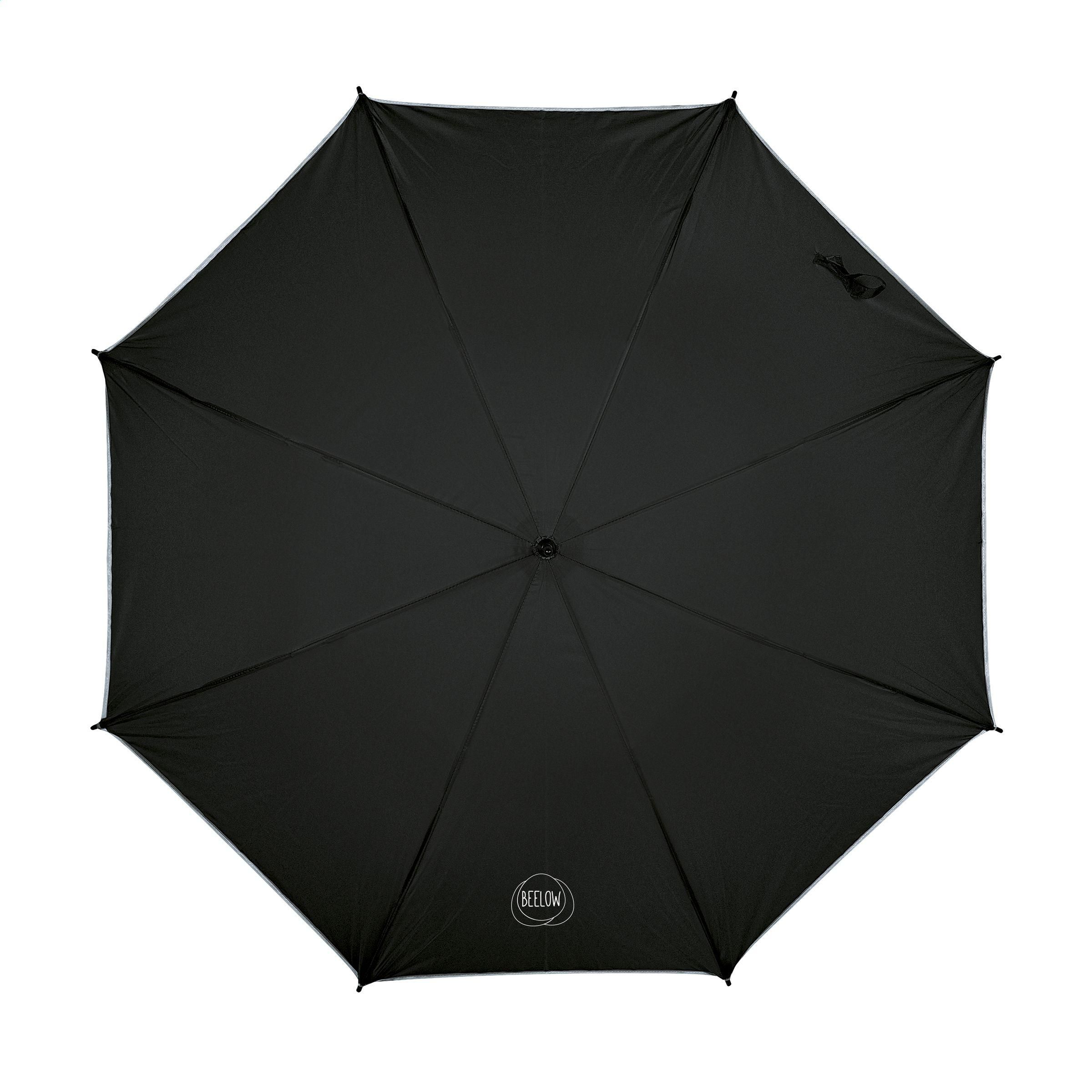 Leichter Sturmschirm mit reflektierenden Streifen, 190T Polyesterbespannung, Glasfasergestell, Metallschaft, weichem Handgriff und Klettverschluss.