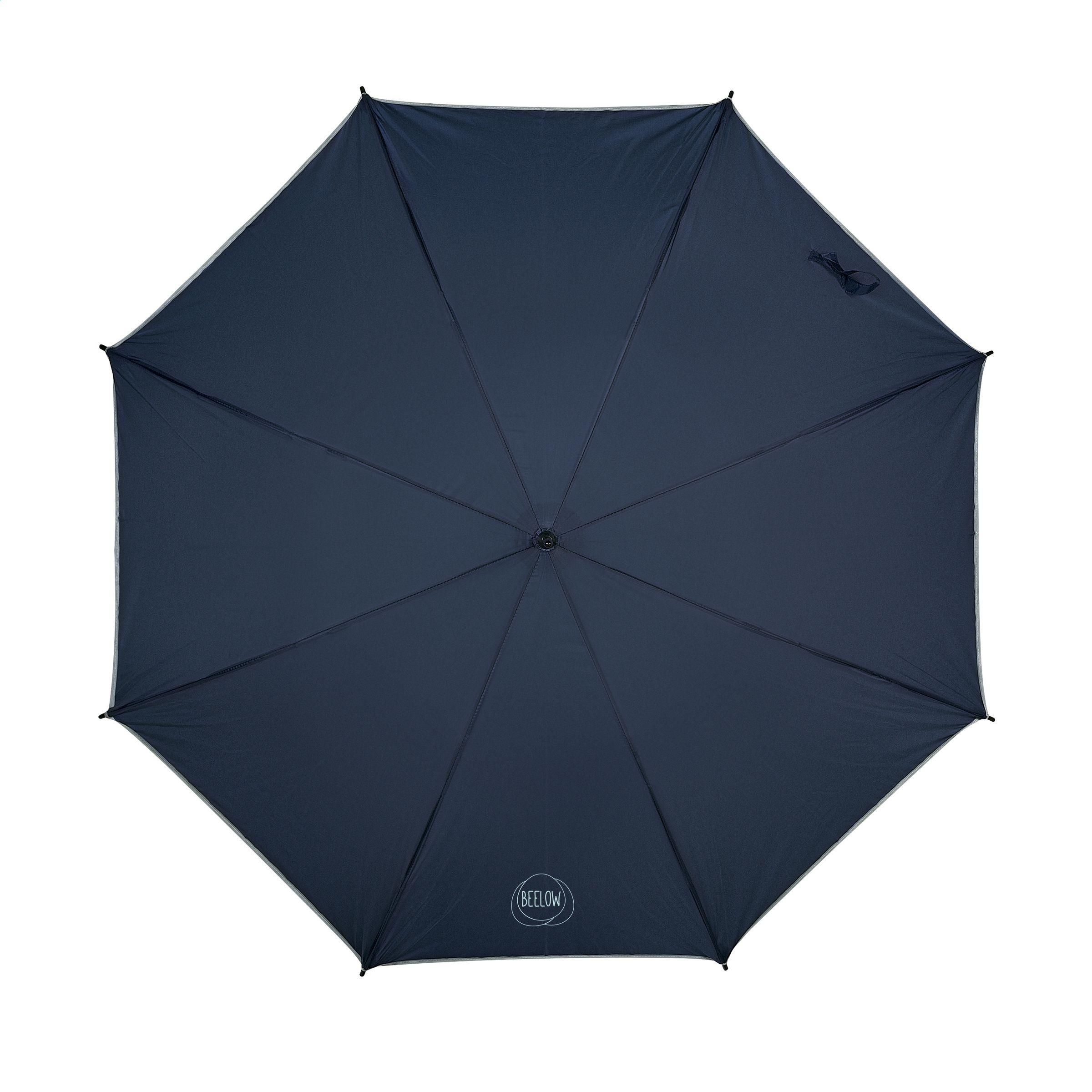 Leichter Sturmschirm mit reflektierenden Streifen, 190T Polyesterbespannung, Glasfasergestell, Metallschaft, weichem Handgriff und Klettverschluss.