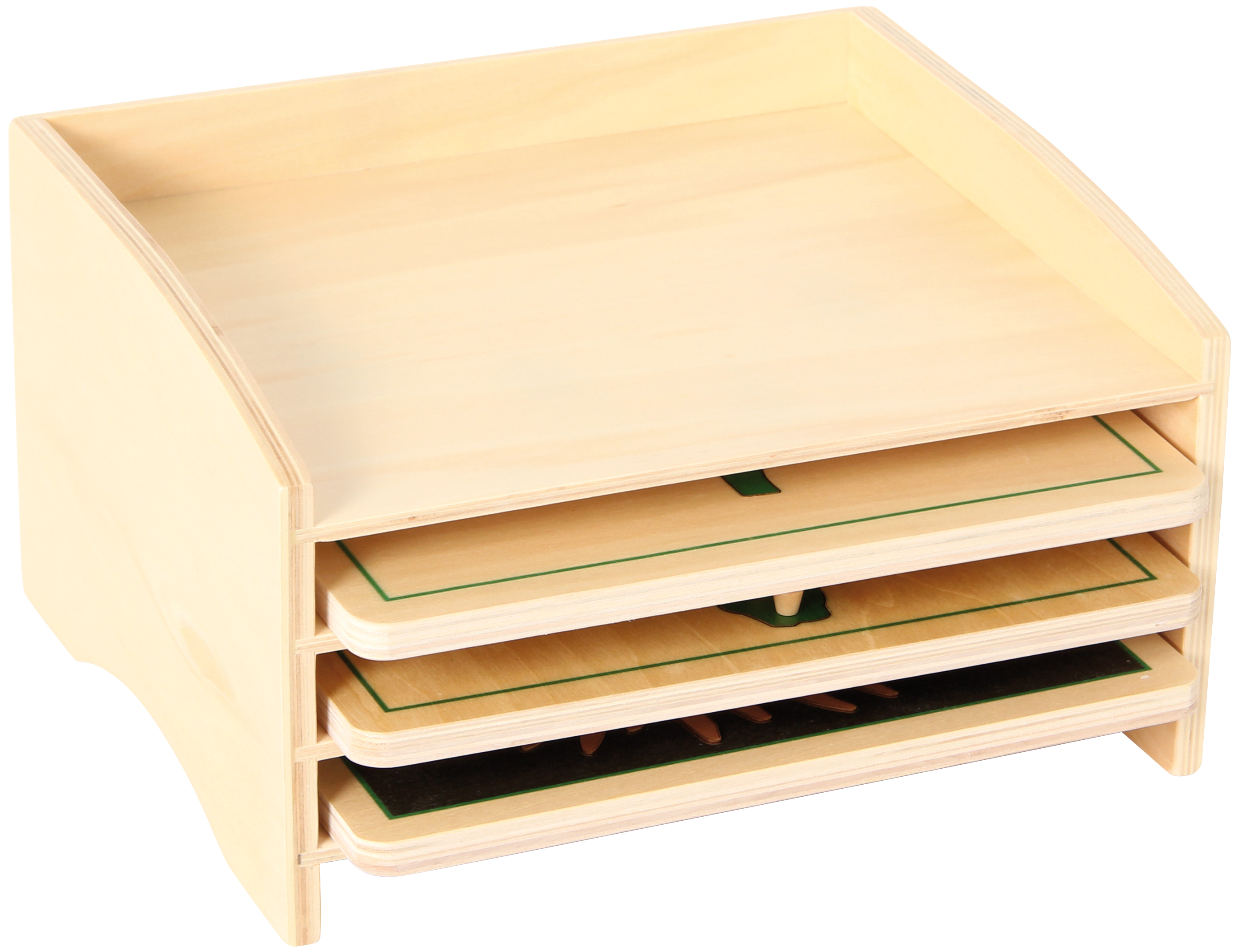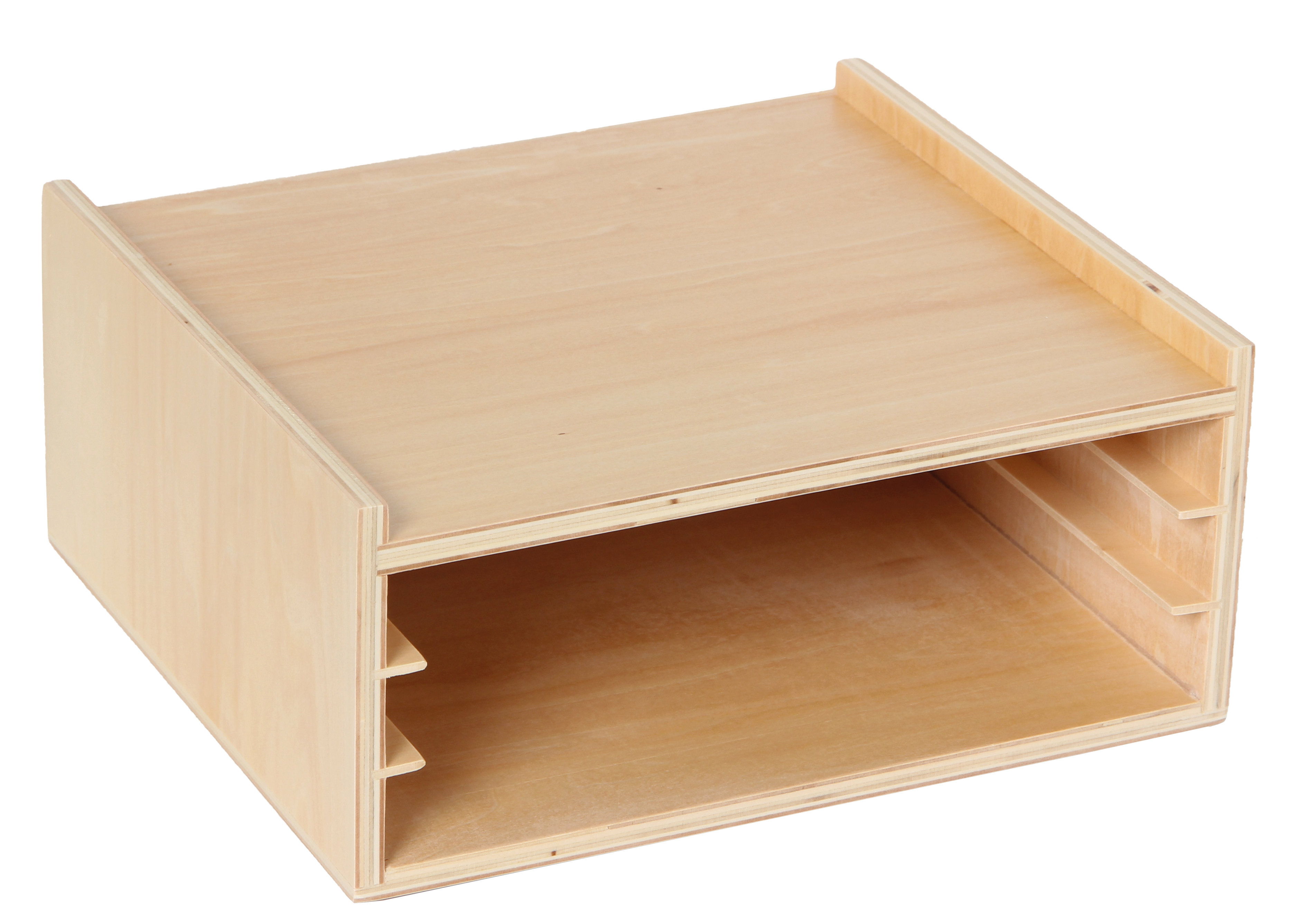 Holzregal mit drei Fächern für die Botanischen Puzzles, Art.-Nr. 109714. Leer. Größe: 26 x 25 x 9 cm.