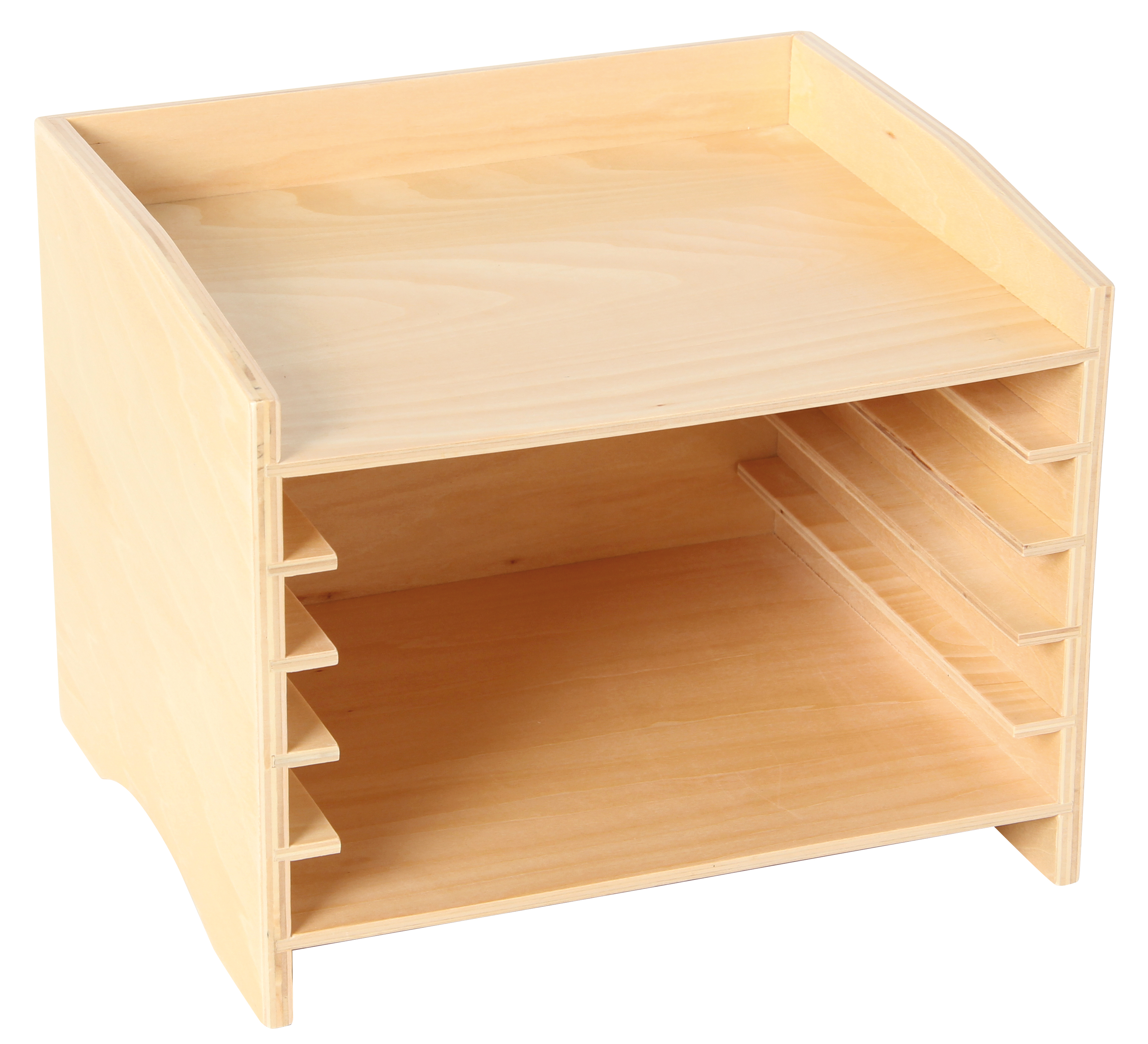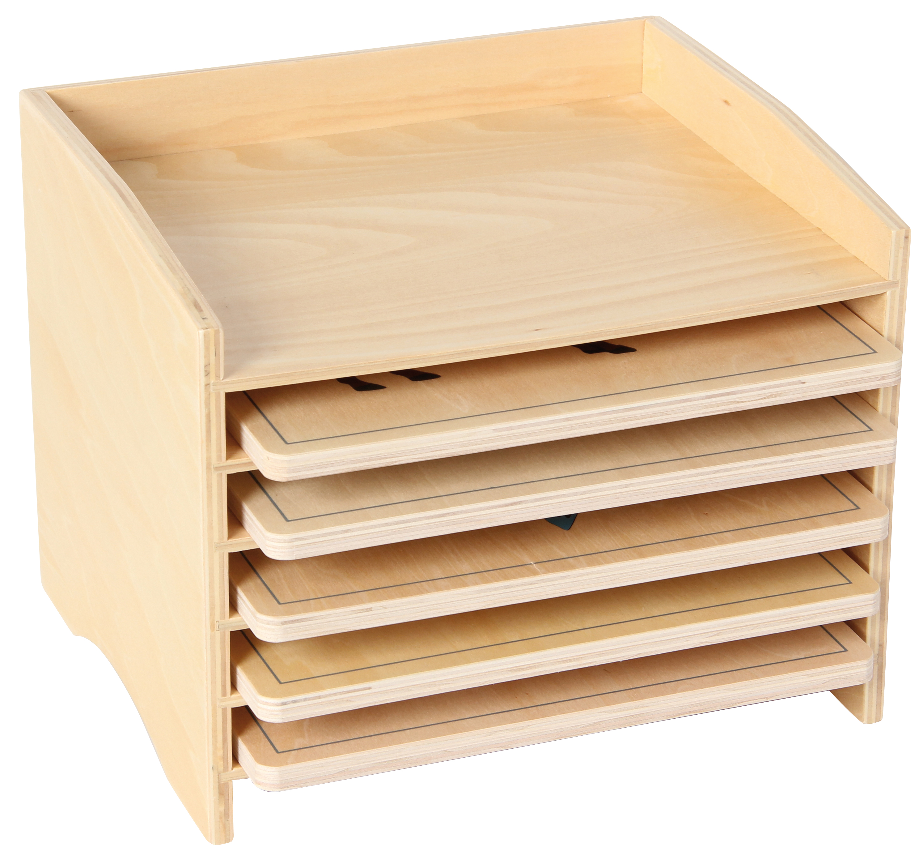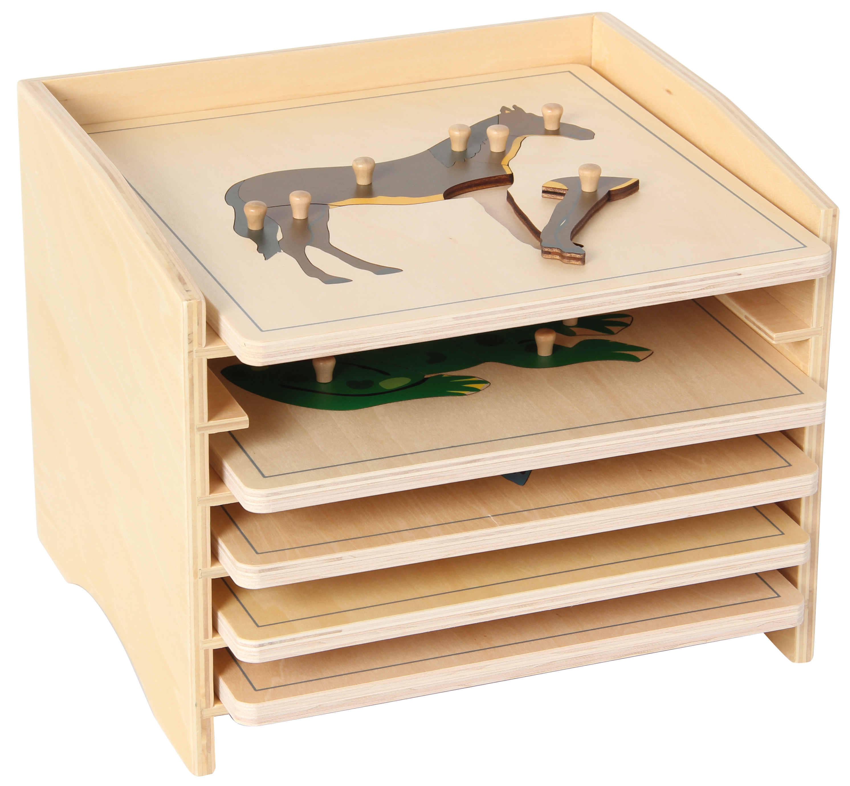 Holzregal mit fünf Fächern für die Tierpuzzles, Art.-Nr. 109716, 109717, 109718, 109719, 109720 oder 109721, Tierpuzzles, 5er-Set. Leer. Größe: 26,7 x 22 x 21 cm