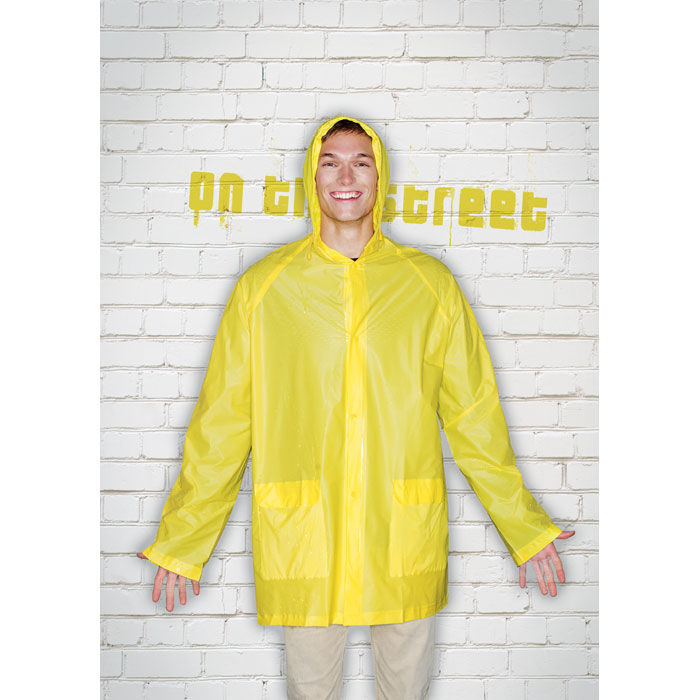 Regenjacke mit Kapuze. Mit Druckknöpfen. PVC.