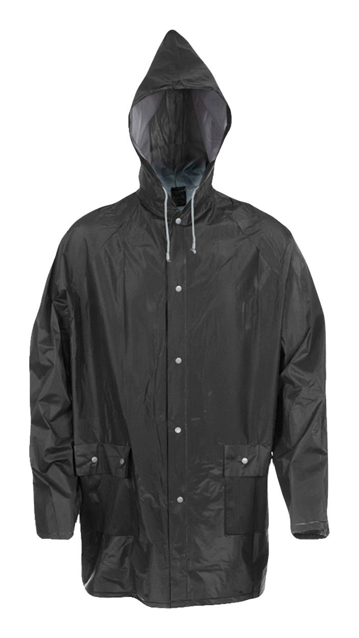 Regenjacke mit Kapuze aus widerstandsfähigem PVC mit versiegelter Oberflächenbeschichtung, Druckknopfverschluss und 2 Außentaschen.