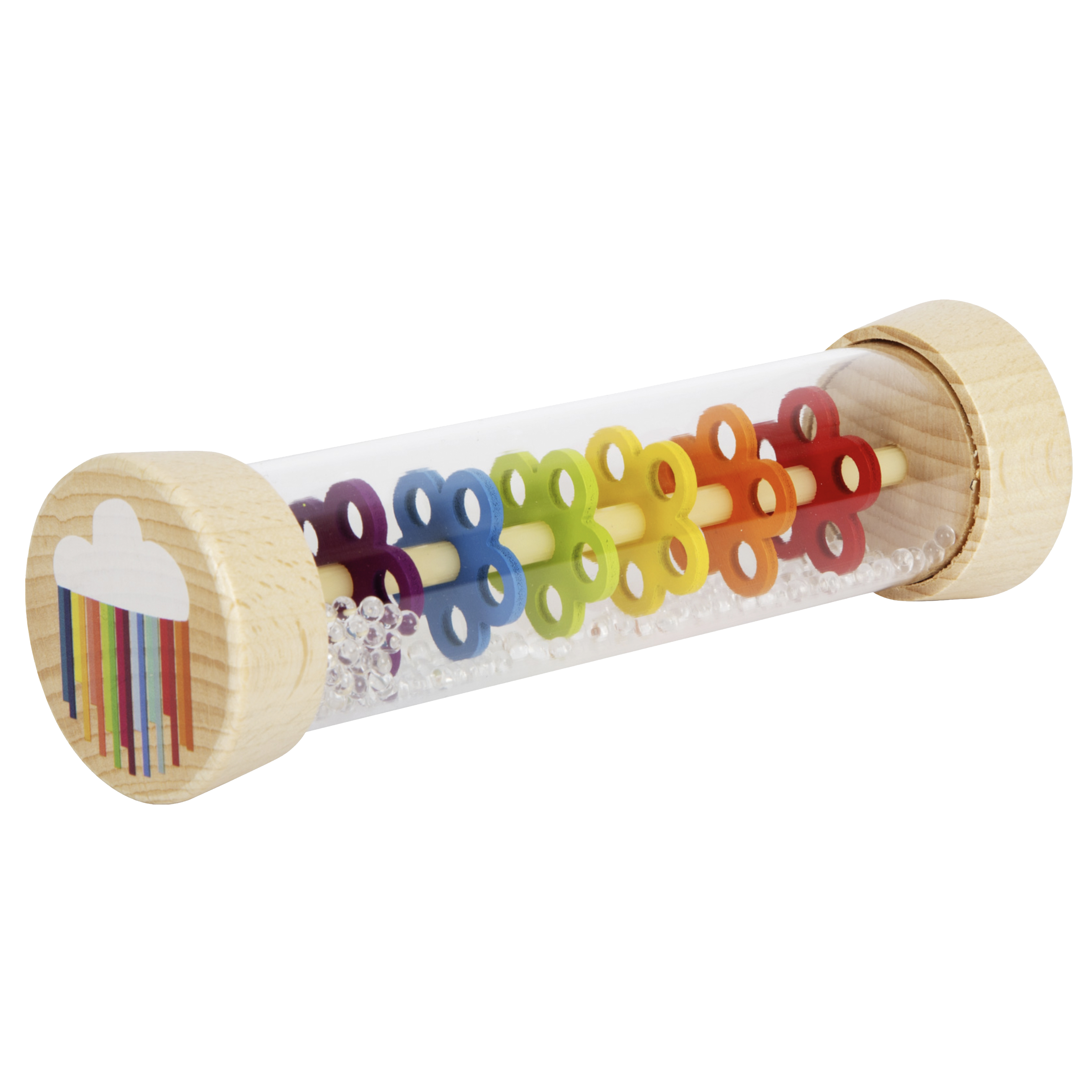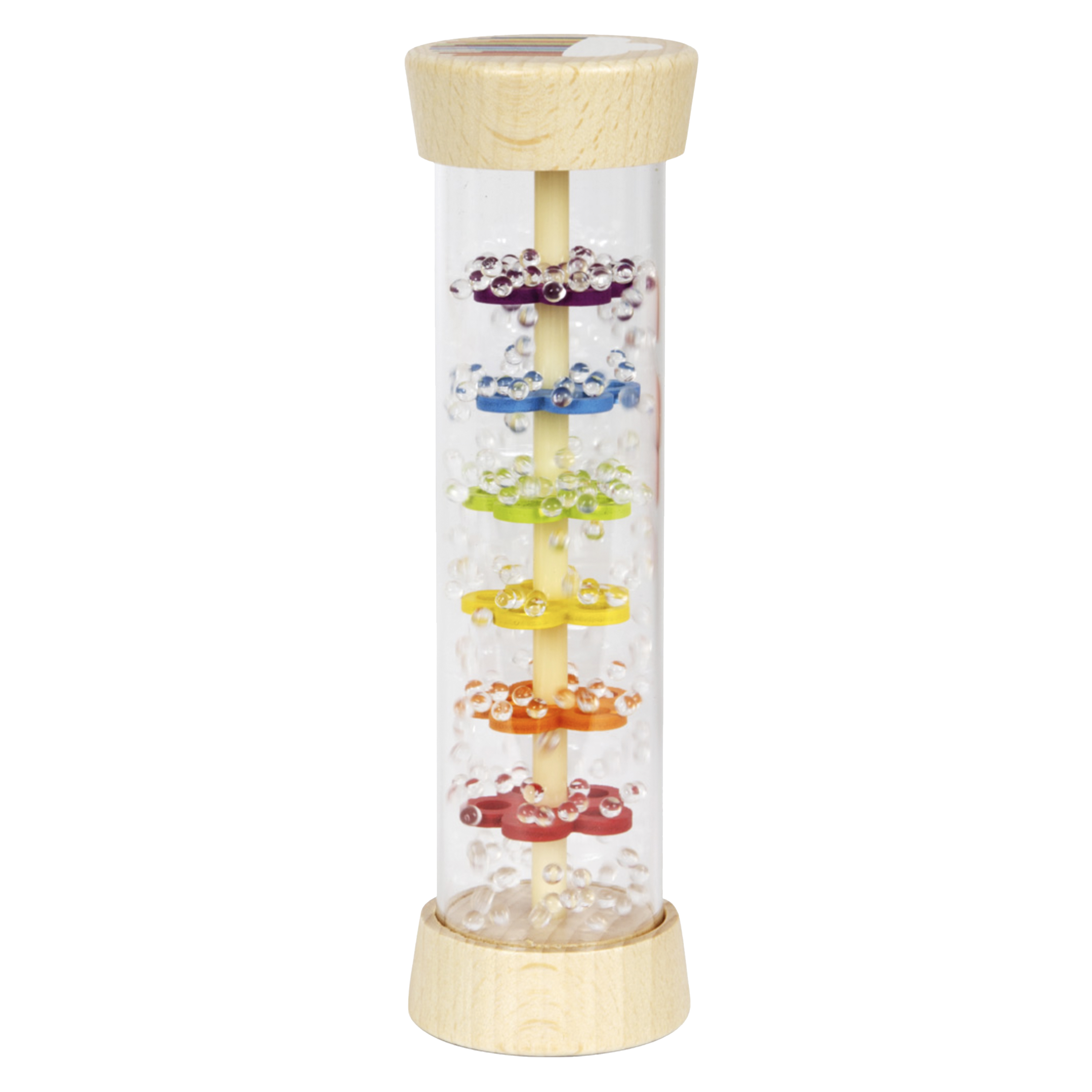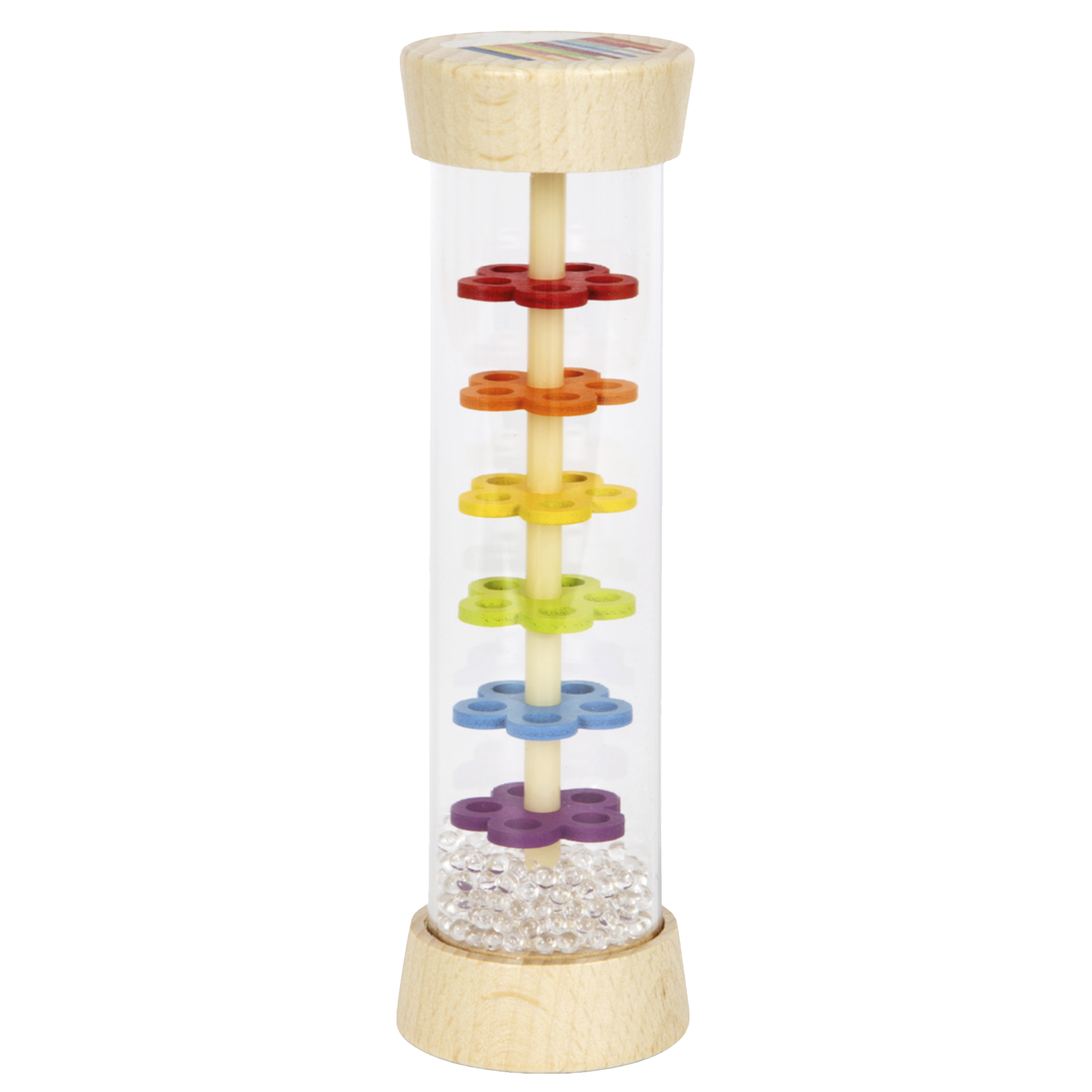 So klingt der Regen! Mit diesem Regenmacher lassen sich sanfte Regentöne imitieren. Vielseitig einsetzbar als Rassel, Rhythmusinstrument, Klangspielzeug oder beruhigendes Sinnesspiel zieht er nicht nur Kinder in seinen Bann. Der transparente Kunststoffkolben des Regenstabs gewährt freien Blick auf Kügelchen in Glasoptik, die durch die sechs farbigen Lochplatten in Blümchenform rieseln. So wird Akustik und visuelle Wahrnehmung geschult. Auch als Rassel und Spielzeug zum Rollen für Babys und Kleinkinder geeignet.